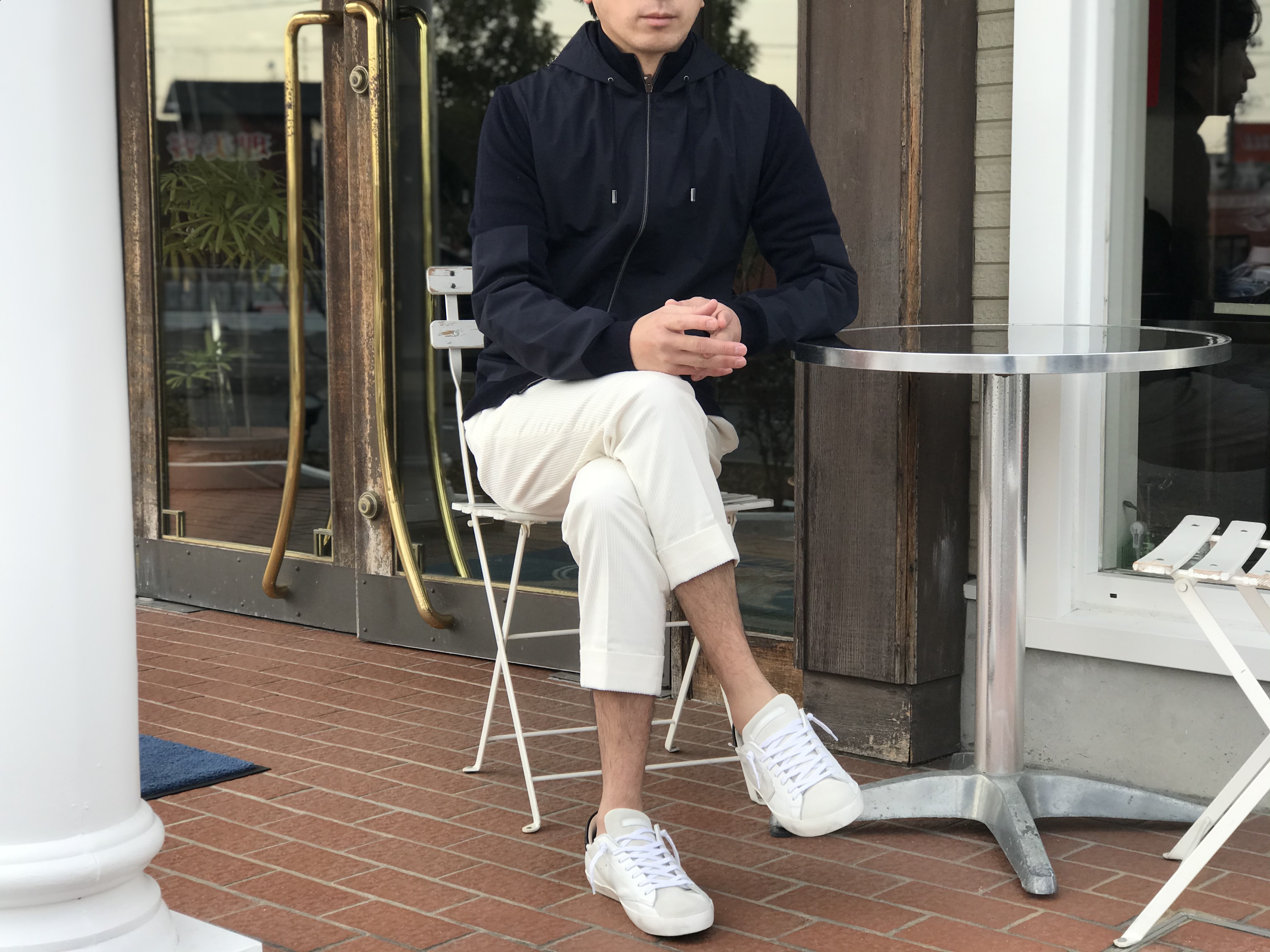 ネイビーは48サイズを着用。PT TORINOのCARROT FITを合わせてリラックスしたカフェスタイルです。