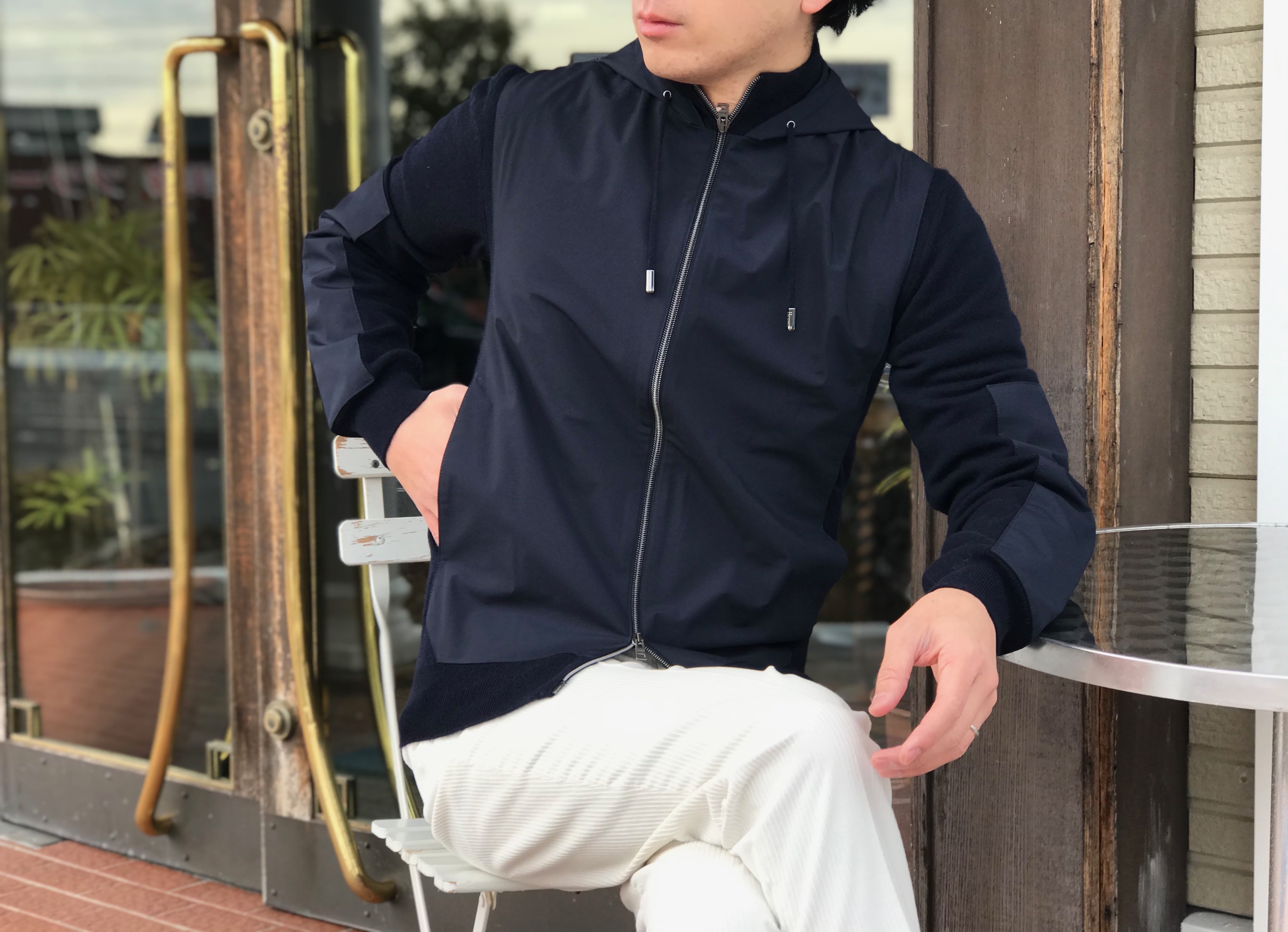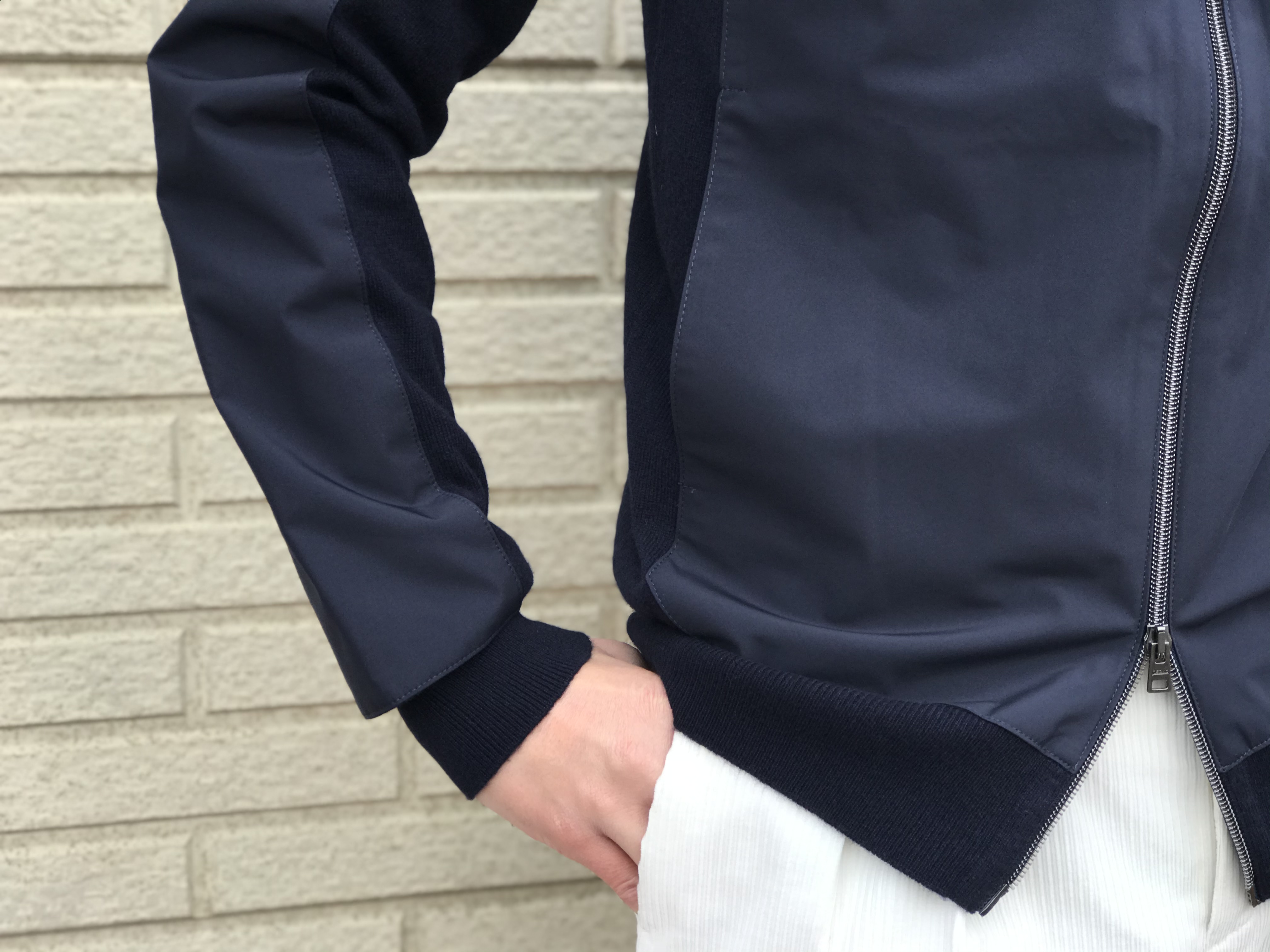 早速ご好評をいただいているのが、カシミアニットとラミネート加工されたポリエステルを掛け合わせたジップブルゾンです。