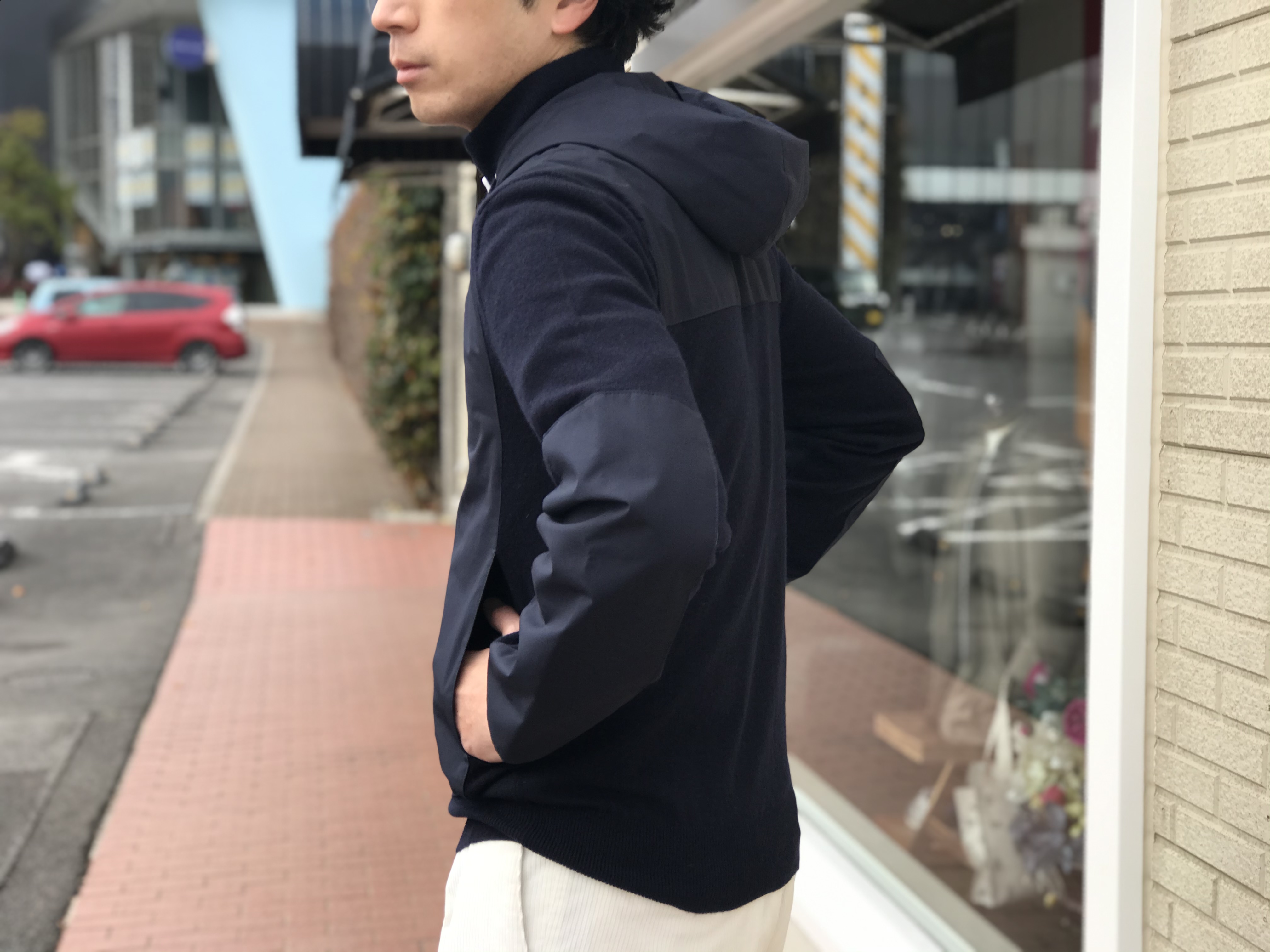 前身頃がポリエステル×ウールのラミネート加工がされた生地で、ポケットとフード部分はポリエステル生地。そして、袖と背部分はポリエステル×ウールのニット生地で組み合わされています。