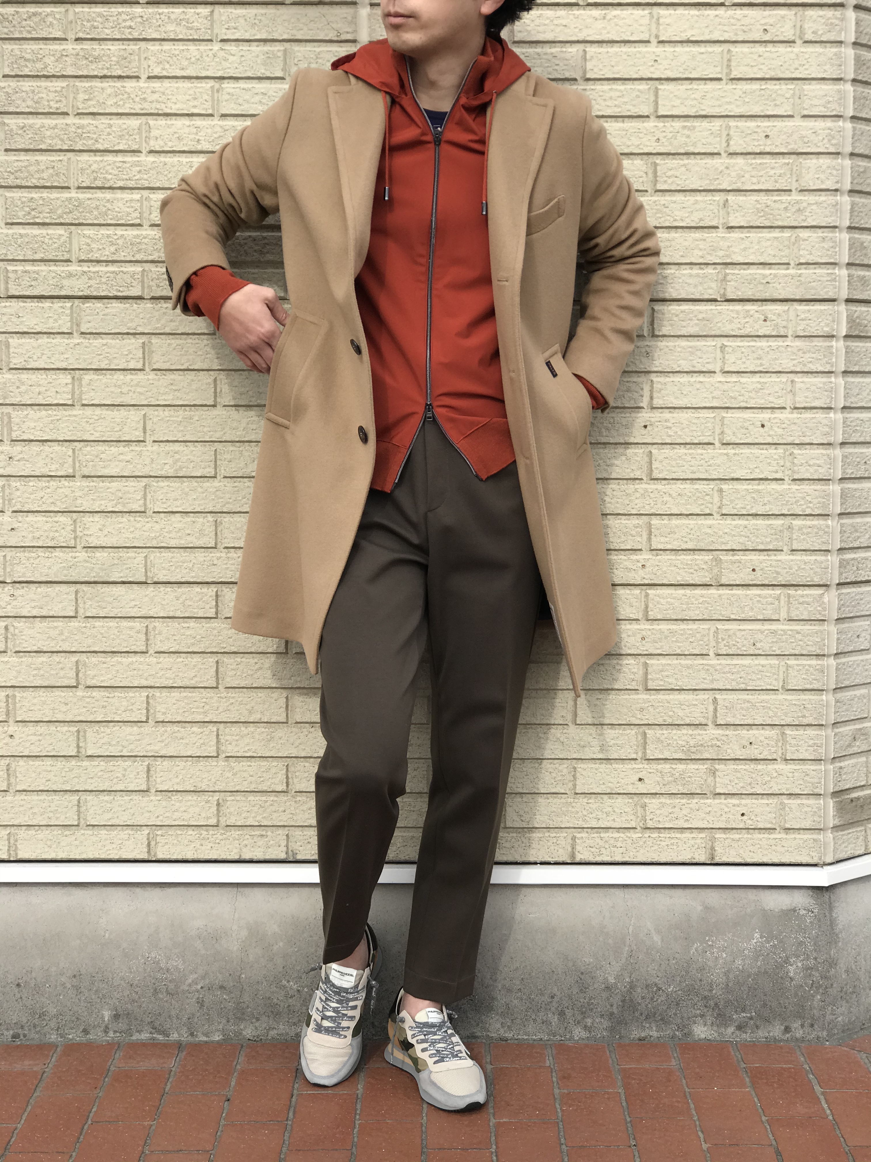オレンジは46サイズを着用。タイトなサイズ選びでチェスターコートのインナーに。