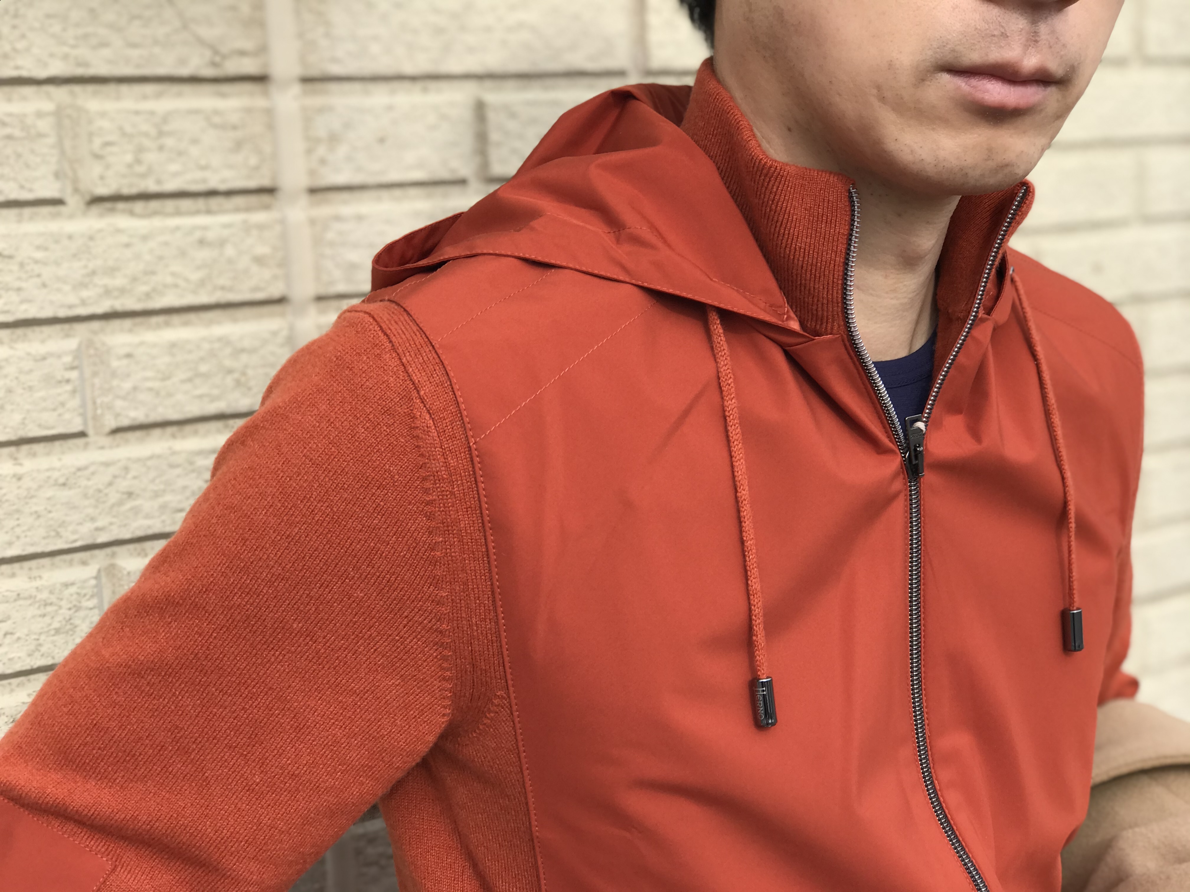 デザインのベースになるのは、スタンドカラーのジップニット。そこにフードを取り付け、前身頃、背ヨーク部分、肘をラミネート素材で切り替えています。