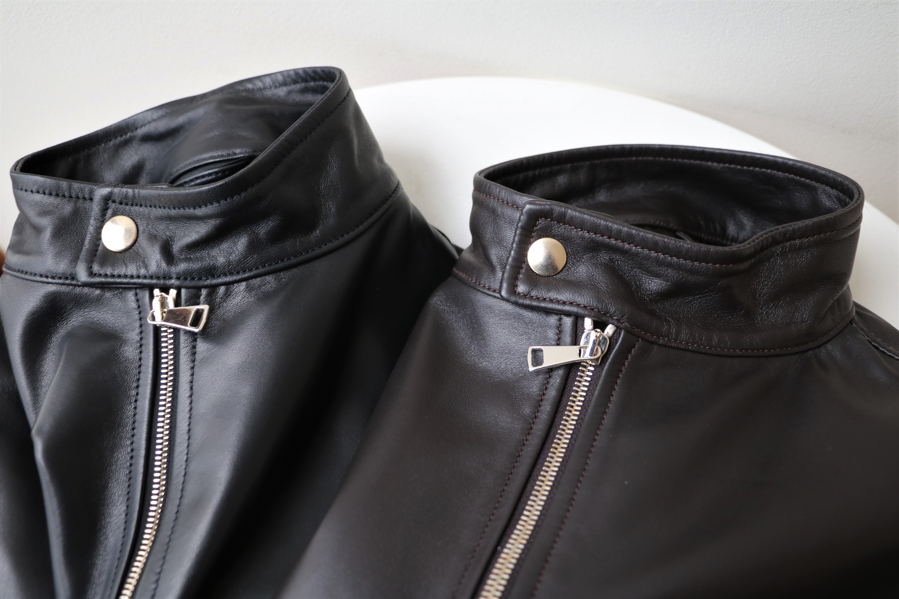 薄すぎず厚すぎずのレザーの厚みは、0.9ミリ。着始めから硬すぎることなく、着込むほどに体に馴染んでくる、バランスの取れた厚さが、0.9ミリなんです。セレクトカラーは、並べれれば色の違いが分かるほどのダークブラウンとブラック。堅い選択です。