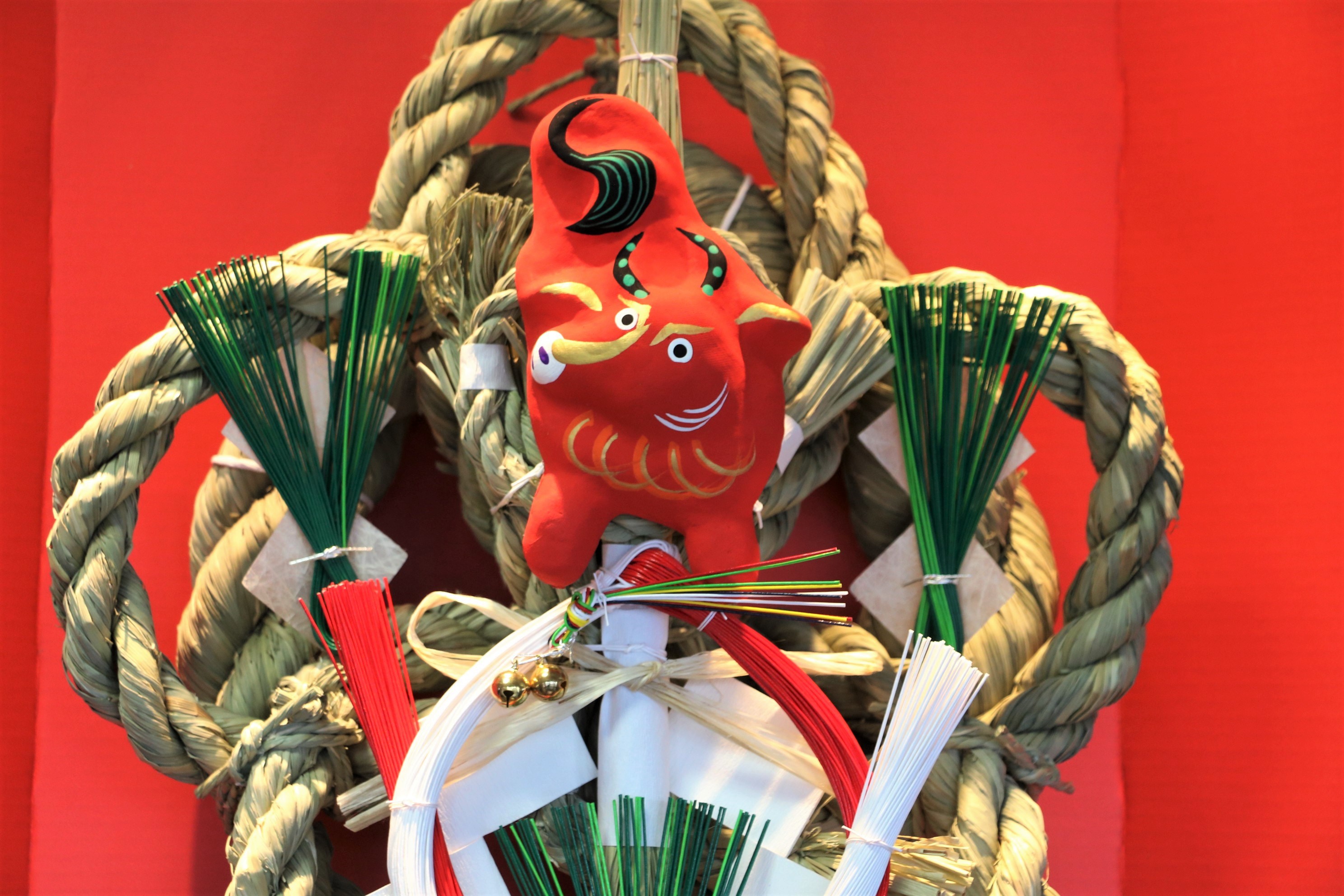 一年を守り、福を招く「干支」人形を中心に、水引や和紙などの日本伝統の材料や稲穂など自然の素材で手作りされている「えと縄」。これから春夏秋冬と一年間、この場所に飾られます。