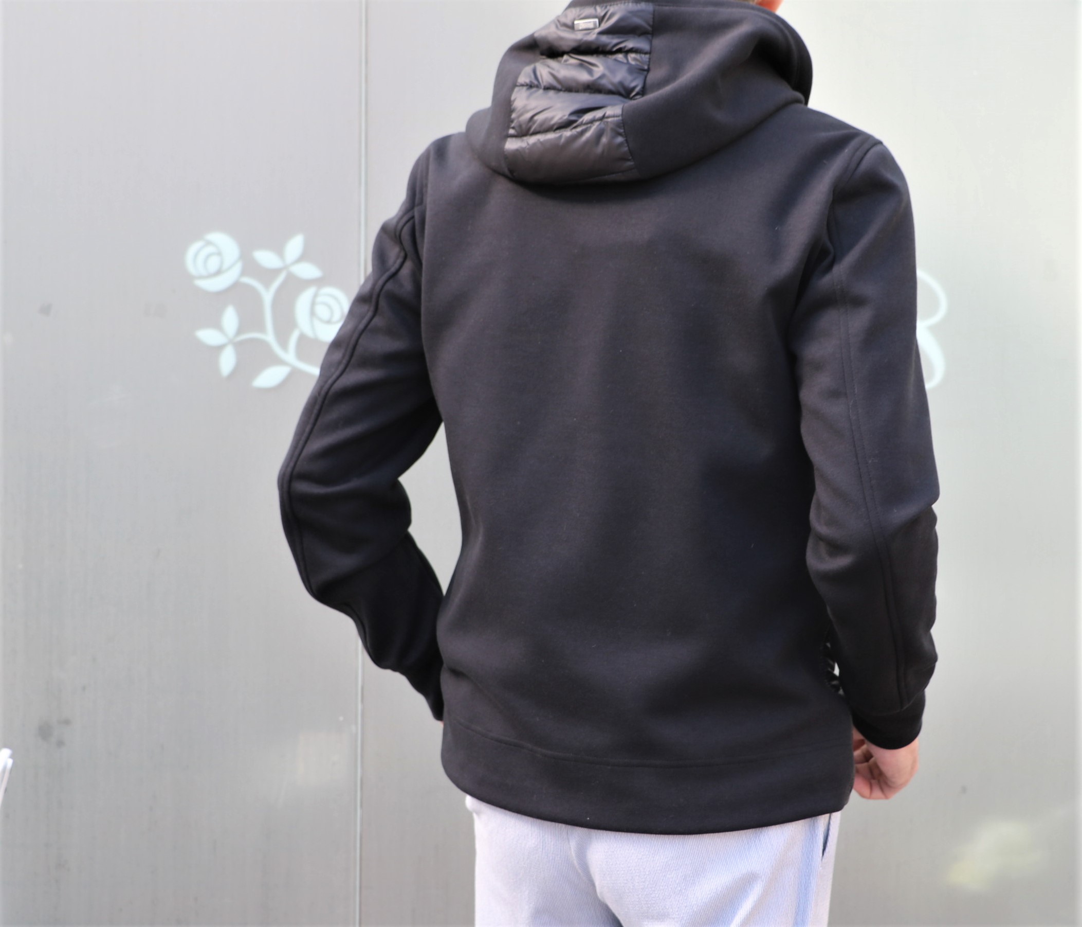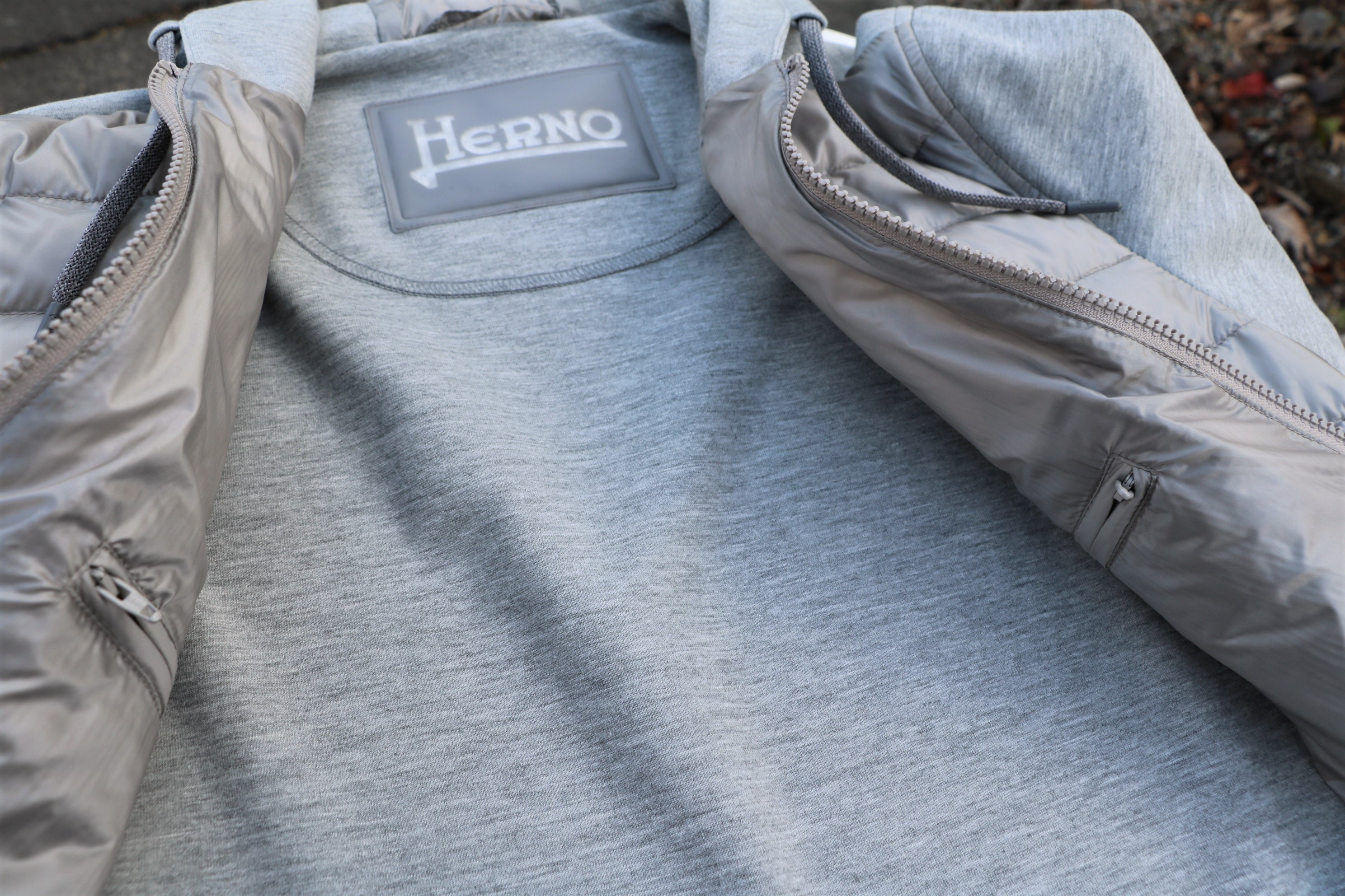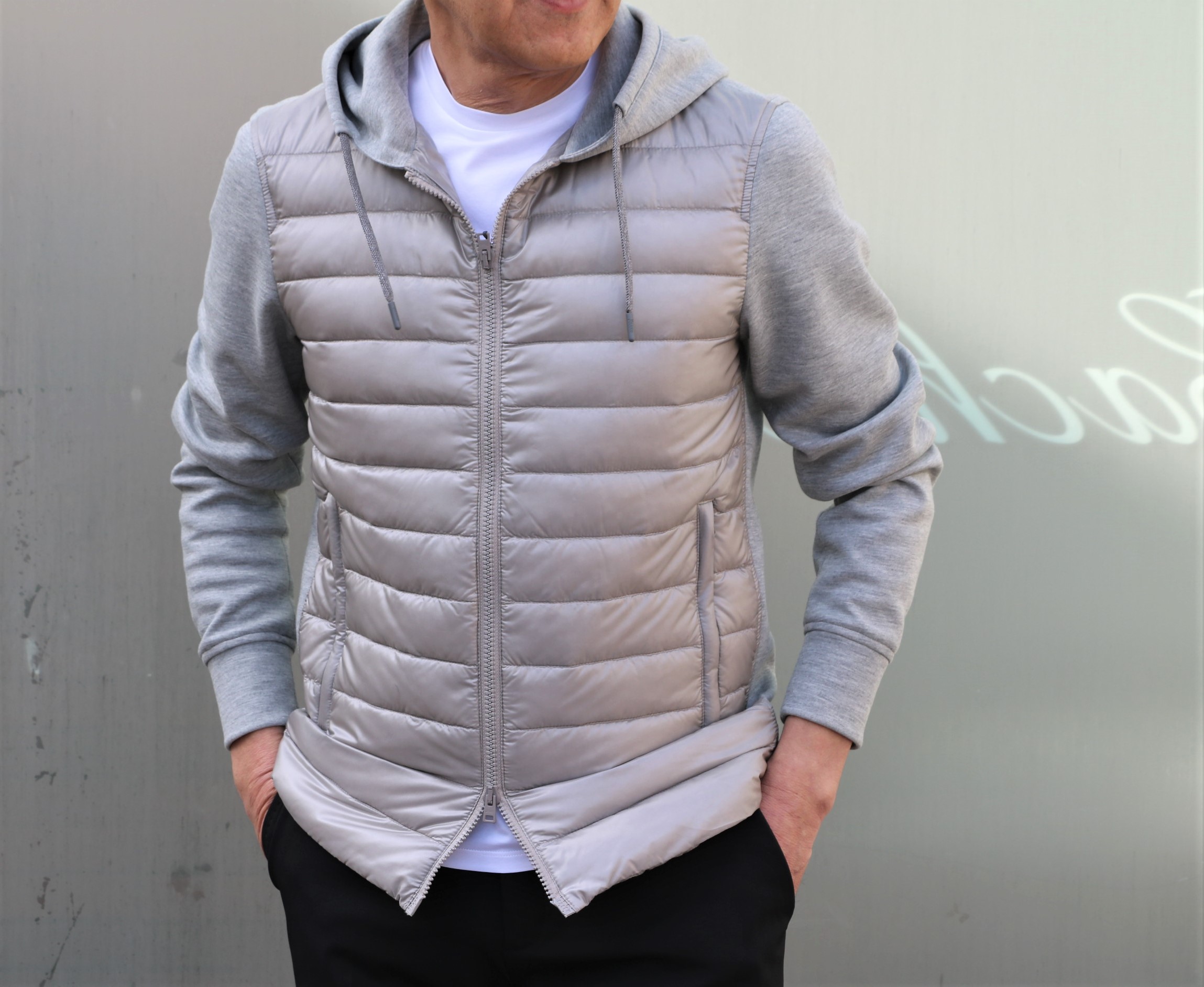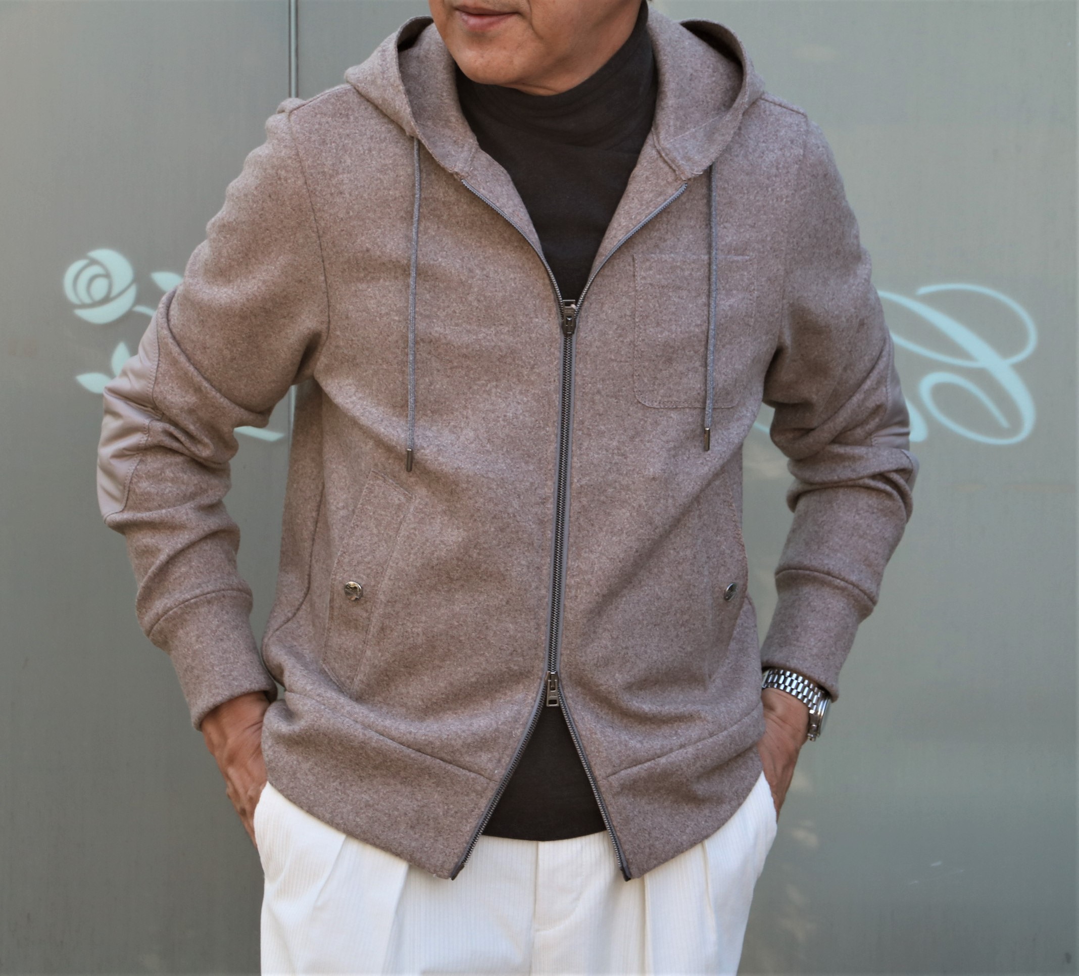 厚手のウールソックスとタートルネックのニットを躊躇いながら、いや颯爽と脱ぎ捨て、Tシャツ一枚に羽織ったのは、【HERNO/ヘルノ】の新作パーカーブルゾン。