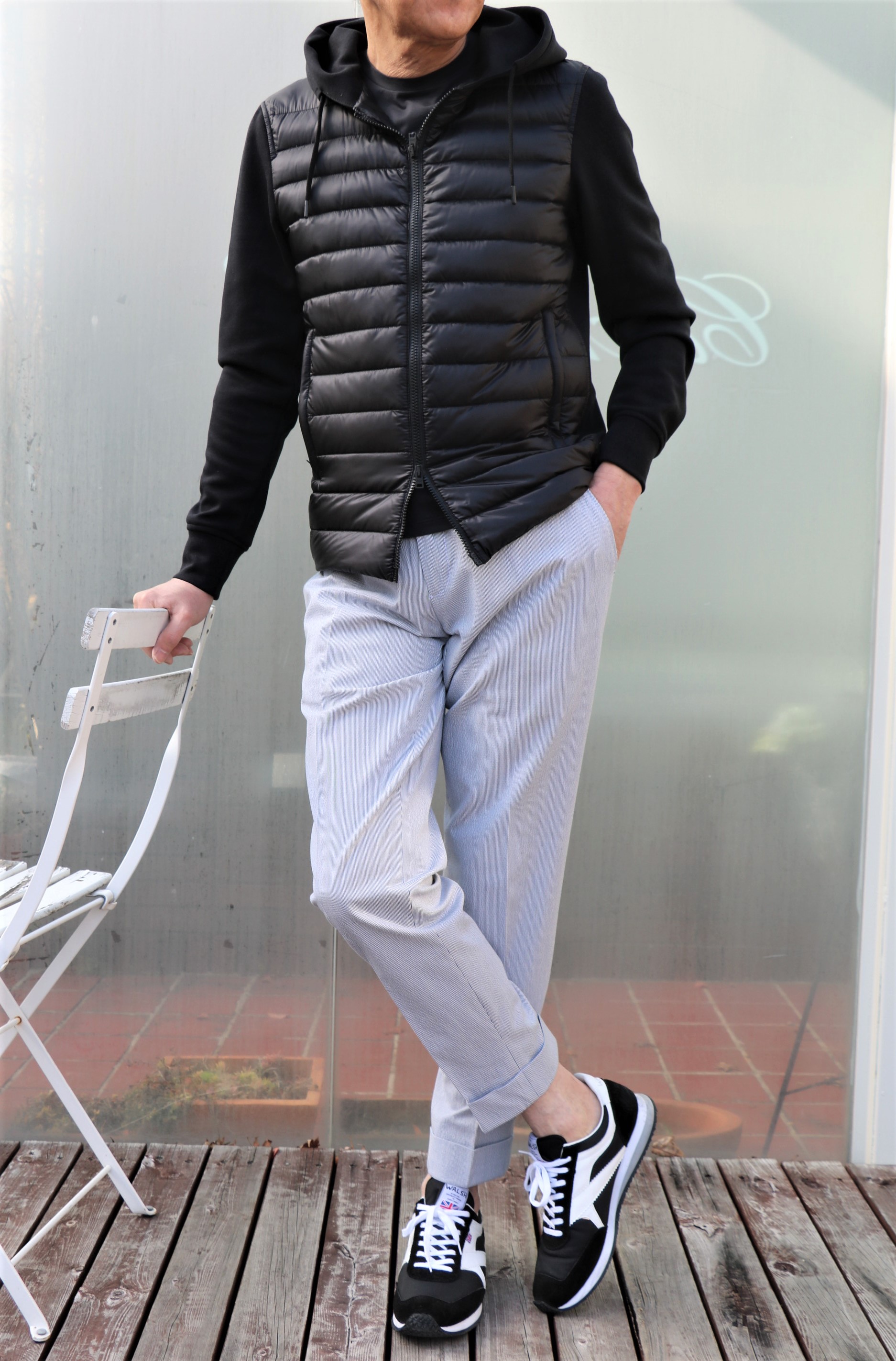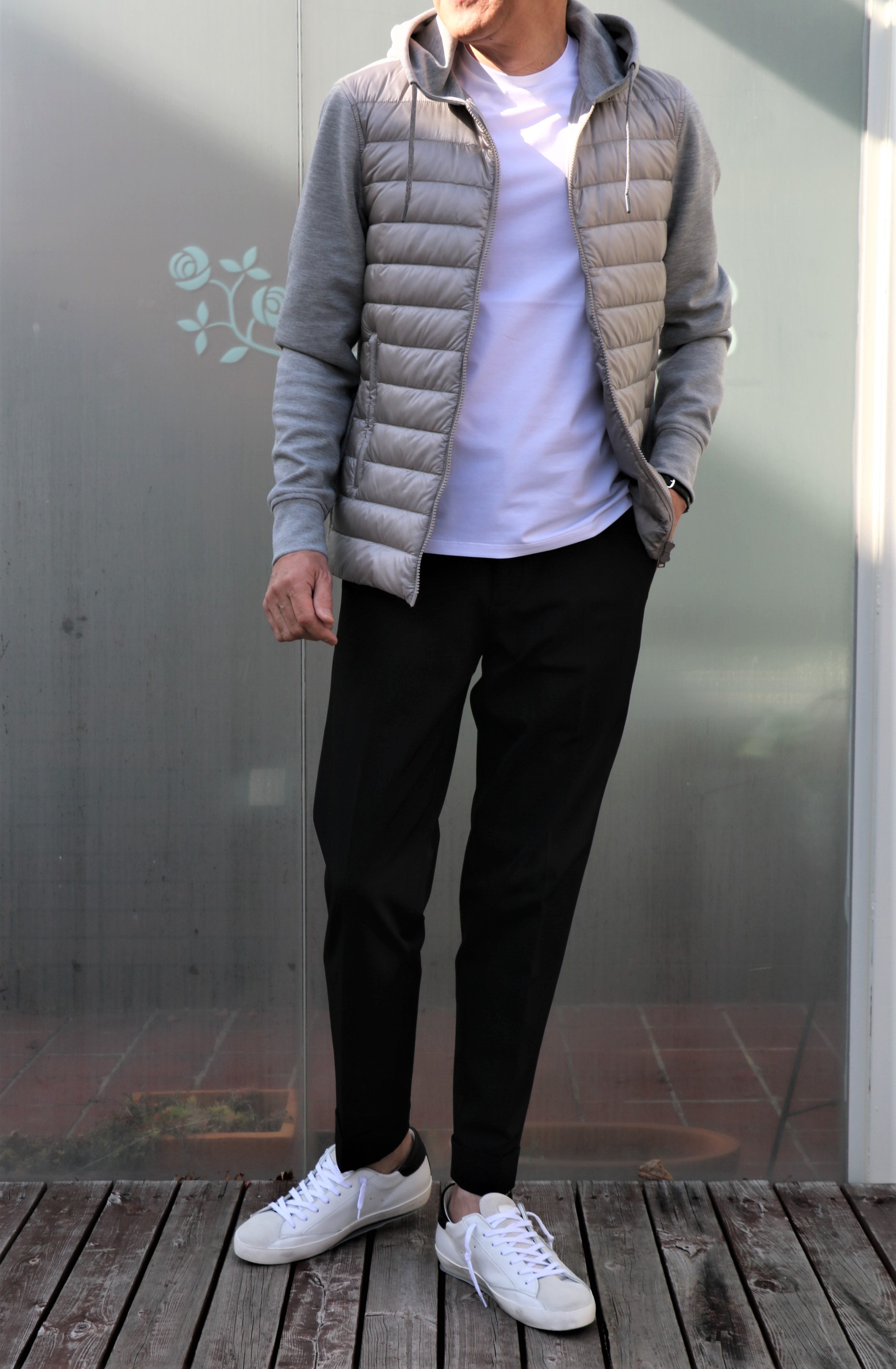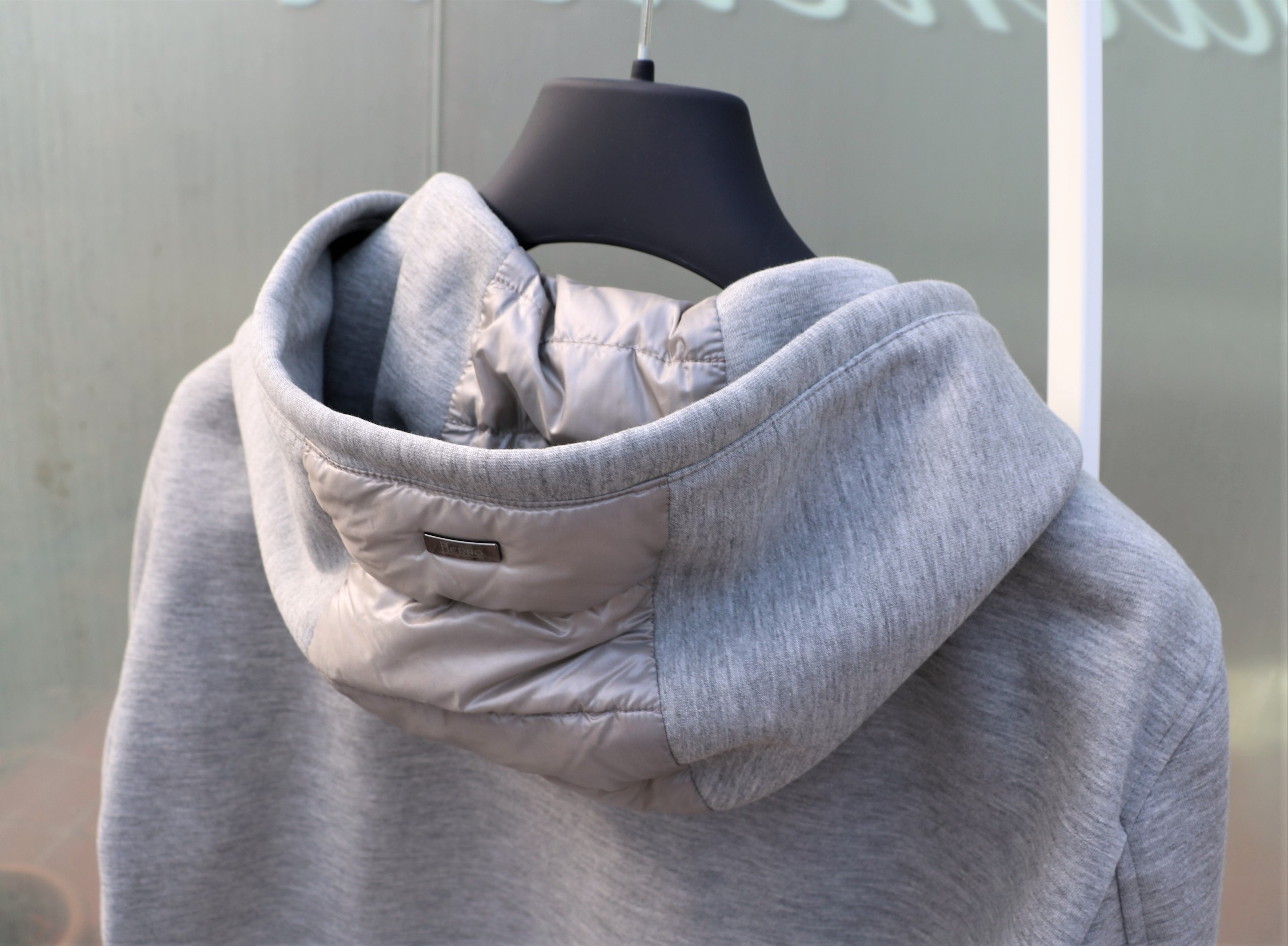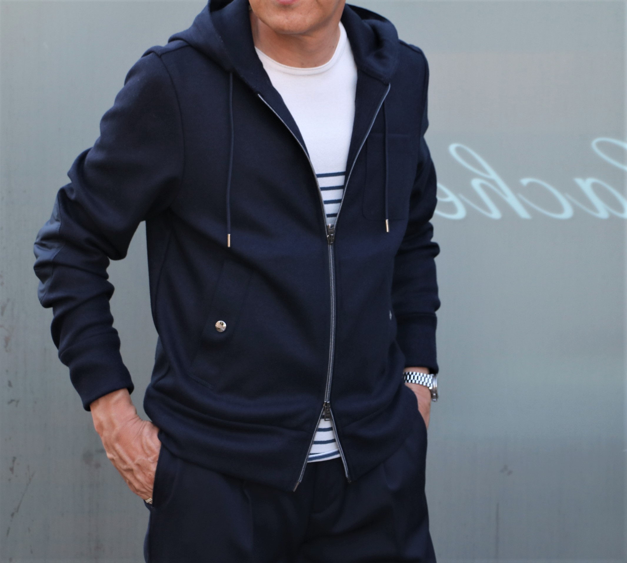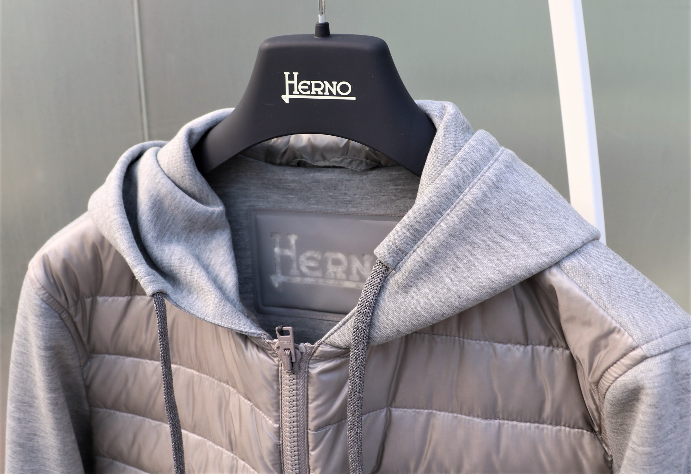 厚手のウールソックスとタートルネックのニットを躊躇いながら、いや颯爽と脱ぎ捨て、Tシャツ一枚に羽織ったのは、【HERNO/ヘルノ】の新作パーカーブルゾン。