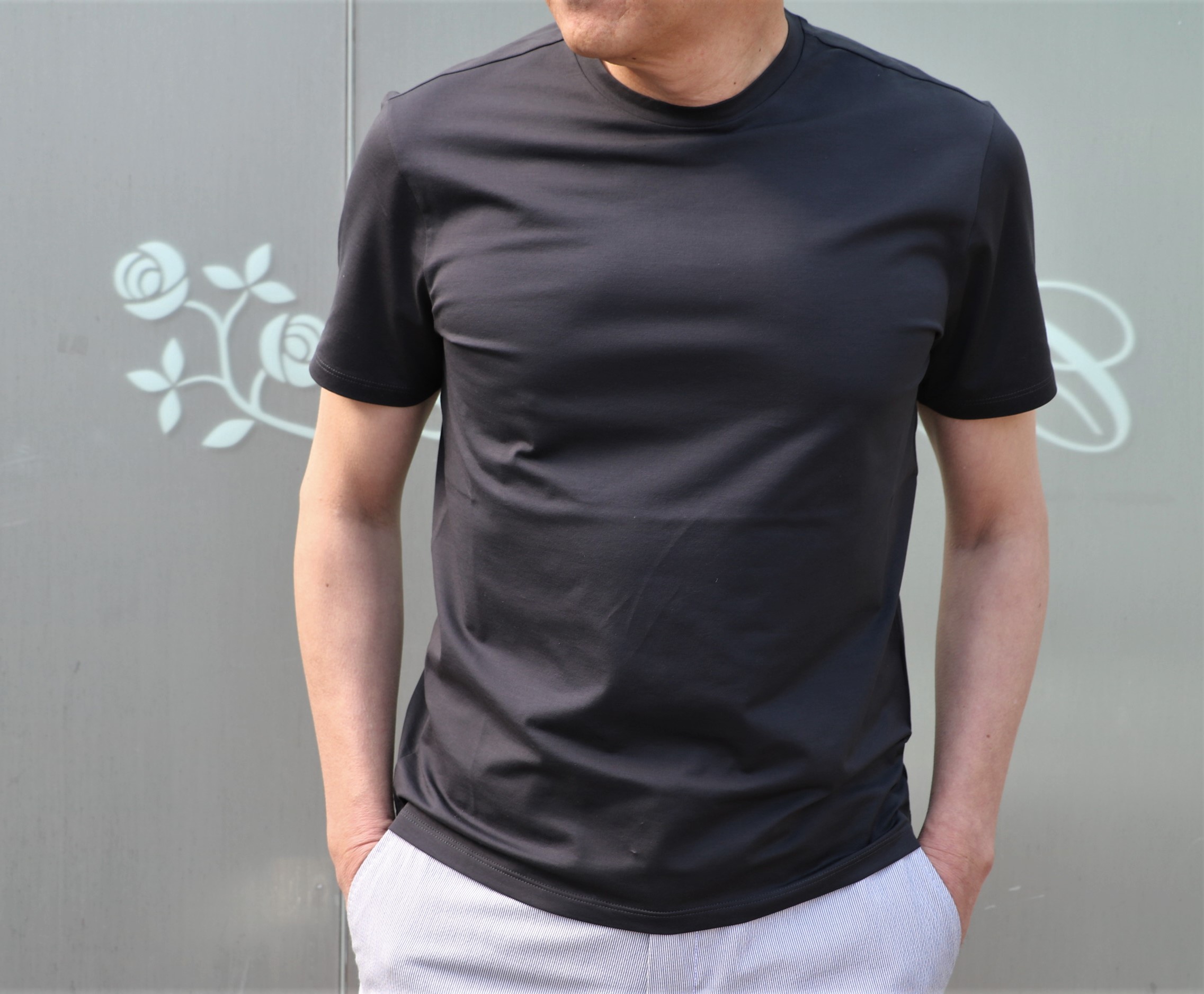 遂に登場のTシャツですが、タダ者ではありません。極細糸を使用したストレッチジャージ素材。高密度で編みこまれているため、上品な光沢と心地よい肌触りに出会うはずです。特筆すべきは、長時間着ていてもサラリとした着心地を維持できること。ホワイトとダークグレイの2色をセレクトしました。