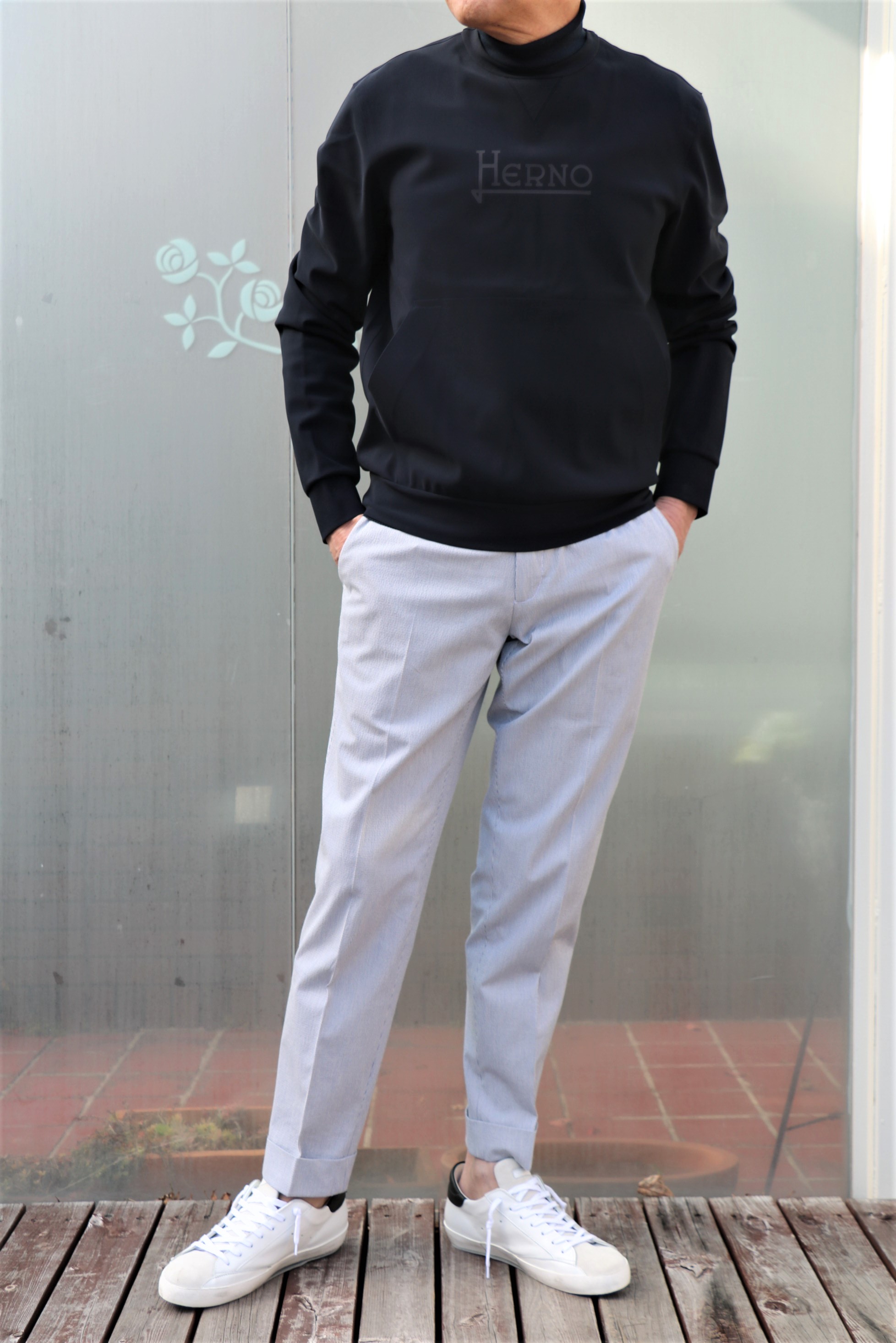 昨日、ご案内させていただいた【HERNO/ヘルノ】の「ナイロン×スウェット パーカーブルゾン」のインに着ていたのが...その前に追記したいのが、「GORE-TEX バックバック」。コーディネートで用意していたのに、背負うことを忘れてしまいました。ご注目ください。