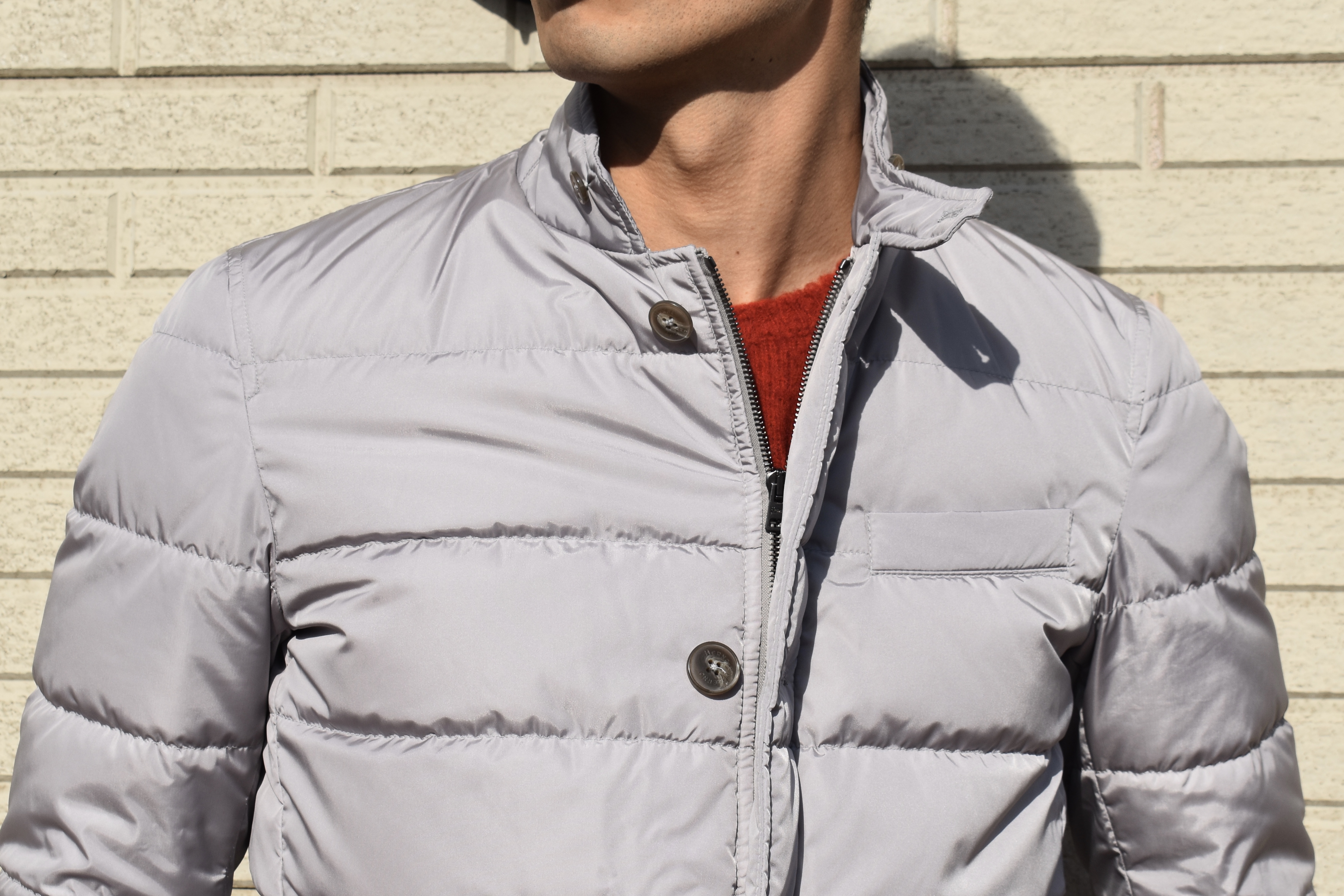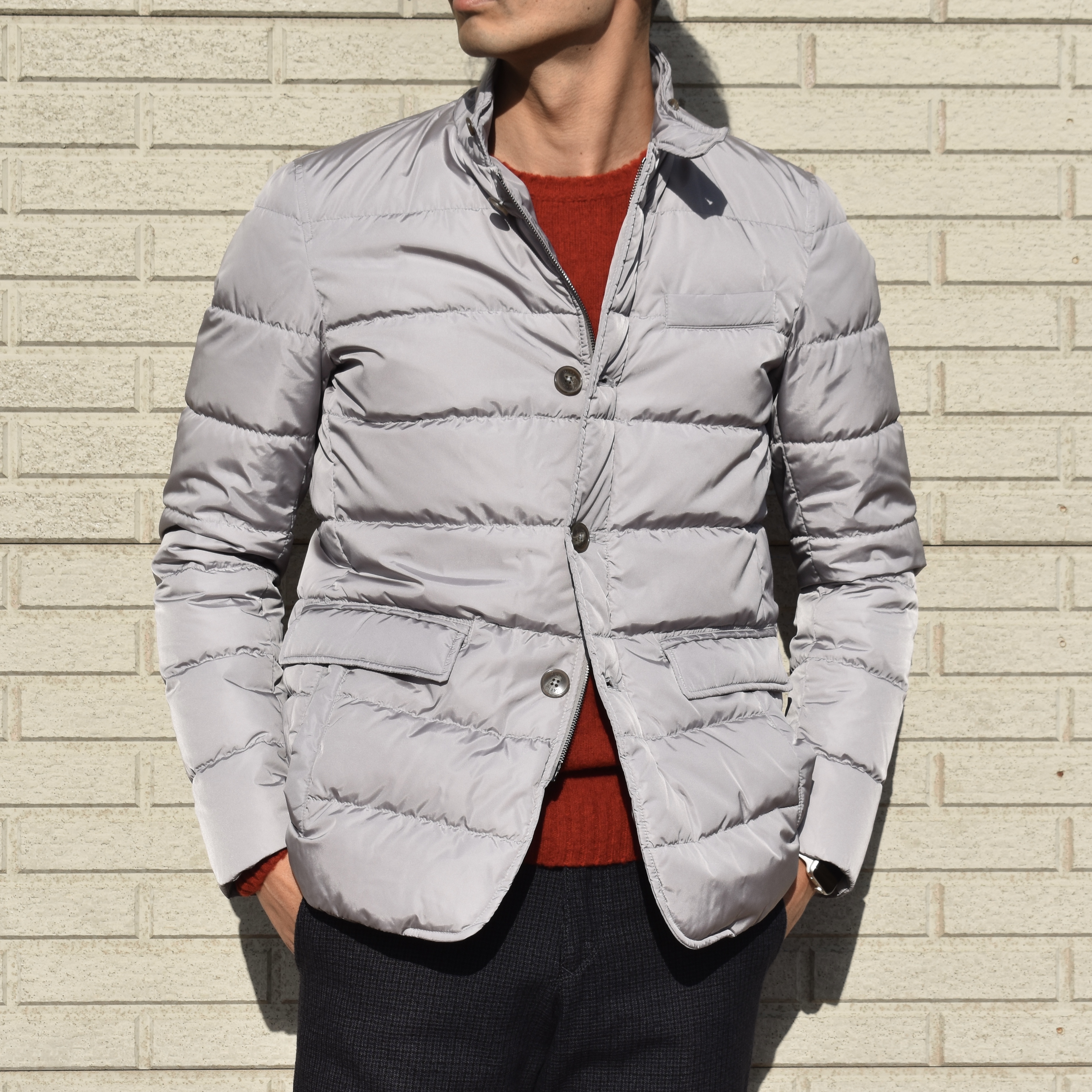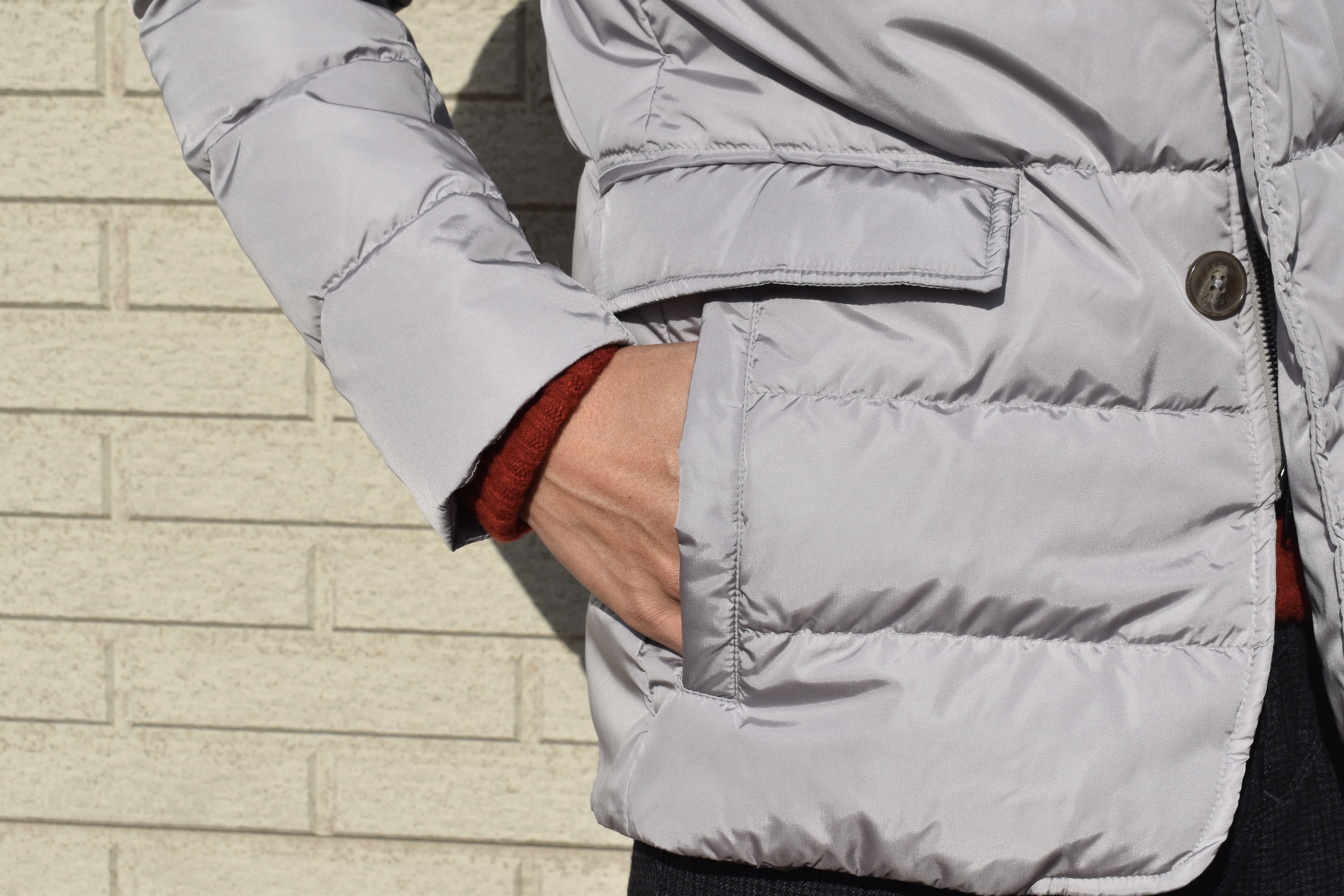 最後に魅力的な選択肢となりそうなのは、ジャケット型のダウンブルゾン。今季我々でご用意していたヘルノのジャケット型ブルゾンは、既に在庫切れ。ジャケットとして、ブルゾンとして、多目的に活躍するアイテムだけに、今回1型ご用意出来たのは幸運です。薄めのミントグレイの色味も、春先までの着用を見込む上でも好材料でしょう。ZANONEのシェットランド風ニットで色を指し、PT TORINOのガンクラブチェックパンツと合わせました。
