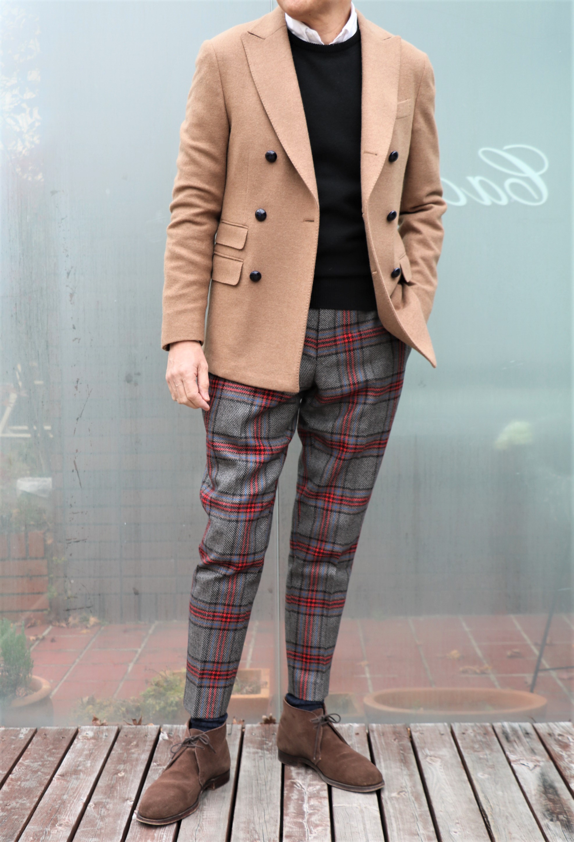 本日の出で立ち...最近出番の多いWILLIAM LOCKIE/ウィリアムロッキーのセーター。羽織ったのは、THE GIGI(ザ ジジ)のダブルのジャケット「MIRO」。チェック柄に入っているキャメルを拾って合わせています。特報です。先ほどTHE GIGI(ザ ジジ)の商品を大幅に値下げしました。大好きなジジのコレクションでしたが、取り扱い終了の為、大放出です。サイズ46を着用。