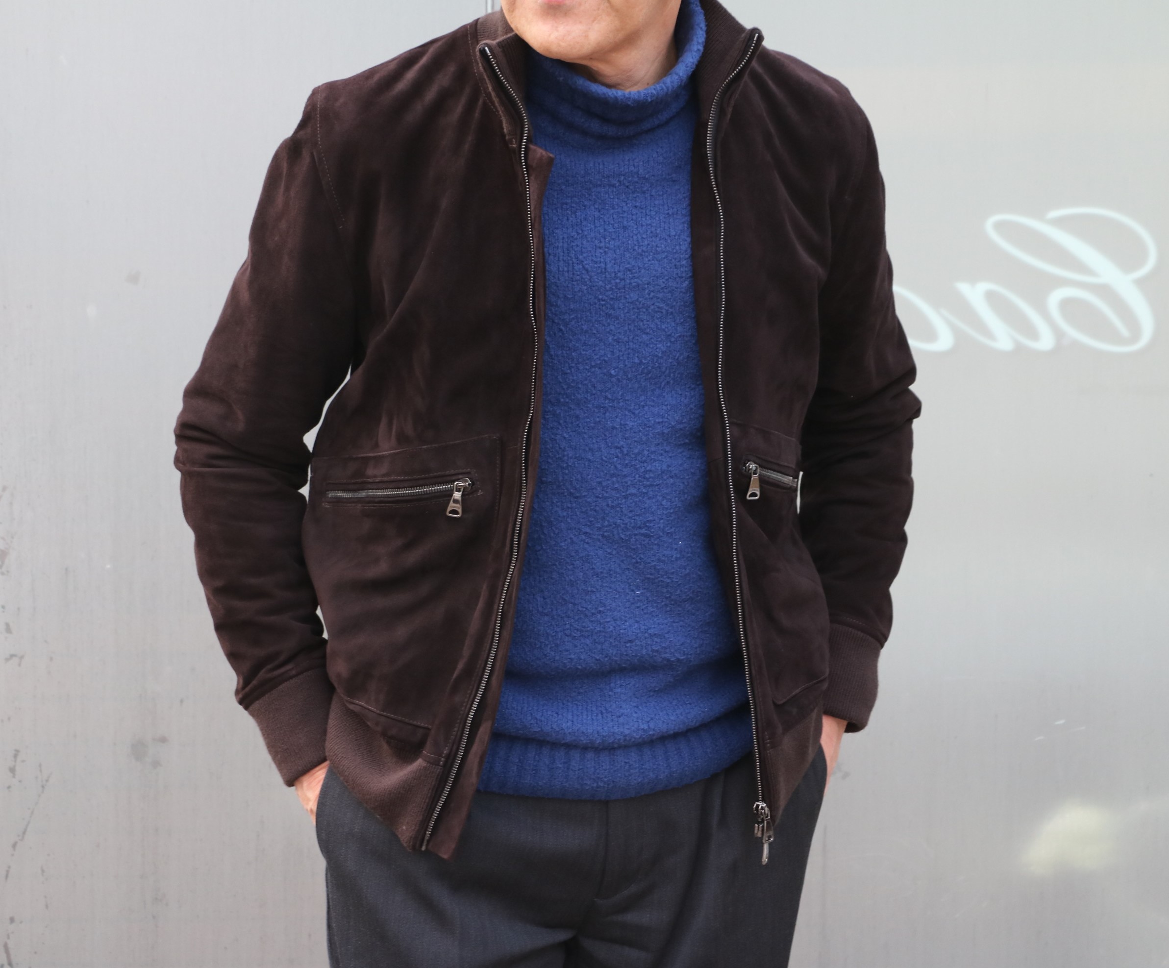 本日のチャームポイントは、コバルトブルーのニット。一昨年、購入したPHILL PETTER(フィルペター)のもので、現在、在庫はありませんが、次の展示会に出てくればオーダーしたい色目です。やや強めの明るい青と相性が良いのが、ブラウンなんです。そうなると羽織りたくなるのが、【EMMETI/エンメティ】のスウェードブルゾン。セール対象になりますので、ご注目ください。パンツは、デスクワークの多い私は楽チンであり、きちんとして見えるBorelio(ボレリオ)の「DANNON」ベネシャンウール。出番が多いだけに、同じモデル,ブラウン×ブラックのグレンチェック柄も購入したいぐらいです。
