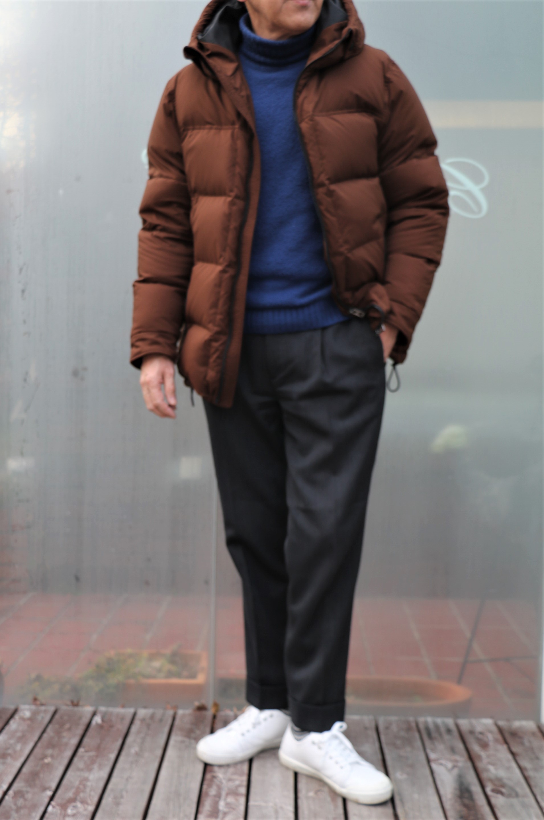 ヘルノやムーレーなどダウンはいくつもあるからと思いながらも気になるのが、【AHIRAIN/アーリーン】の「SPORT HOODIE JACKET」。ウルトラソフトナイロンと謳っているように、とにかく軽い。さらに今まで扱ってきたダウンブランドにはないビッグシルエットの気楽さに、ついつい心が動かされてしまいます。2016年にトスカーナの若き企業家たちが、イタリア服飾業界に革新的な提案を、というアイデアから生まれた異色のブランドで、未来形ダウンと私は呼んでおります。