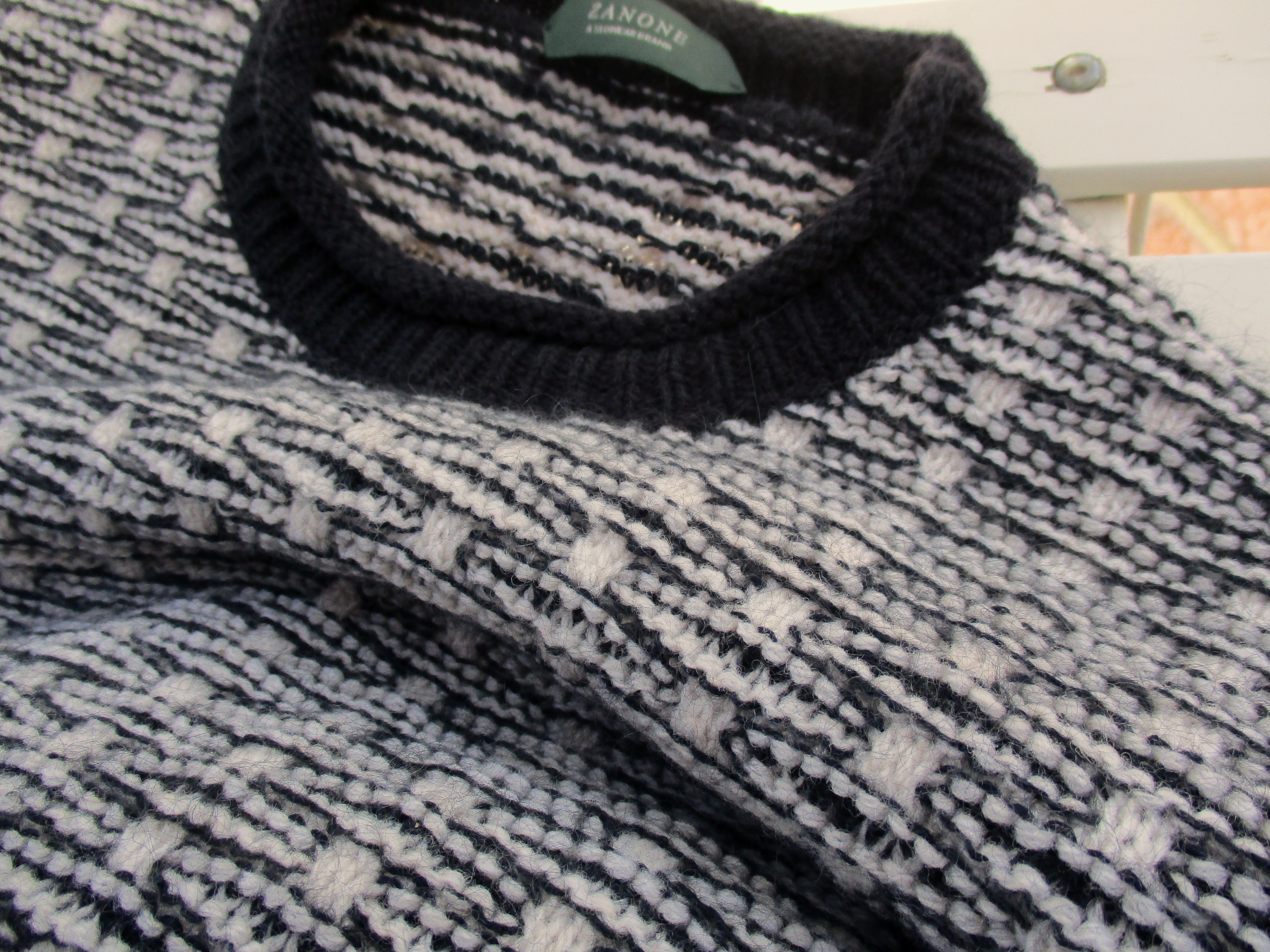 合わせたニットはZANONE(ザノーネ)のラテ×ネイビーの編み柄。ロールアップの襟元が特徴です。