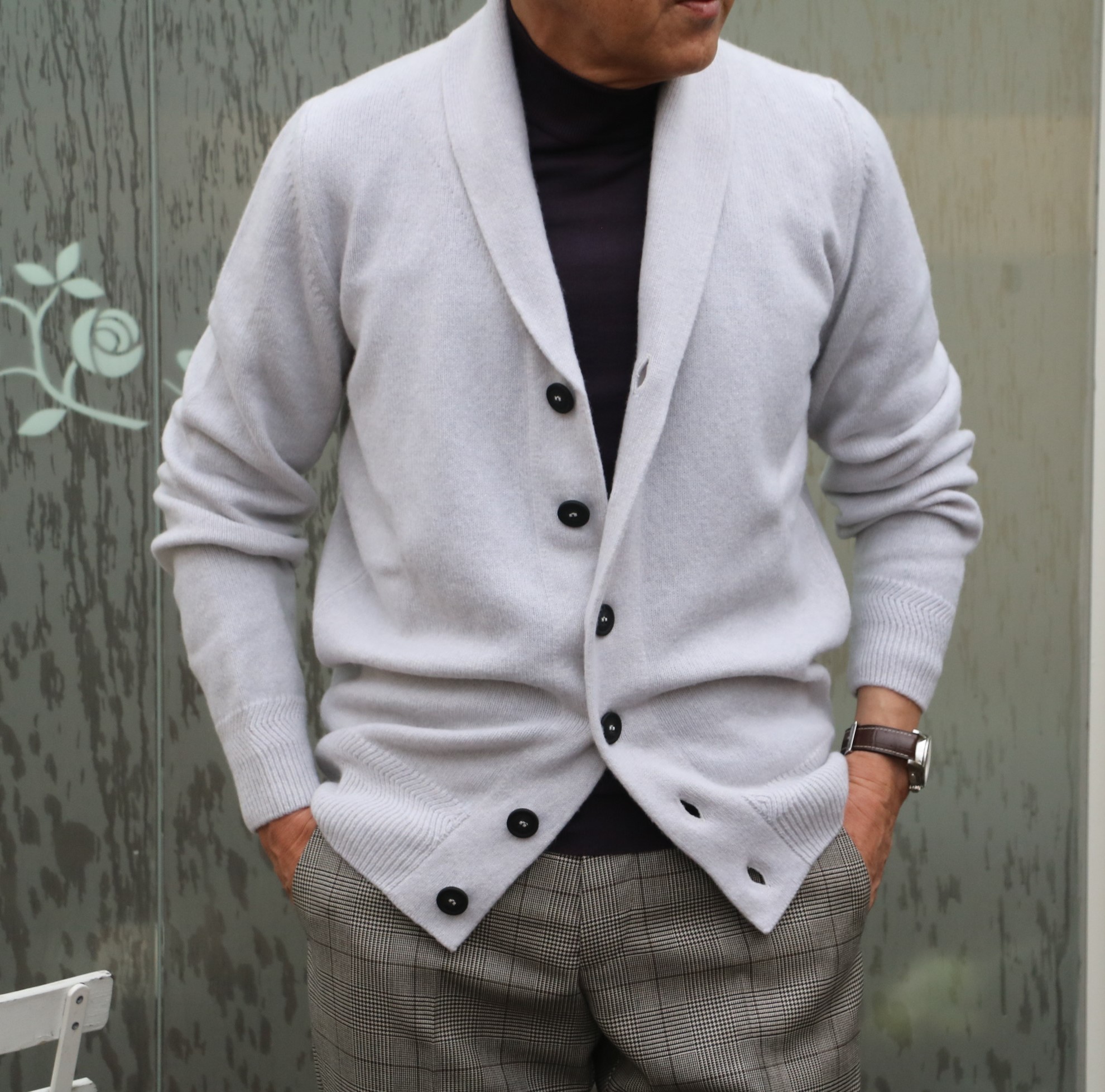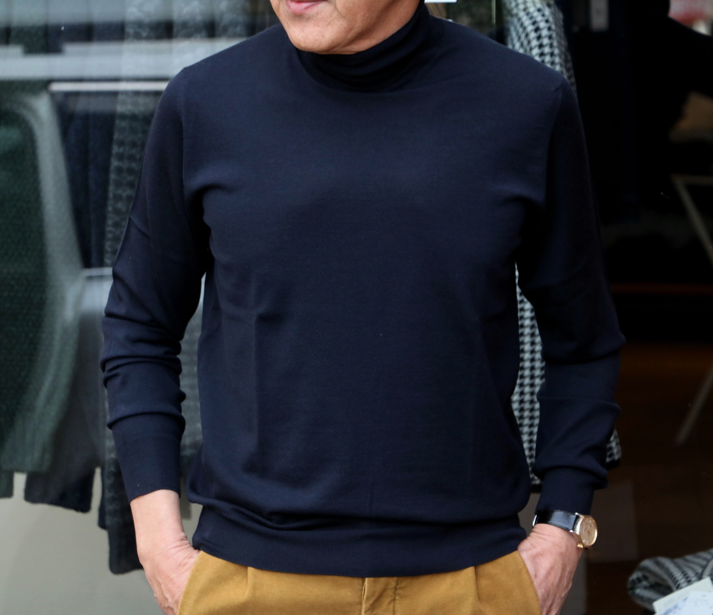 私のお気に入りのコーディネートが、こちら。合わせたモックネックもJOHN SMEDLEY(ジョン スメドレー)。ただ、こちらは残念ながら完売です。今年の秋にご期待ください。歳の差、37歳。20代と60代の競演?です。