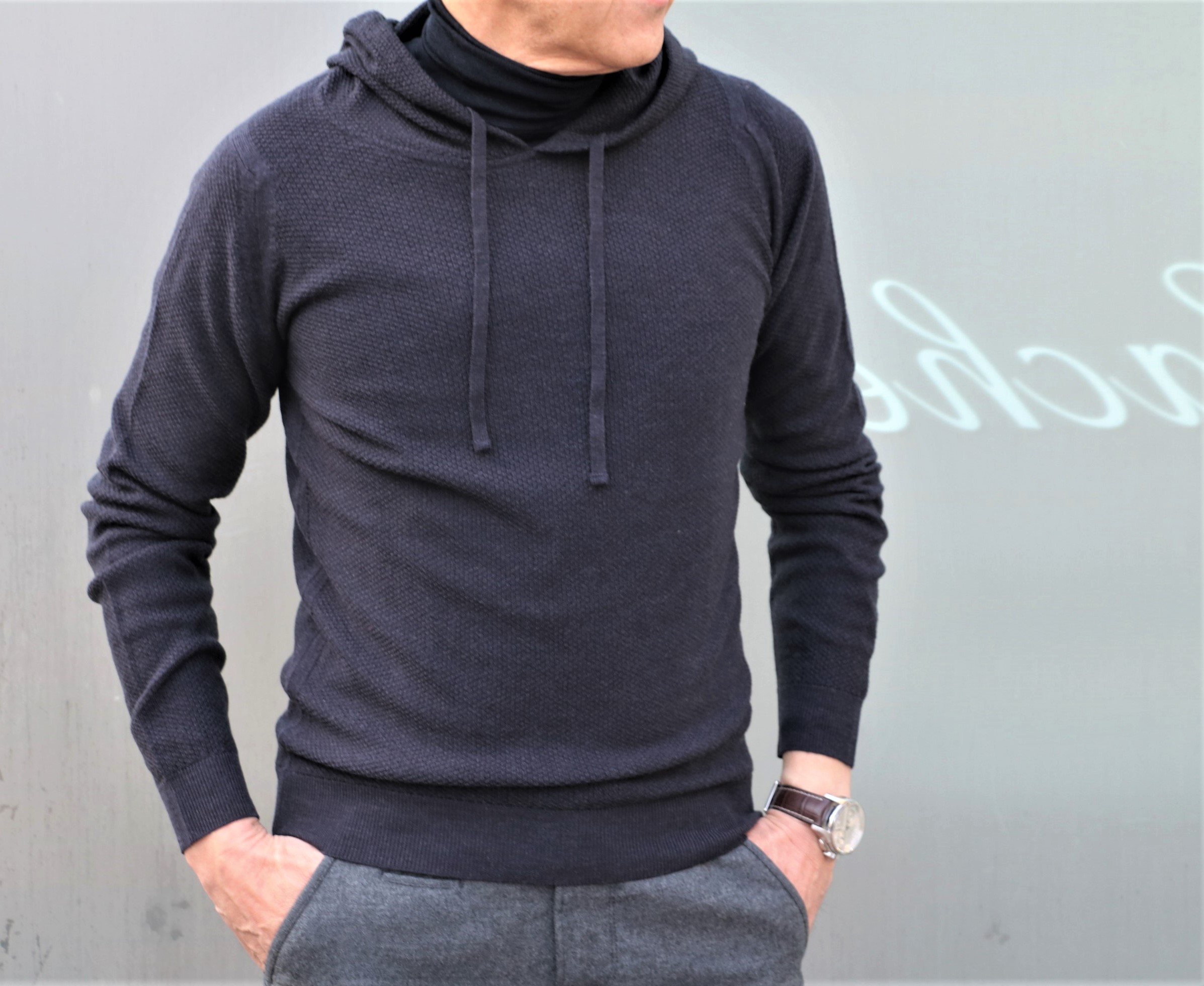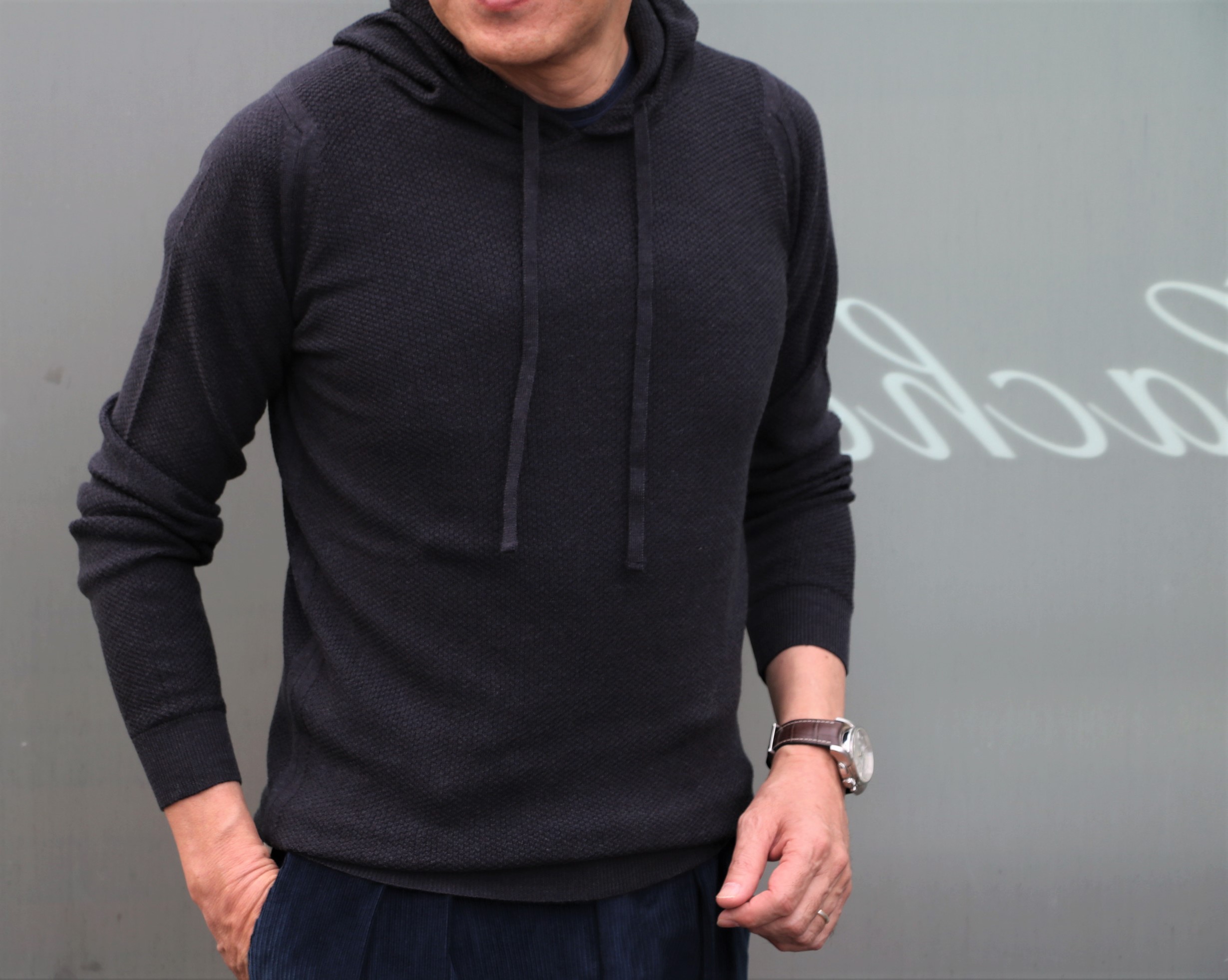 最後に合わせたのが、この冬より隠れ場カシェートに移動したJOHN SMEDLEY(ジョン スメドレー)の24Gパーカーニット。タイトな作りですが、ハニカム構造による弾力性がストレスを感じさせません。私スグルでサイズMを着ましたが、少しゆとりを求めるならワンサイズ上げても良いかもしれません。
