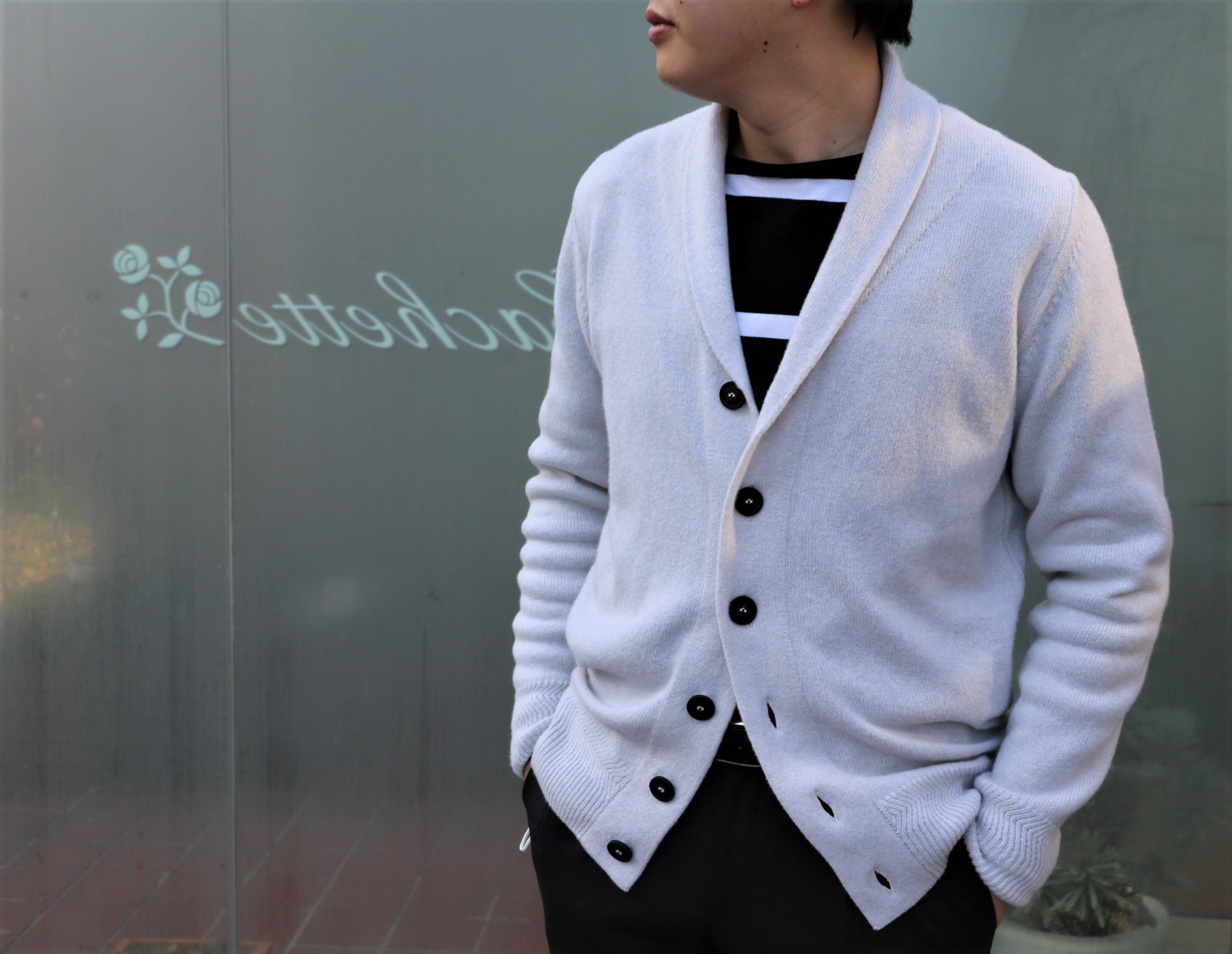 毎回、バイイングしている定番品の多いJOHN SMEDLEY(ジョン スメドレー)。その中にあって異色ともいえるのが、上のパーカーニットと本日、ジュニアが着ていたカシミア混のショールカラーカーディガン。どちらもフェア価格となっておりますので、心にとどめていただければ嬉しく思います。インに合わせているのは、再入荷のMAISON CORNICHON(メゾン コルニッション)です。入荷早々、手に入れているジュニア。着ないと、その良さを伝えることができませんからね。