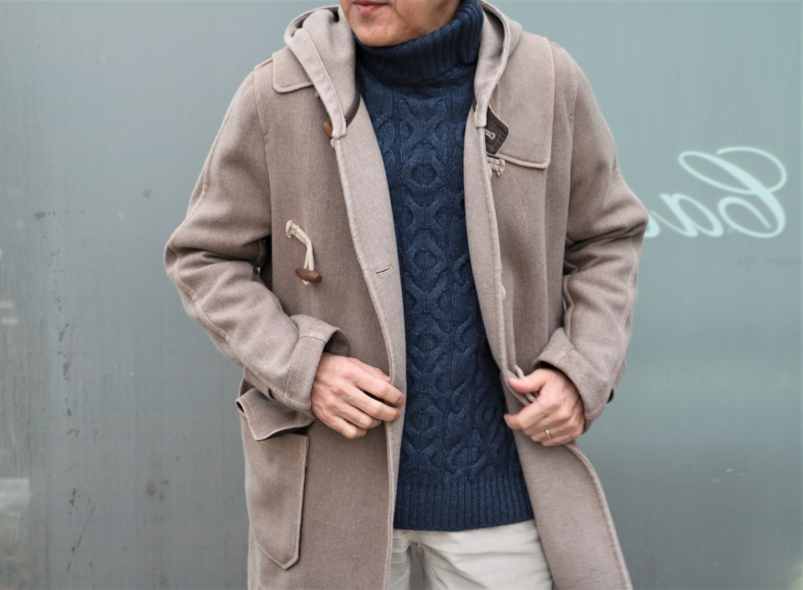 スコットランド創業の老舗ニットブランドとの相性を考えるなら、ダッフルコートの魅力を満載した英国名門コートブランド【GRENFELL/グレンフェル】の「Baker」しかありません。生涯現役は間違いありません。懐かしい潮の香りを感じながら、海のオトコを演じるにうってつけのインディゴニットとキャメルダッフルコートの組み合わせです。