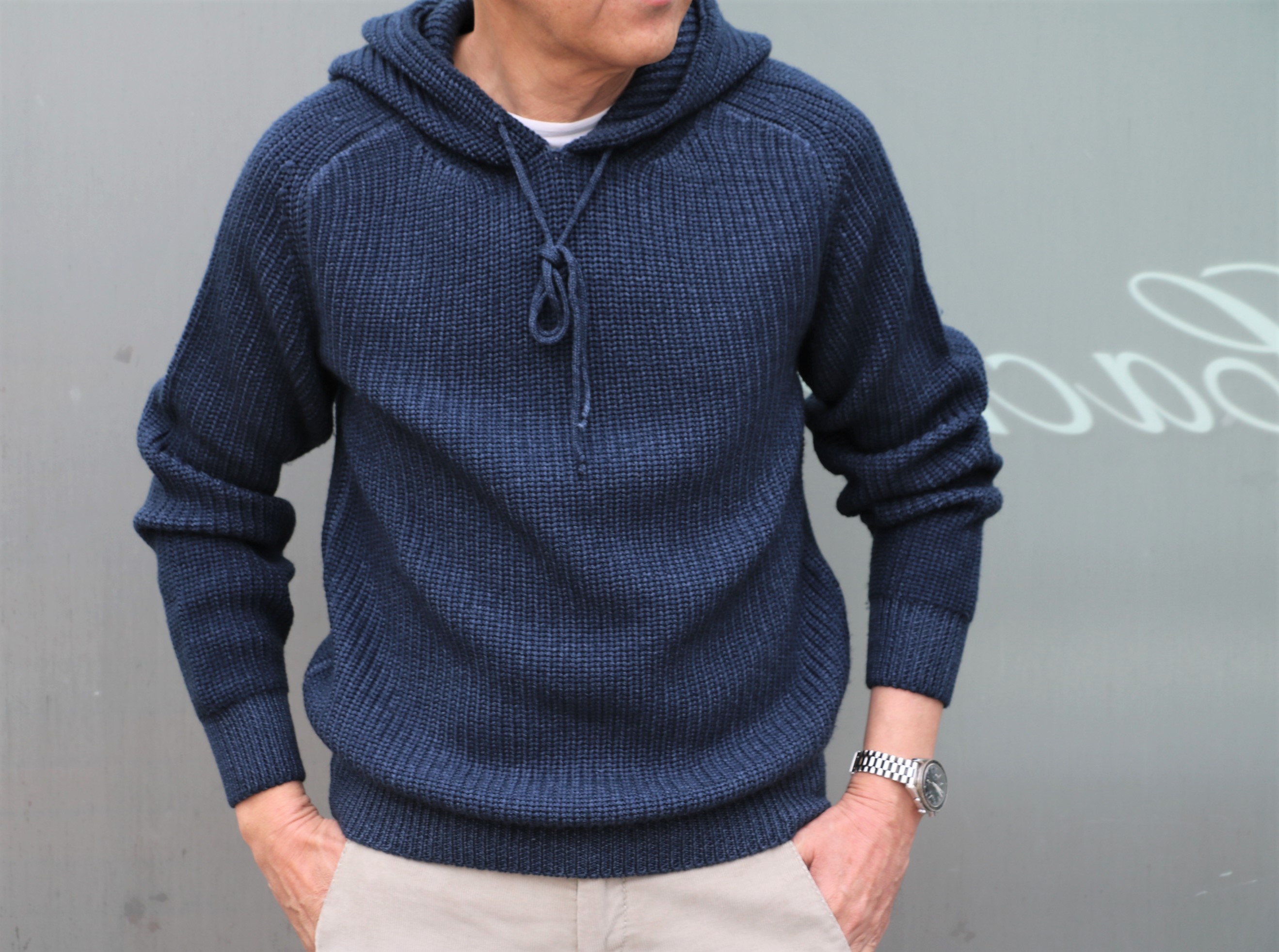 ならば、これって選んだインディゴカラーが、こちら【DRUMOHR/ドルモア】のパーカーニット。1点のみですが、サイズ46がありました。フードがあれば雨の日も...いや、そういう話ではなく、フードがタートルネックやマフラーの代わりをしてくれるのです。
