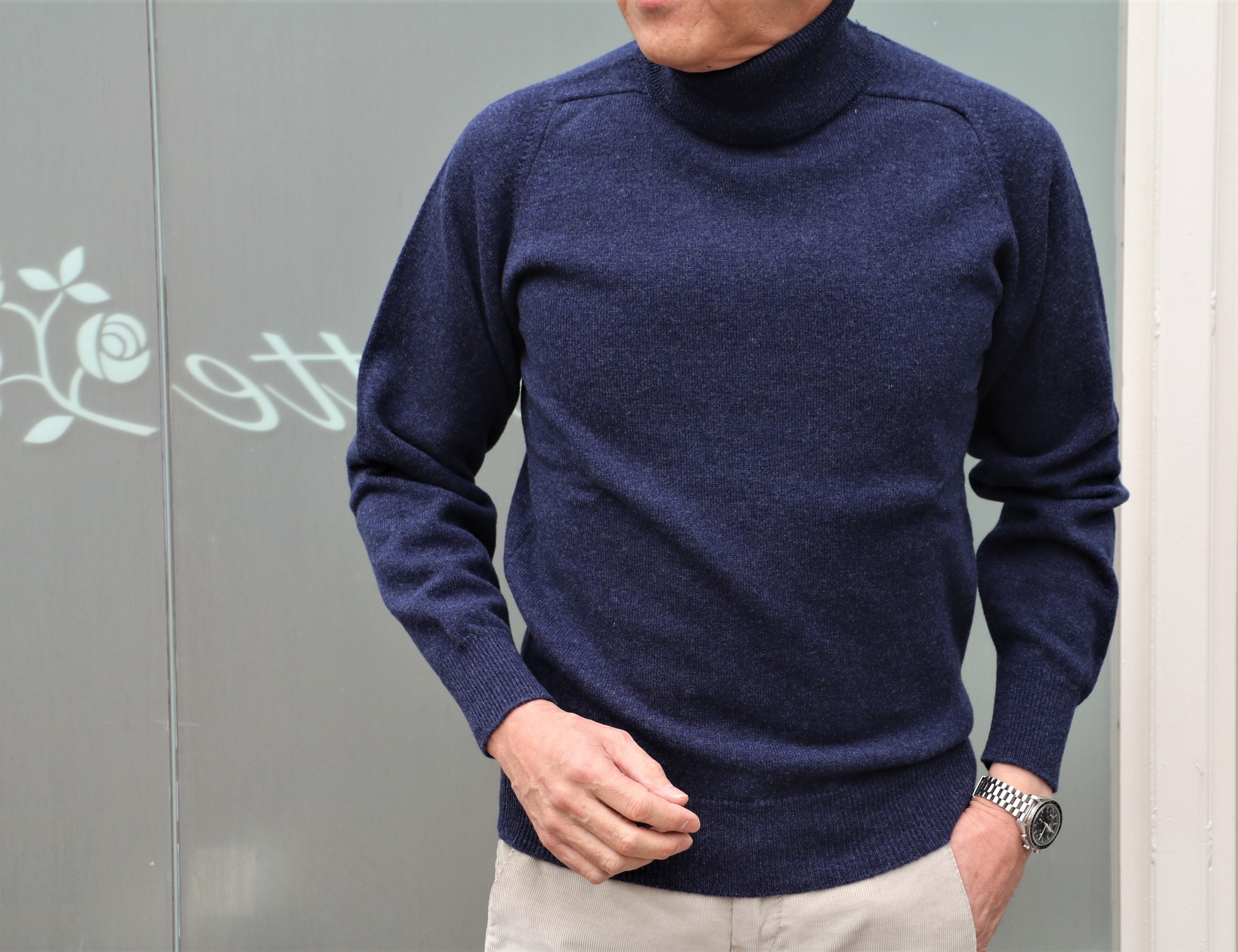 インディゴなら、こちらも忘れてはいけません。WILLIAM LOCKIE/ウィリアムロッキーのタートルネックセーターは、深みのあるインディゴカラーです。ラムズウールのしっかりとした打ち込みのあるニットは保温性は格別。やや硬めの手触りですが、嫌な肌への当たりは全くありません。クルーネックでブラック(サイズ38)を購入。クオリティとプライスの両面から見ても納得のいくブランドです。