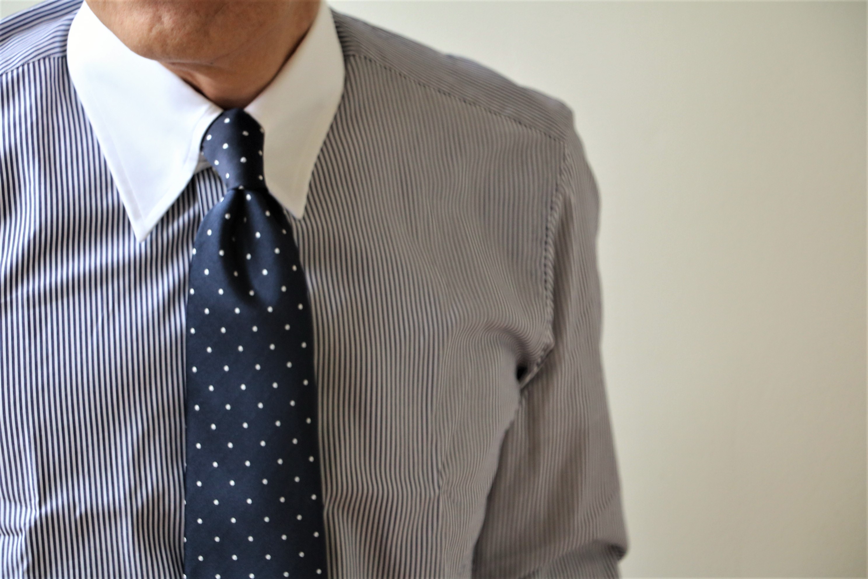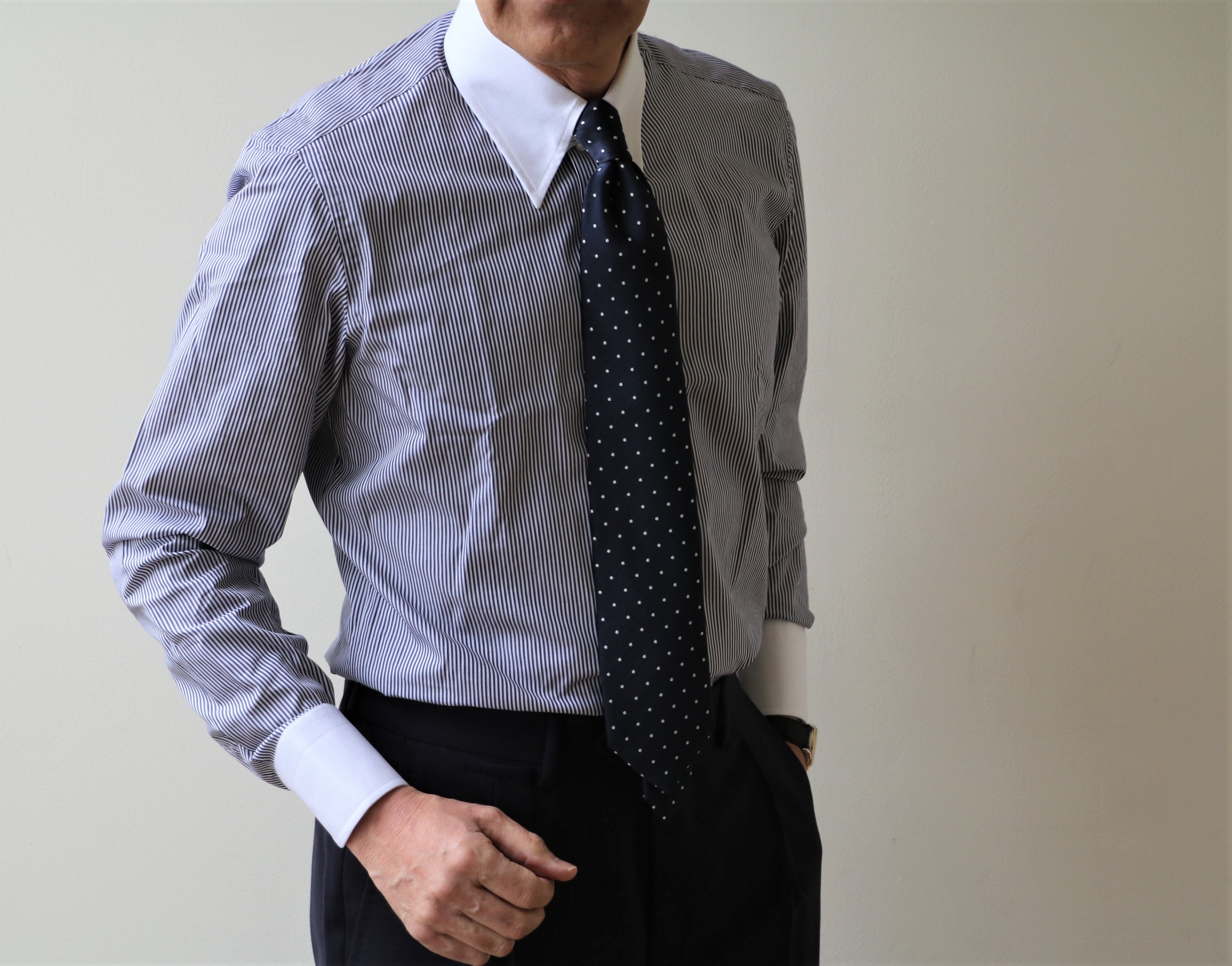 ロングポイントのタブカラーにドット柄のネクタイを結んでいるのが分かります。本日のご案内は、コーディネートで使った、このシャツとネクタイをご覧いただきます。