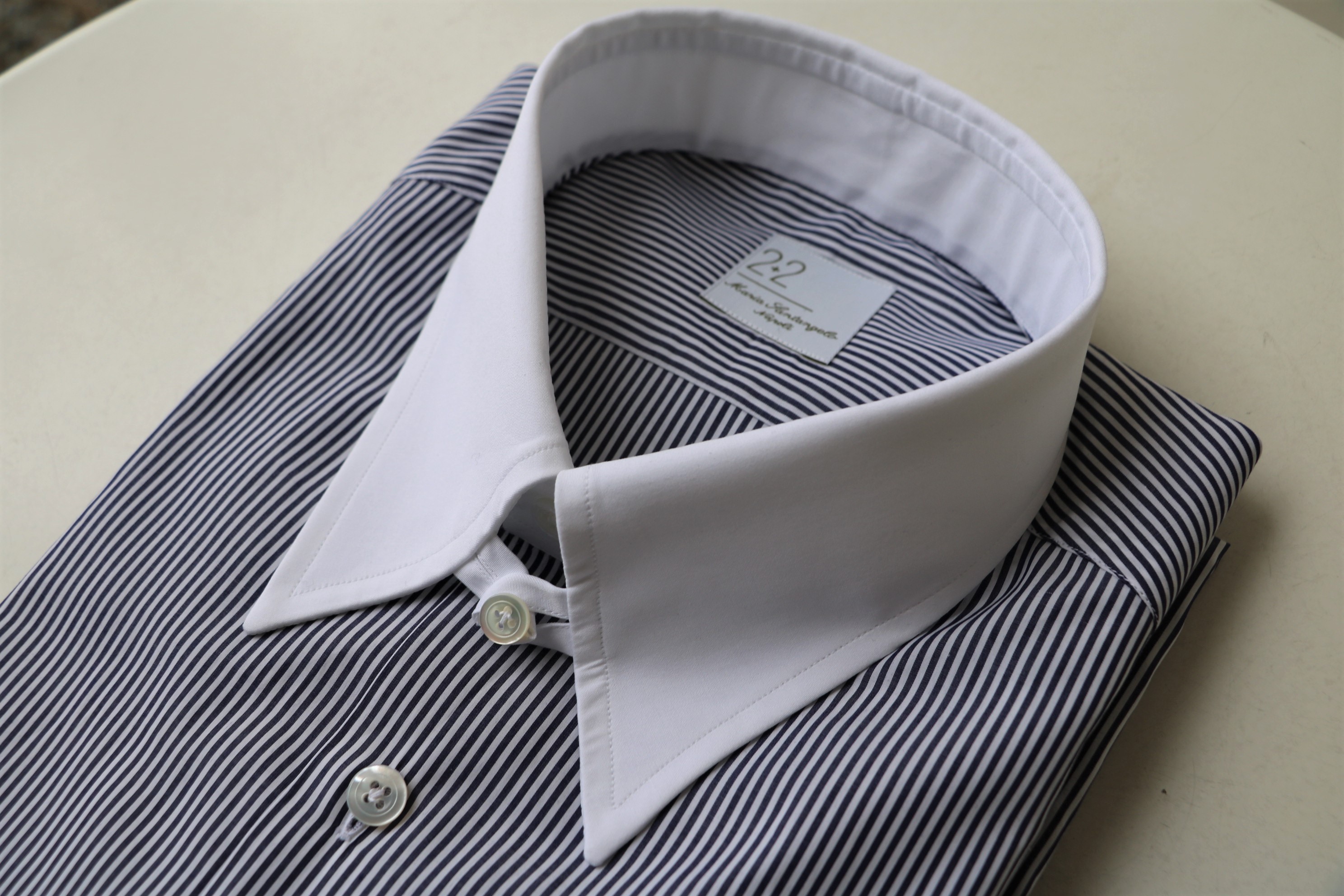 シャープな雰囲気をもつ濃紺のミニロンスト柄。選んだ衿は、ロングポイントのタブカラーで、エリとカフスに白生地を使ったクレリックシャツです。ハンド箇所は、以前は2箇所。現在は、袖付け、釦付け、カンヌキ、ガゼットの4箇所がハンドになるも価格は据え置き。サイズ感共にバランスの良いシャツです。