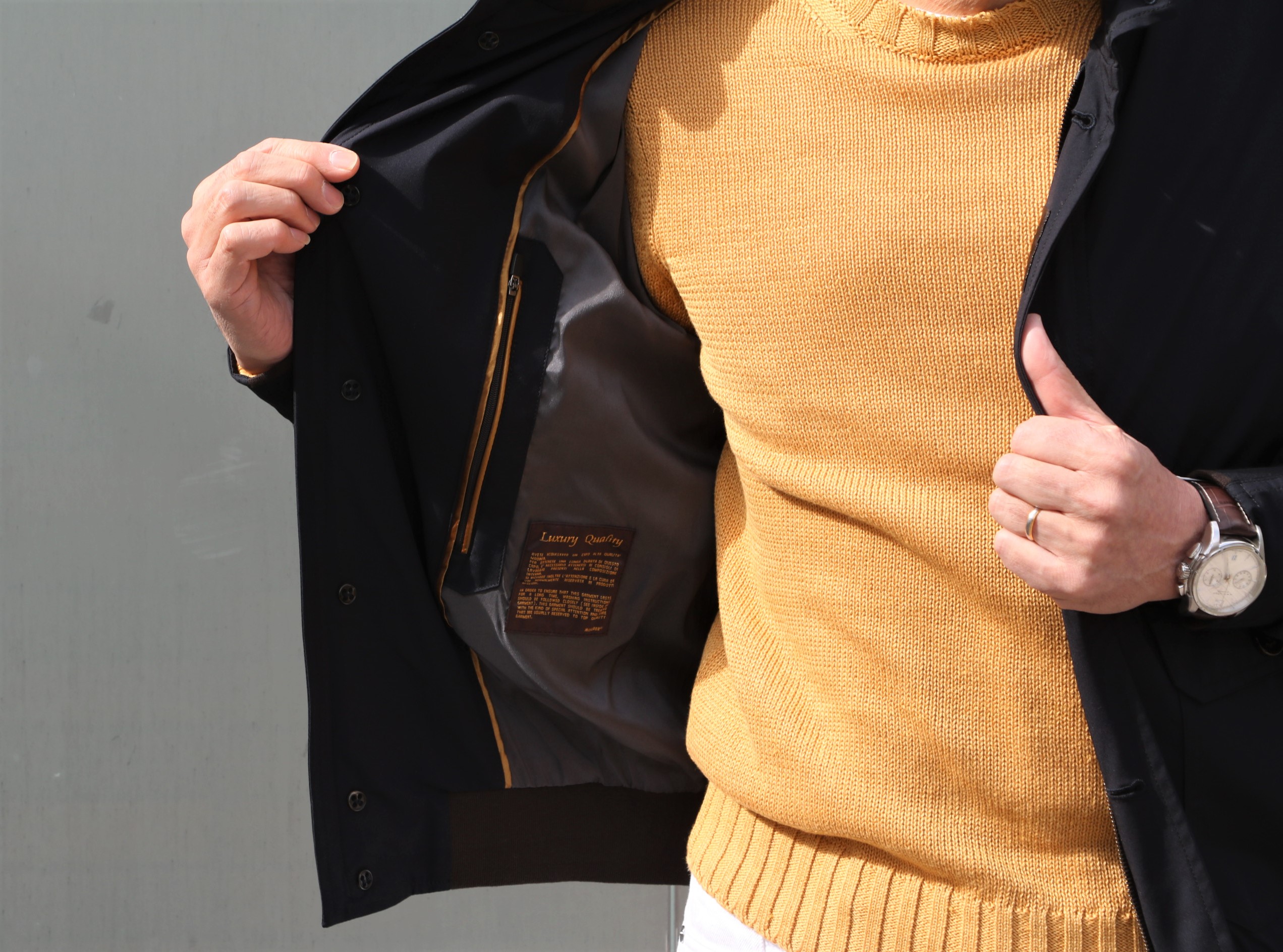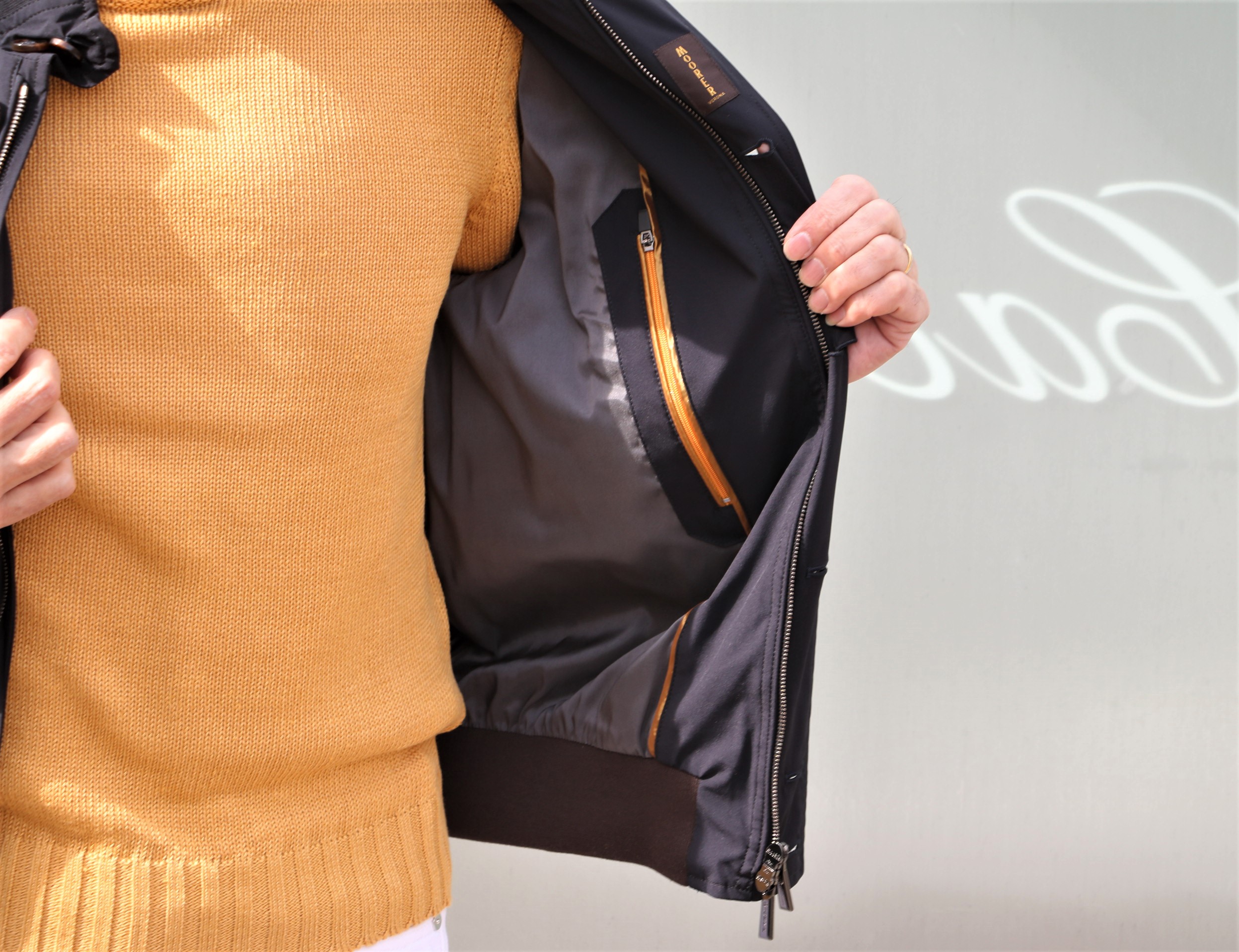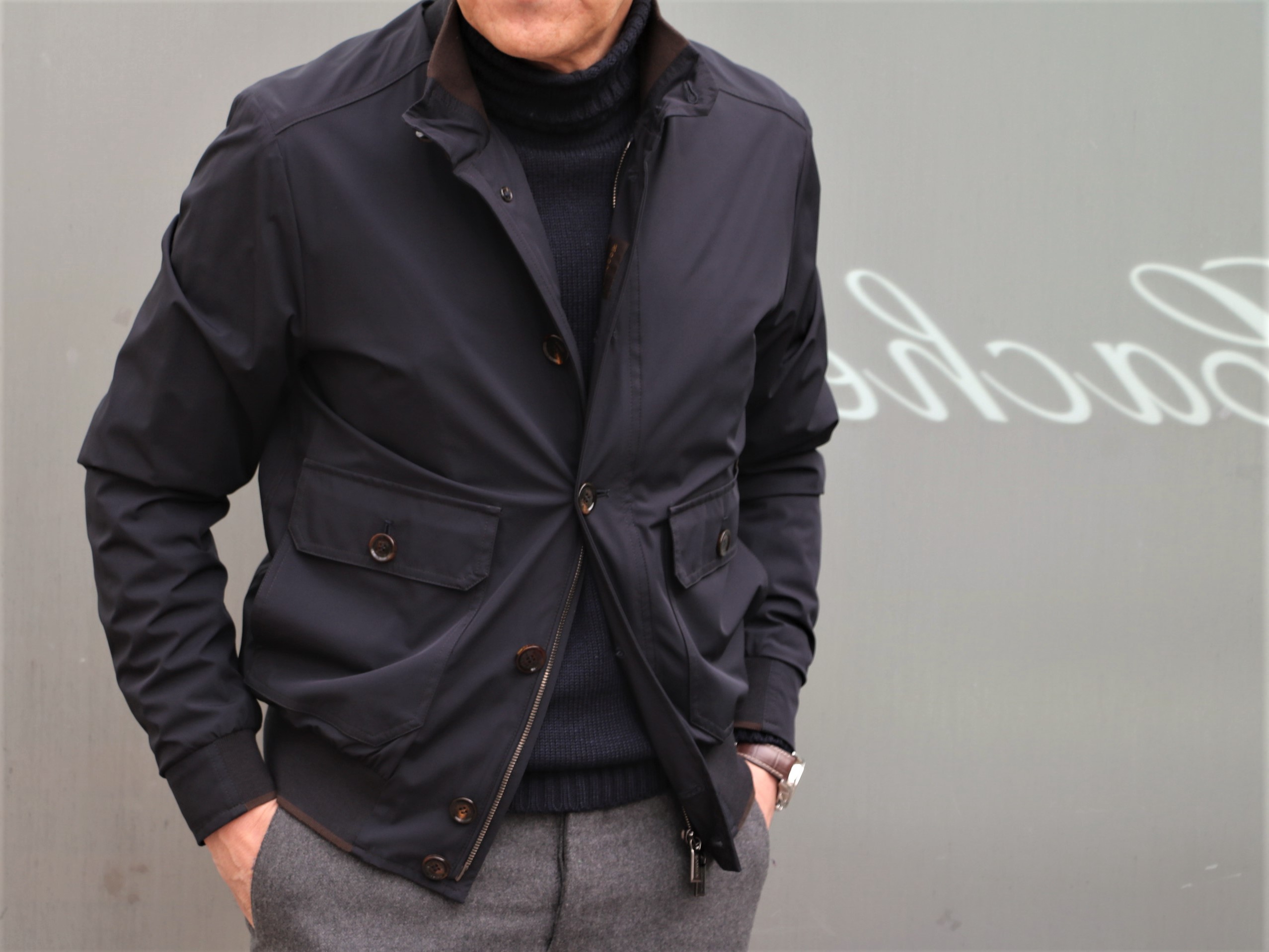 あまりにも寒く、本日の出で立ちに羽織って、素知らぬ顔で済まそうかと思った【MooRER/ムーレー】の新作。気温がもう少し上がれば、この手の使い方もあるアイテムです。