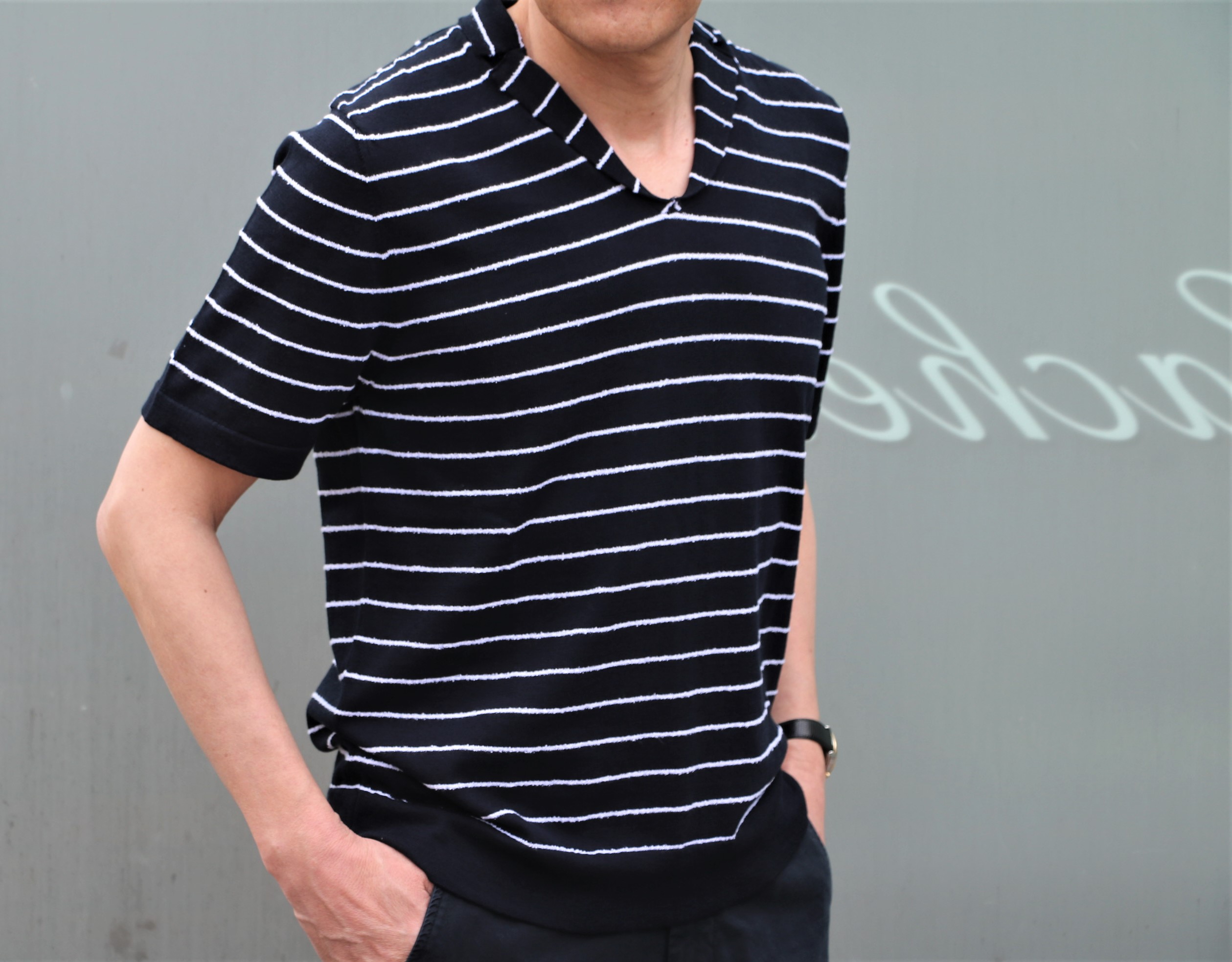 昨日、ご案内させていただいた浅Vネックのサマーニット同様にラインの入り方が面白い。まるで塗ったペンキが乾いて剥がれ落ちたような...。規則正しいラインであれば、きっと魅力を感じなかったでしょうね。襟もよくあるスキッパーではなく、ラペルタイプ。この辺のデザインが、実にうまい【eleventy/イレブンティ】なんです。
