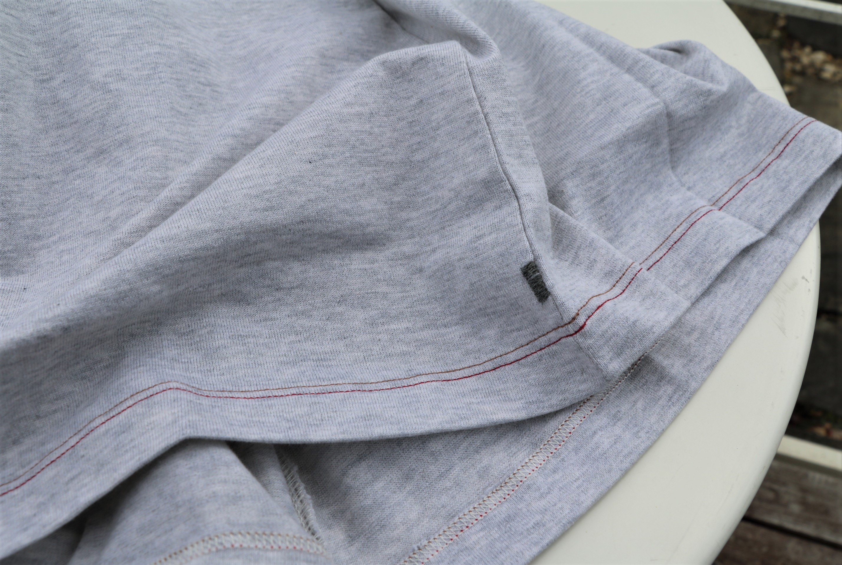 スウェットやTシャツなどでみるヘザーグレイ。杢グレイとも言いますが、もっと明るく、やや生成りがかった色合いです。薄すぎず厚すぎず、柔らかすぎず硬すぎずと、バイヤー魂をくすぐるTシャツです。ステッチの入り方も絶妙。首回りやVガゼット、ショルダーには赤と金茶の順にステッチが入り、袖と裾は金茶、赤の逆の順番で入ります。