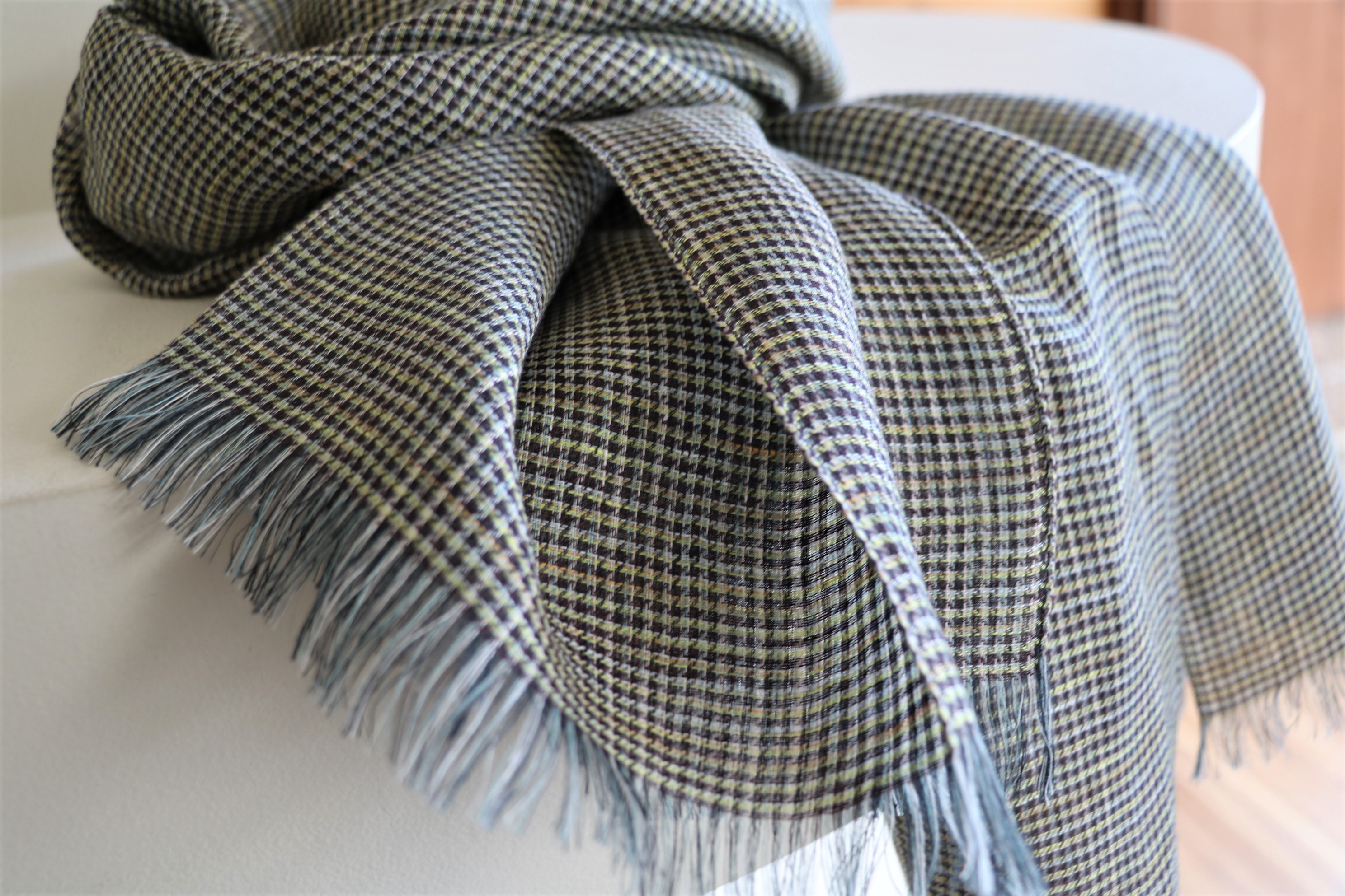 変形の千鳥格子でセレクトしたカラーは、2色。イエローやオレンジ、さらにブルーグレーと白糸で織り成す奥行きの深いブラウンベースと、ブルーグレイやシルバーグレイに白糸を織り交ぜたダークグレイベース。どちらもリネンのハリコシのある肌触りですが、使い込むほどにしなやかな表情を見せていきます。