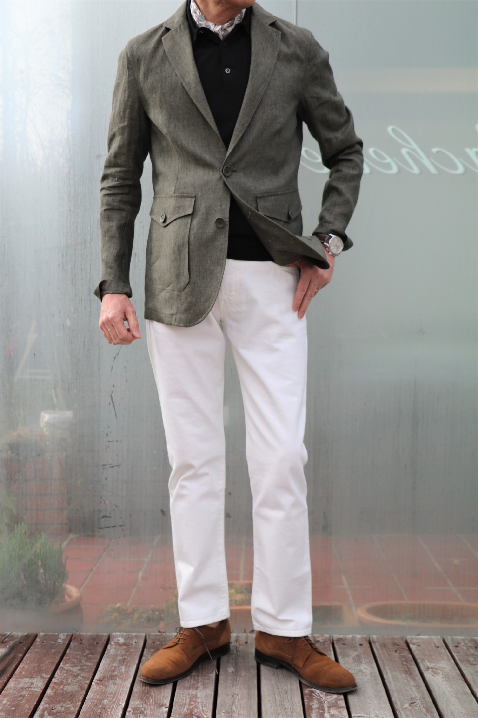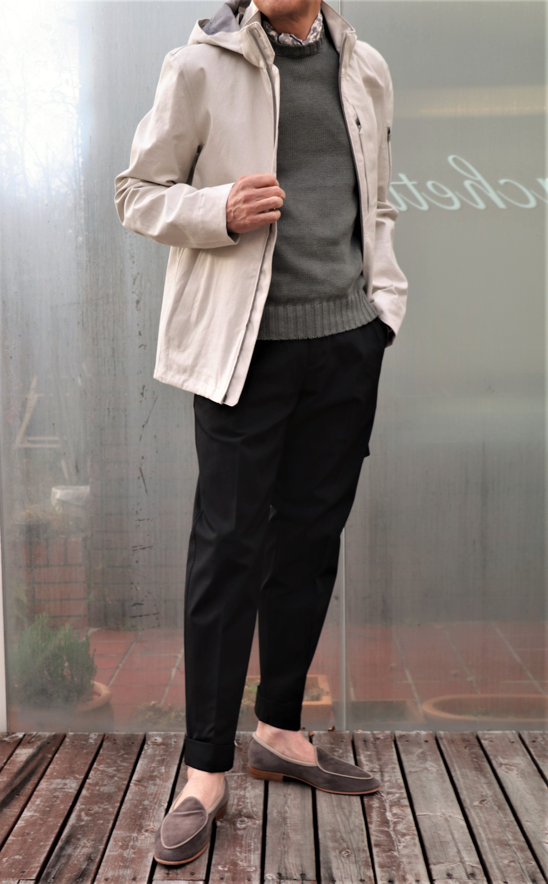 足元は別として、こんな着こなしは身近です。羽織ったのは、HERNO(ヘルノ)のスプリングコート。インに着たのが、
