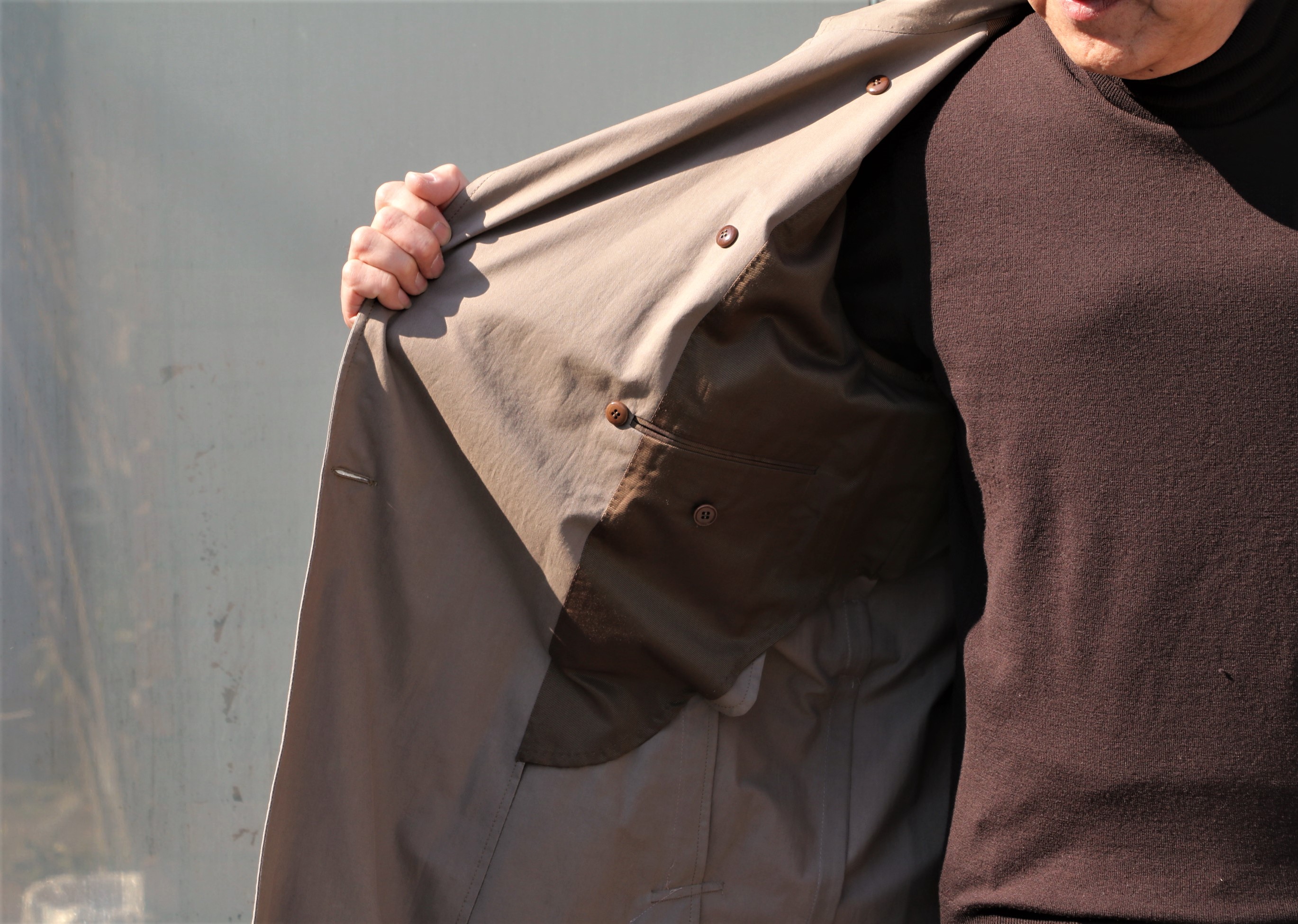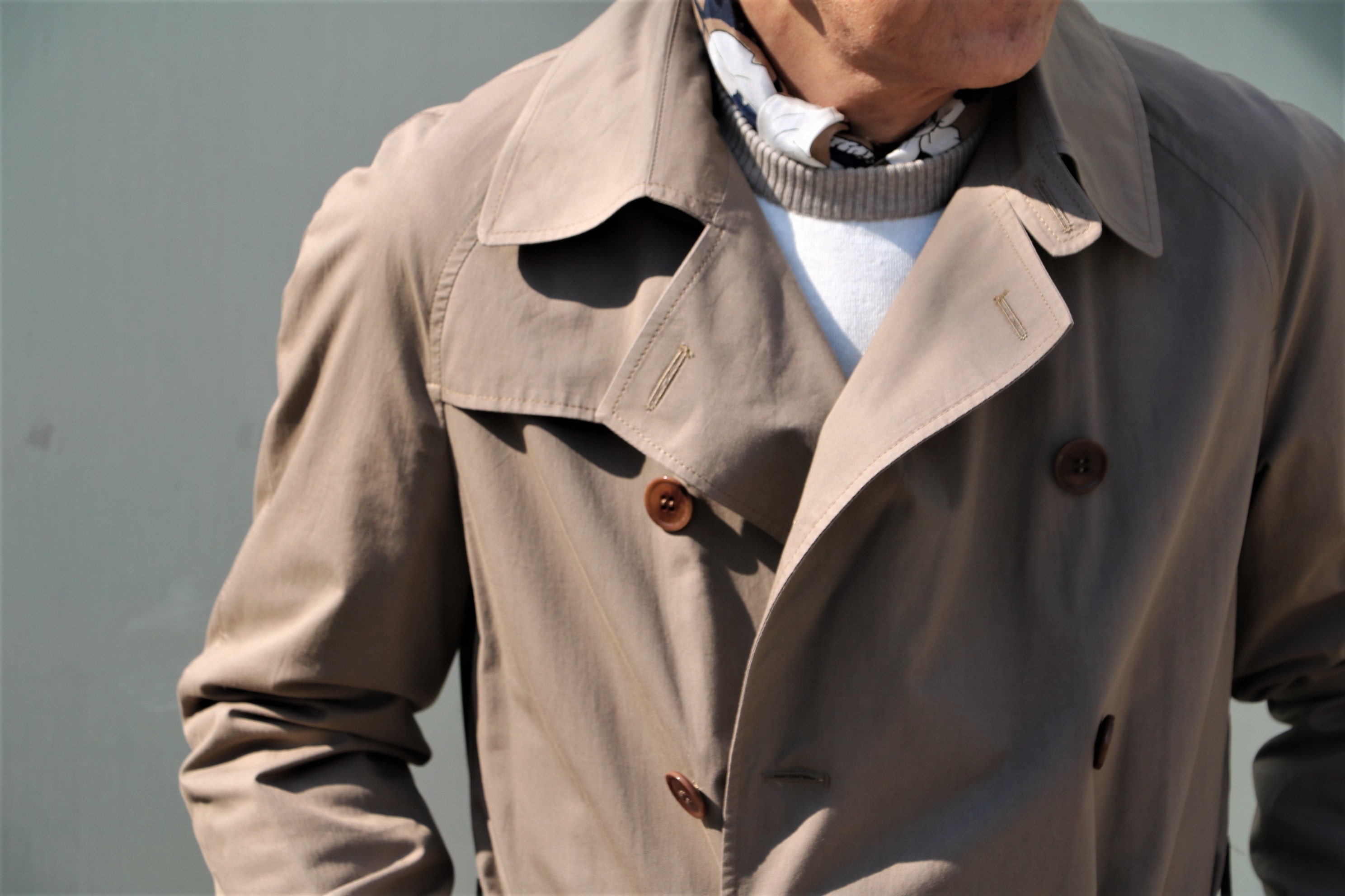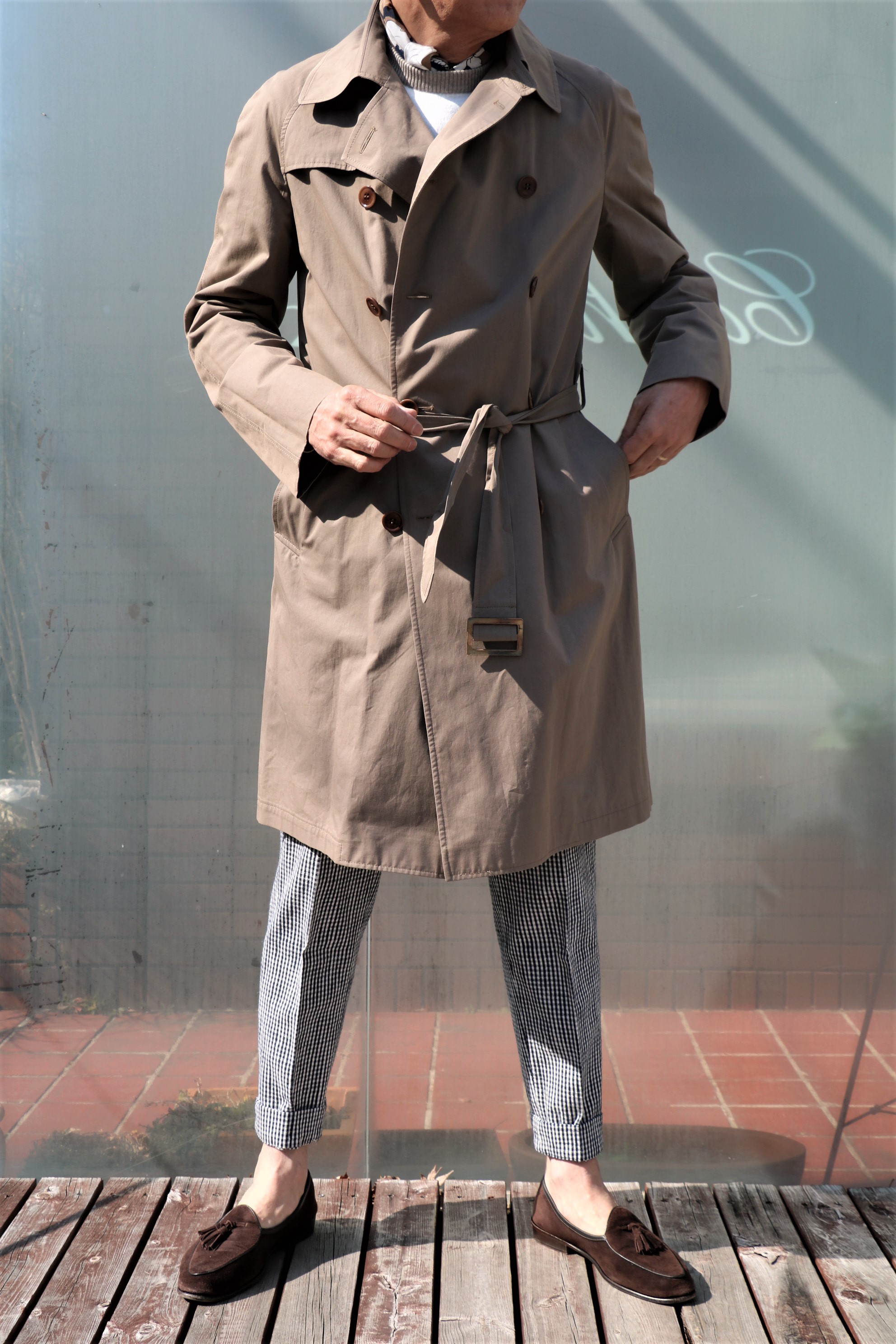 いかがでしょうか。これが、前回ご提案させていただいた「ピーチスキン シングルベルテッドコート。流れる様なフォルムが美しい、しなやかなシングルコートでしたが、今回は、もう少しトラディショナルな雰囲気をもつトレンチコートをご用意しました。