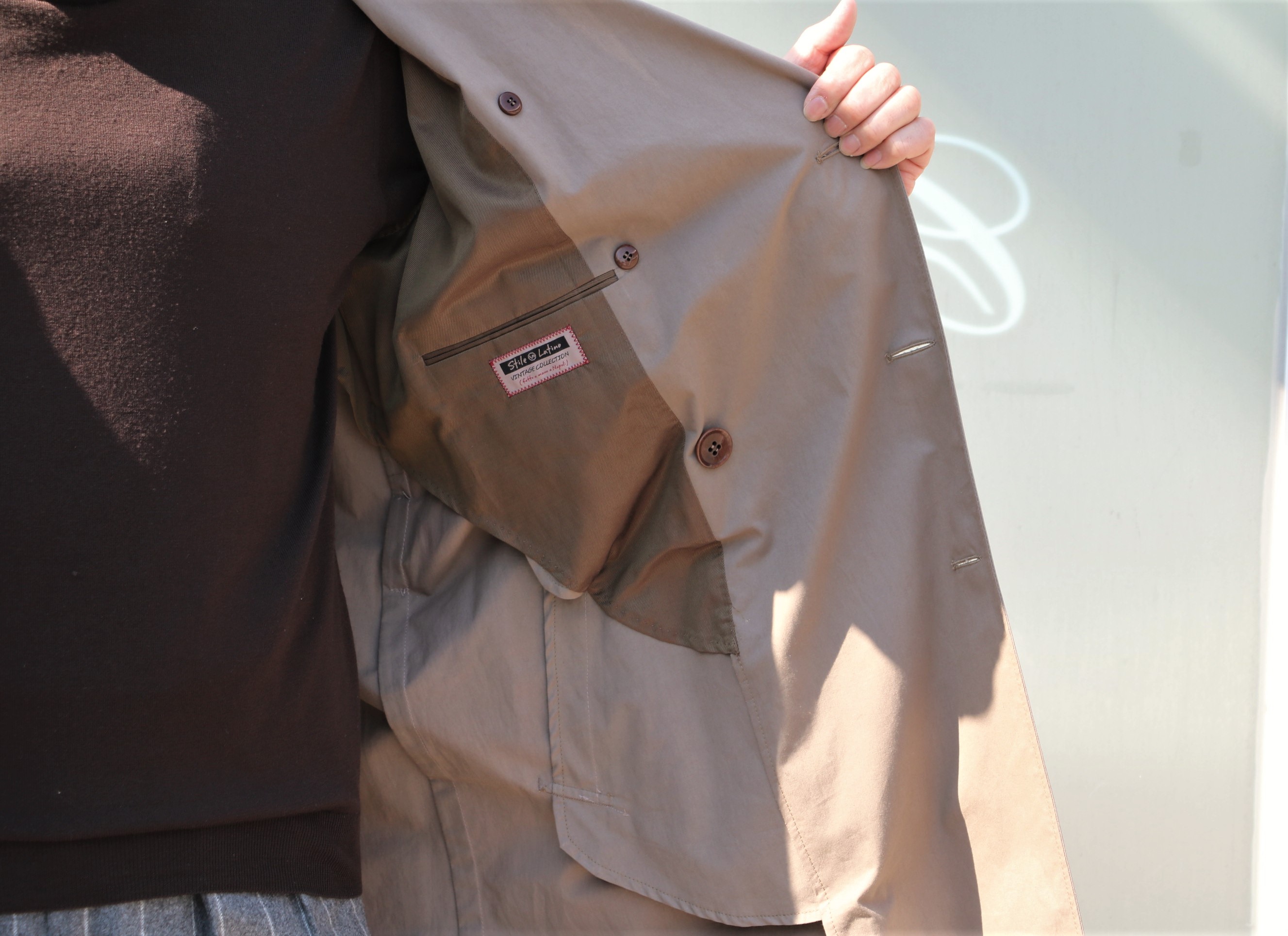 ベージュというより、くすんだ赤みのあるペールブラウン。薄手のコットンギャバジンは、ほんのり洗いがかった表情で、会った瞬間から馴染んでしまう、そんな出会いのような着心地になるはずです。