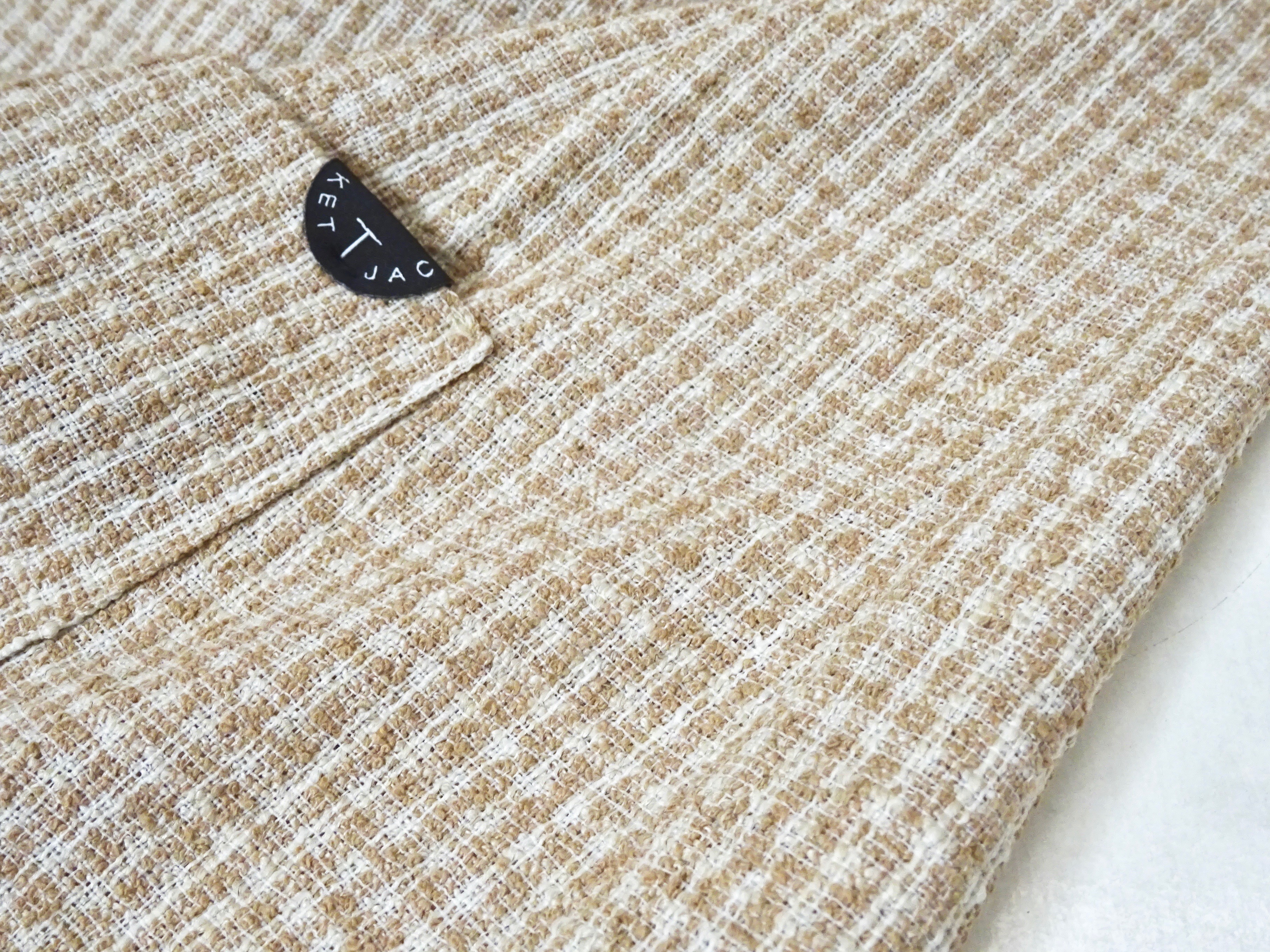 ポリエステル・コットン・リネン・ナイロン・ポリウレタンを混紡して作られた生地は、ザックリとした風合いのサマーツイード。通気性に富み、ドライタッチな表情が特徴です。