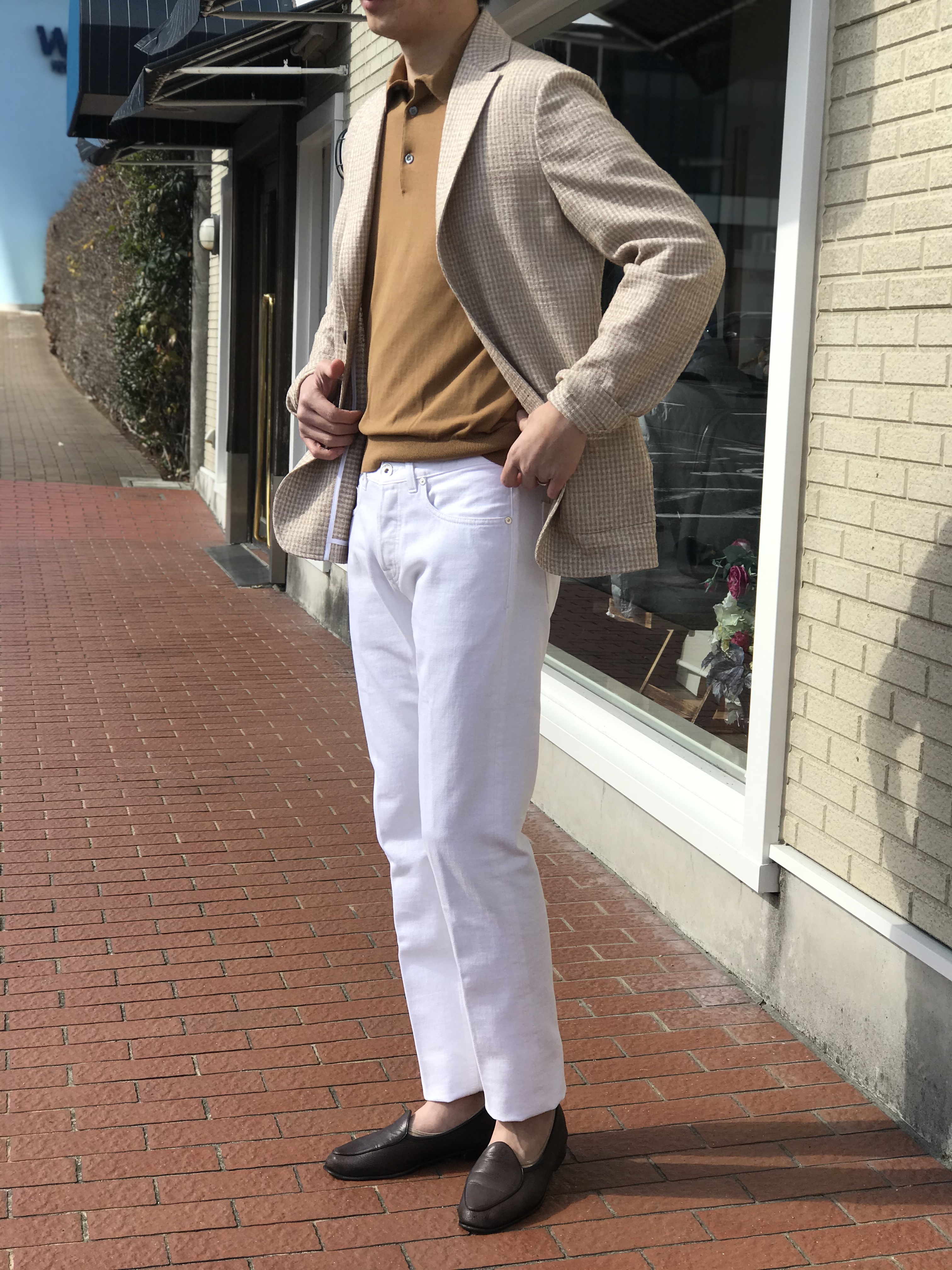 明るい陽射しに照らされ、柔らかな印象を放つベージュのジャケット。もうすぐ春ですね、Settefili Cashmereのキャメルポロにeleventyのホワイトパンツを合わせて、ちょっと気取ってみませんか。