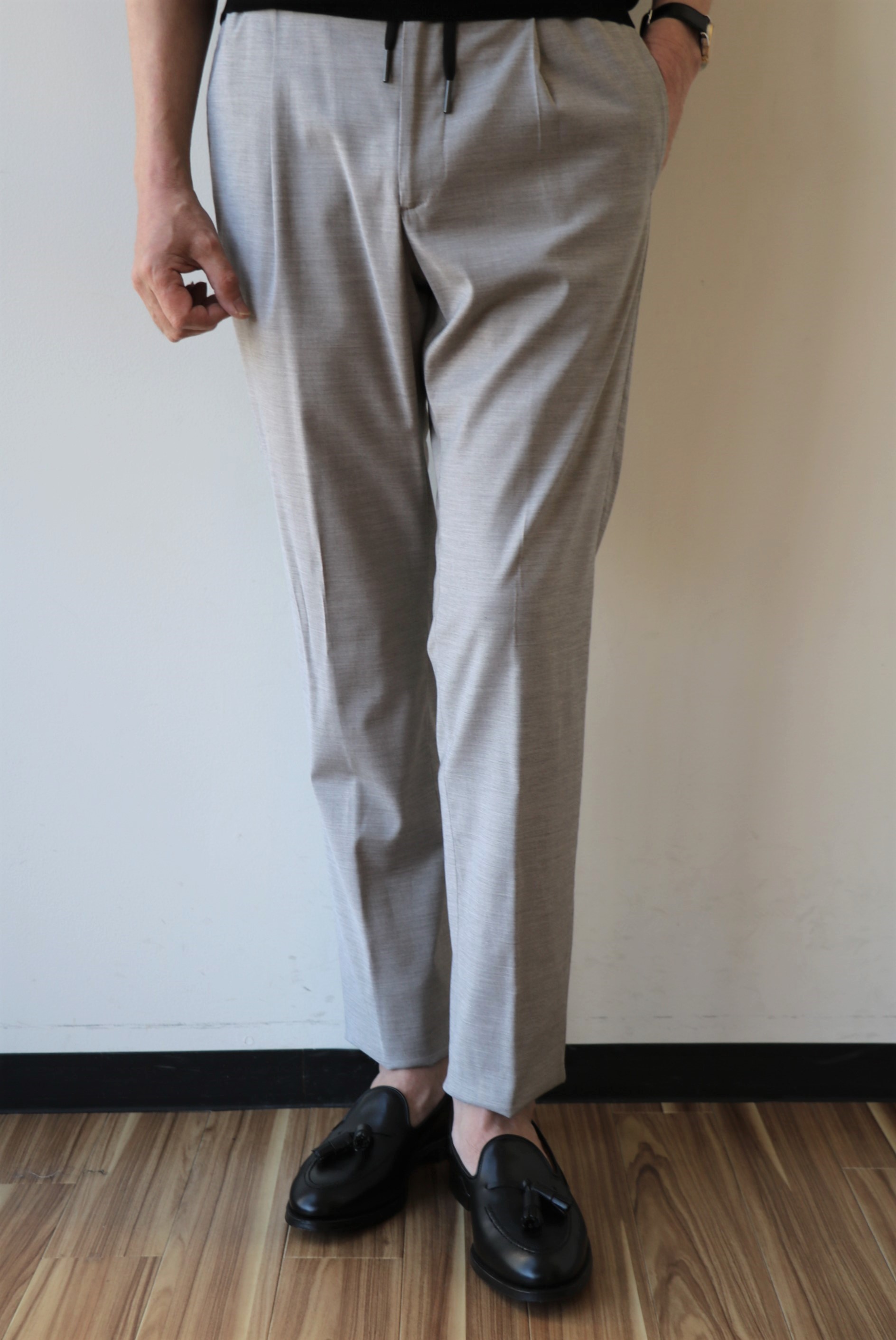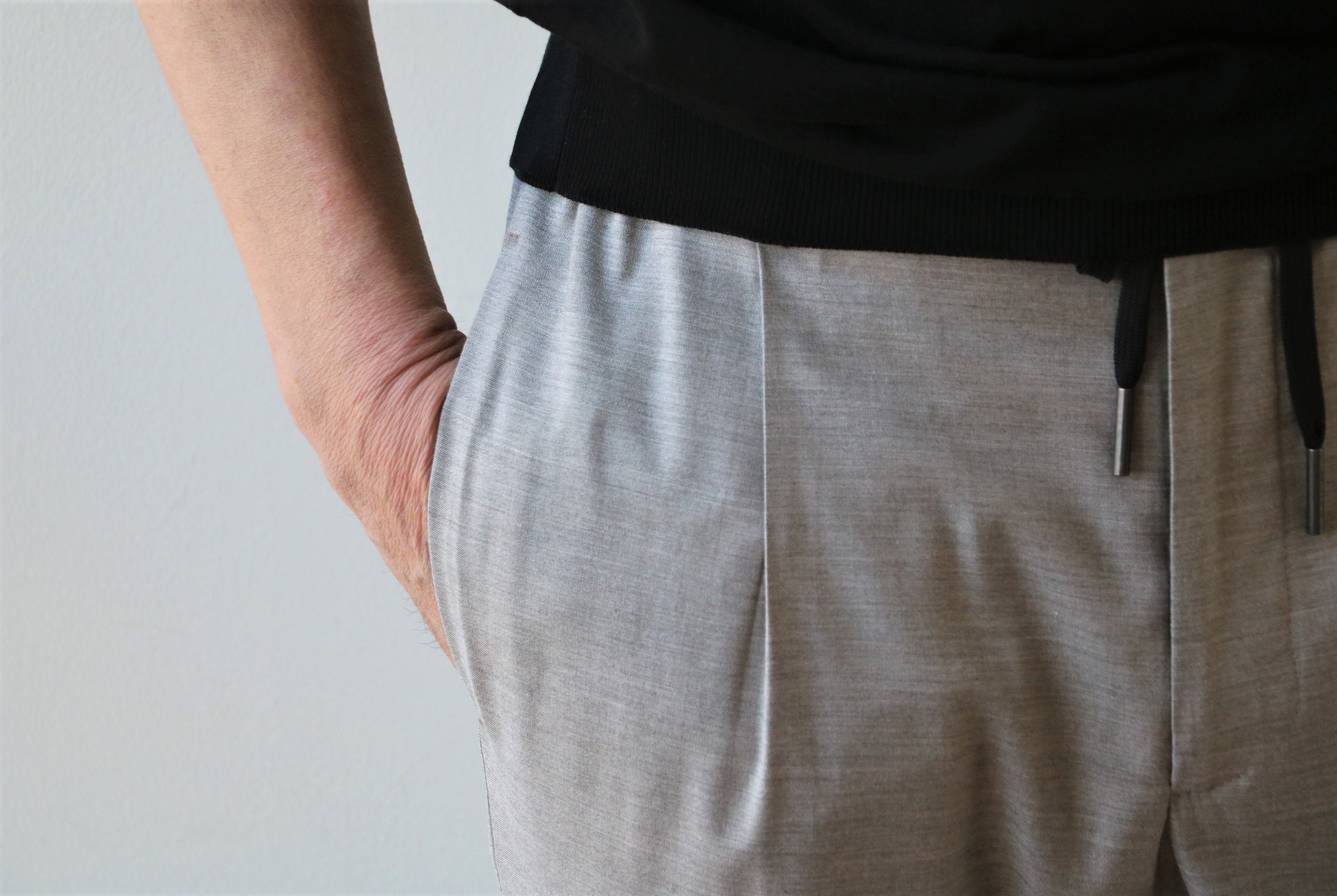 最後に組下のパンツについて。シャーリングパンツのラフさをエレガントにみせているのは、タック。敢えてベルトを締めれば、更に...ですが、この仕様ではループを飾りとして穿いた方が良さそうです。
