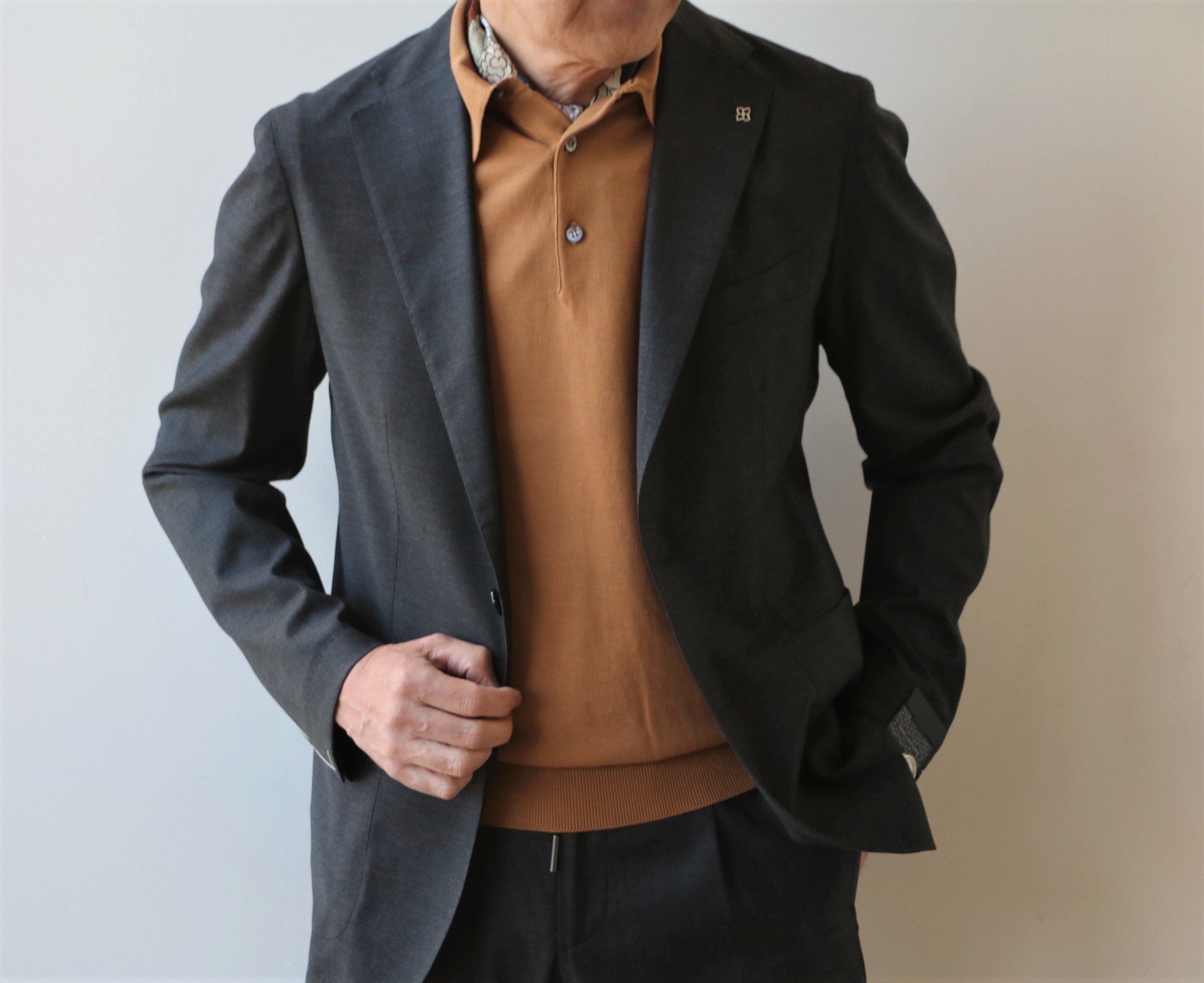 昨年ならクルーネックのカットソーやニットを合わせていましたが、今季は襟付き提案です。ポロカラーニット(Settefili Cashmere)なら、より上品なVゾーンを作り出すことができます。アクセントとしてネッカチーフ(Fumagalli)を巻いてもいいでしょうね。