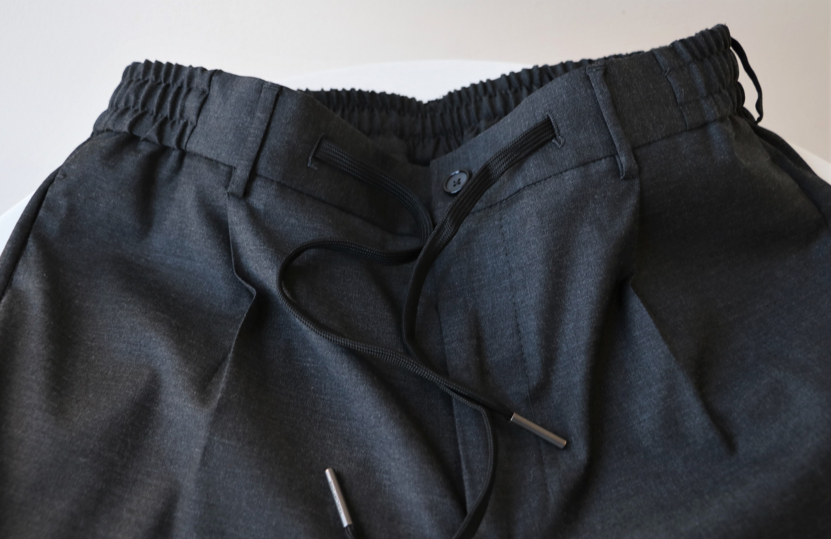 組下パンツは、外付けのドローコードが付いたシャーリングパンツ。緩やかなフォルムが特徴です。