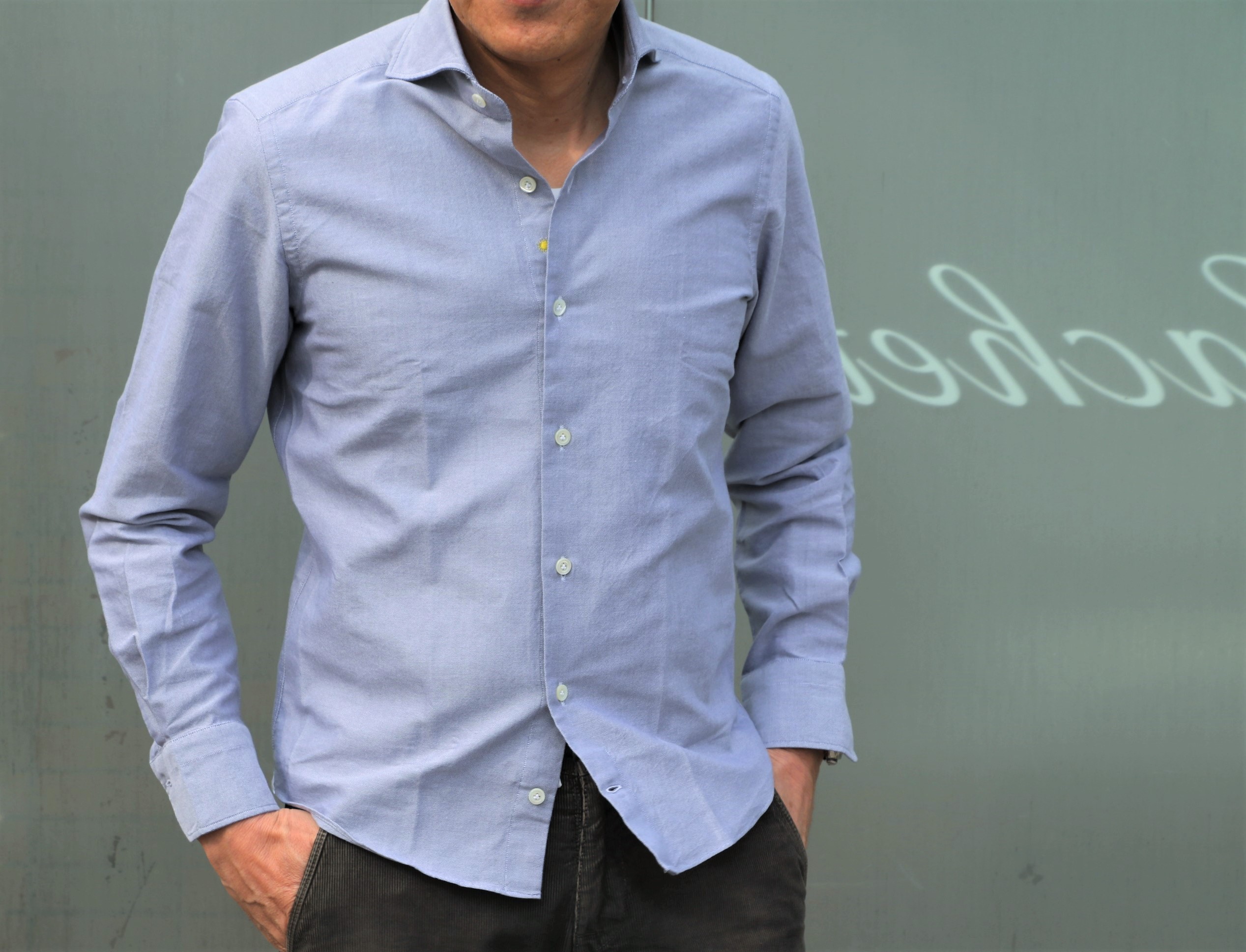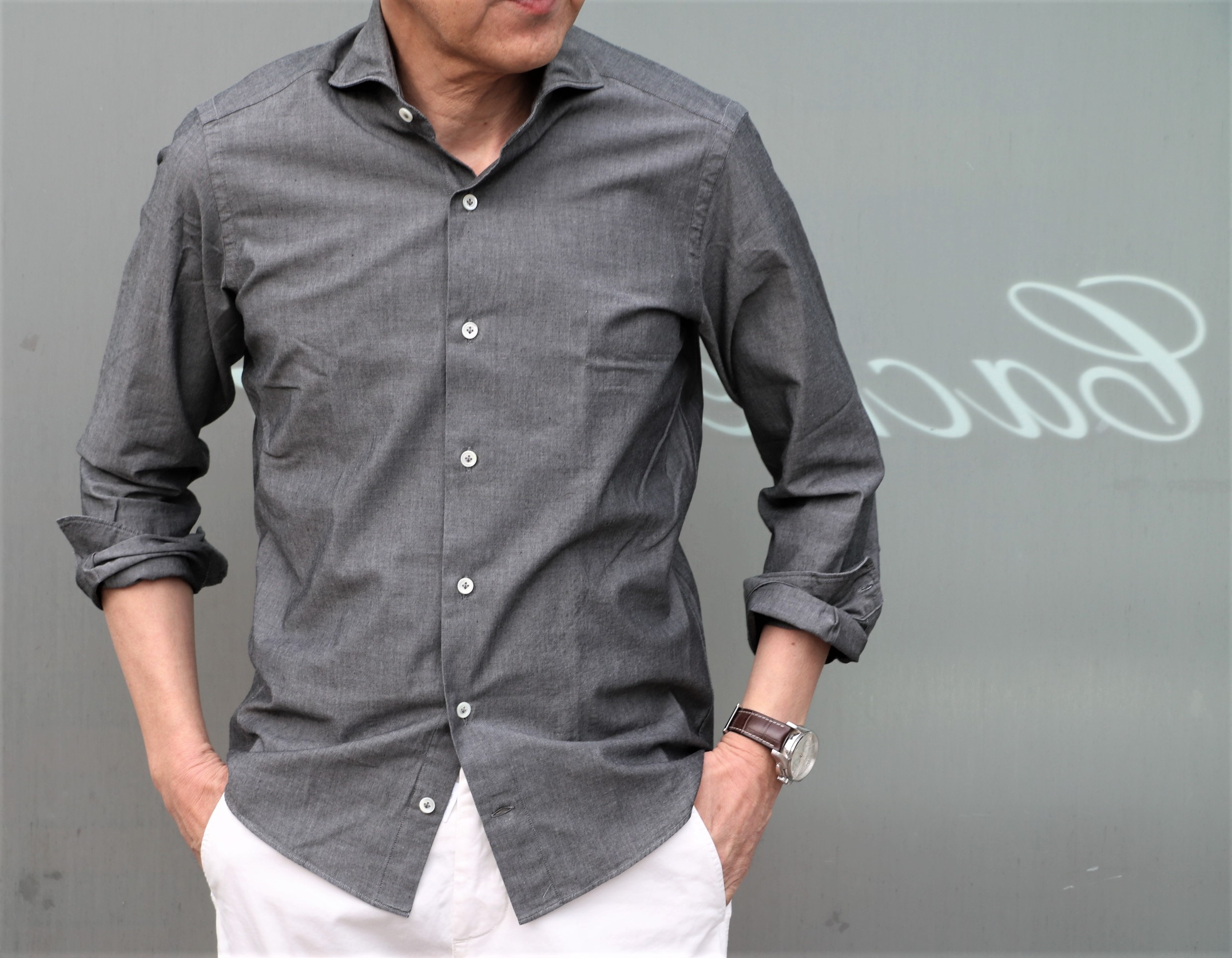 タックアウト前提であれば、選ぶ生地もカジュアルなもの。オックスフォードは、毎回、外せない生地ですが、今回、グレイを選んでみました。