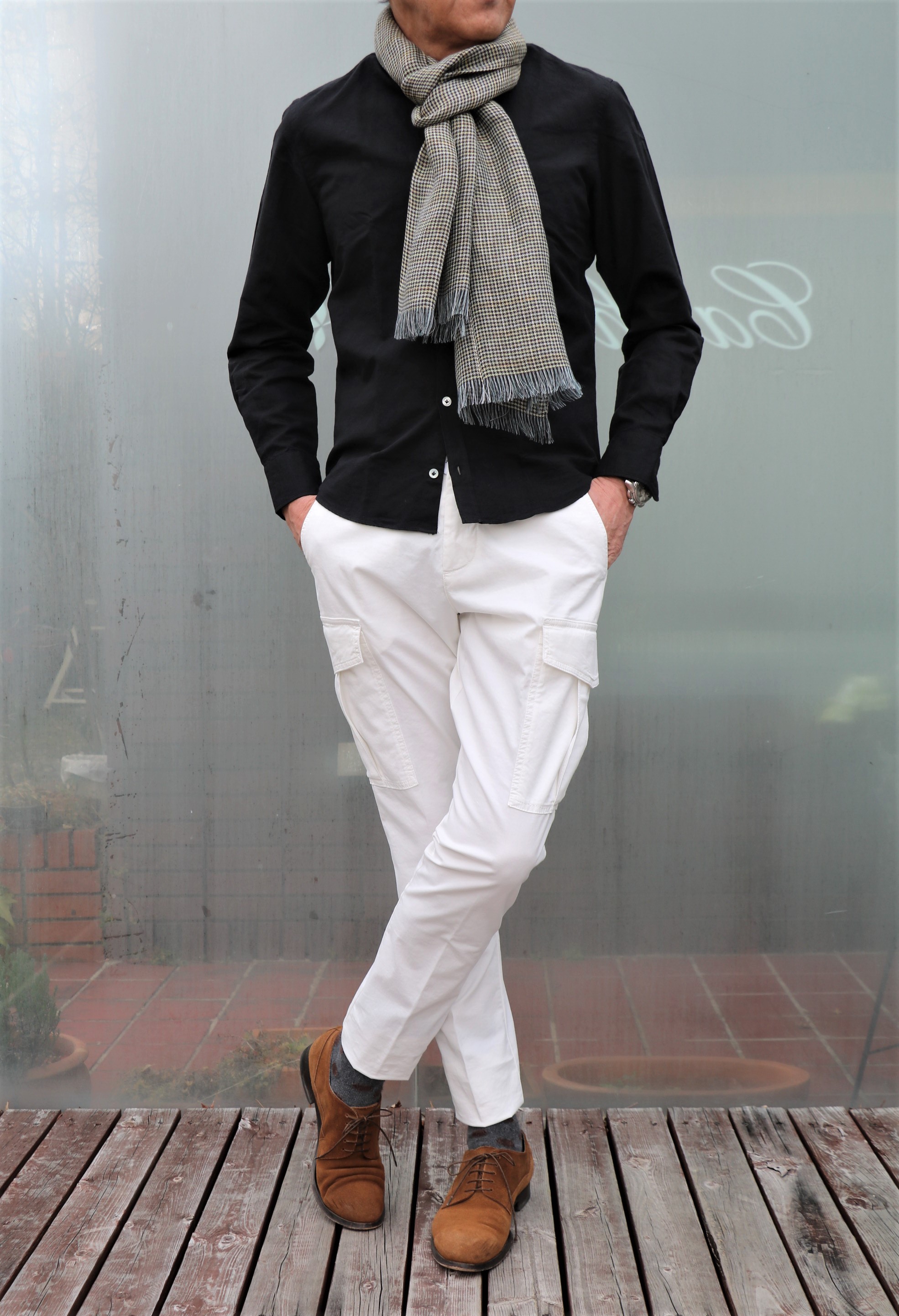 店頭で反響のあるeleventy(イレブンティ)のホワイトカーゴに合わせて着たシャツ(靴、靴下は私物)。さぁ、どんなシャツでしょう?「VINCI FIT」であることは間違いありません。
