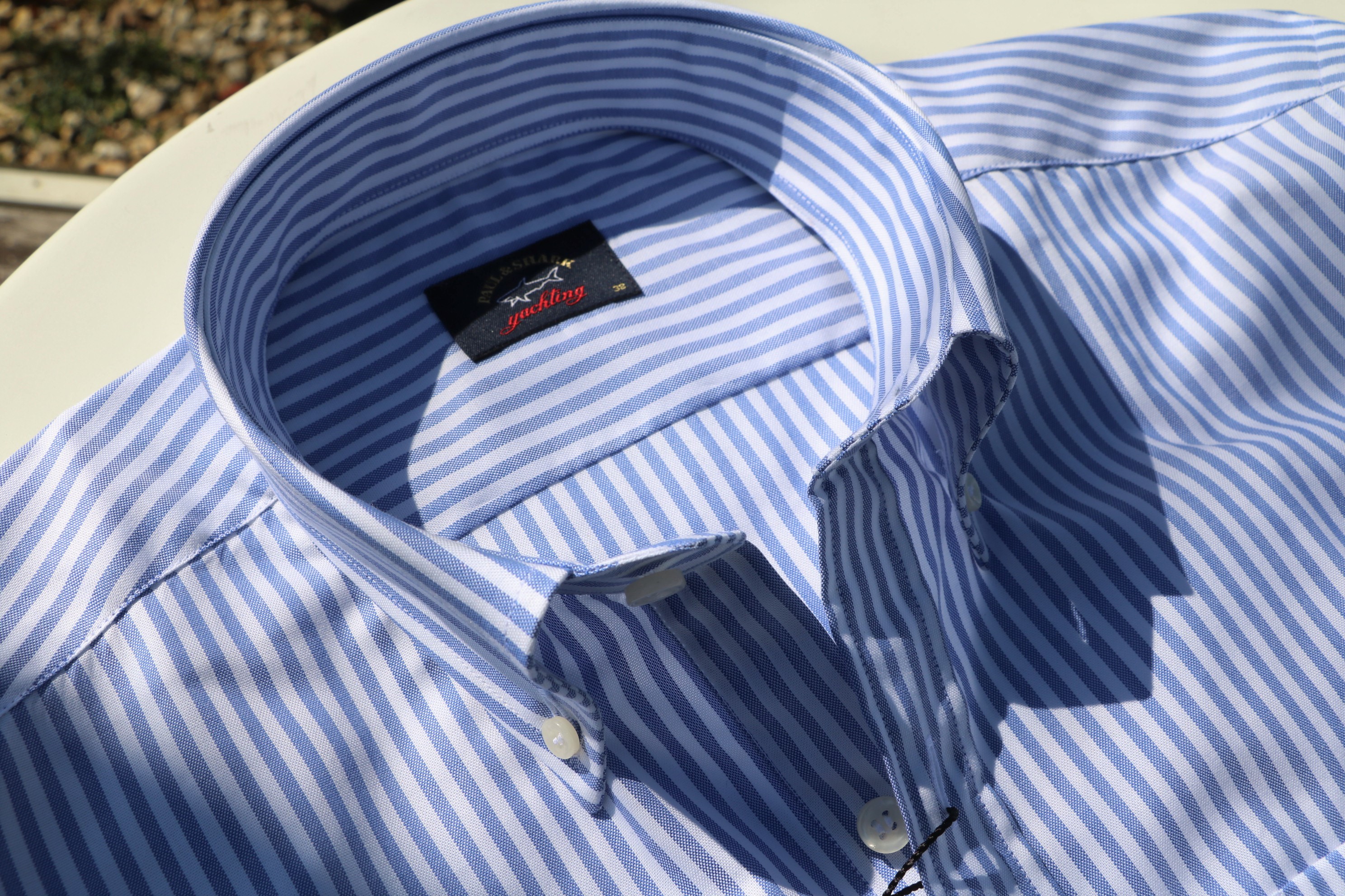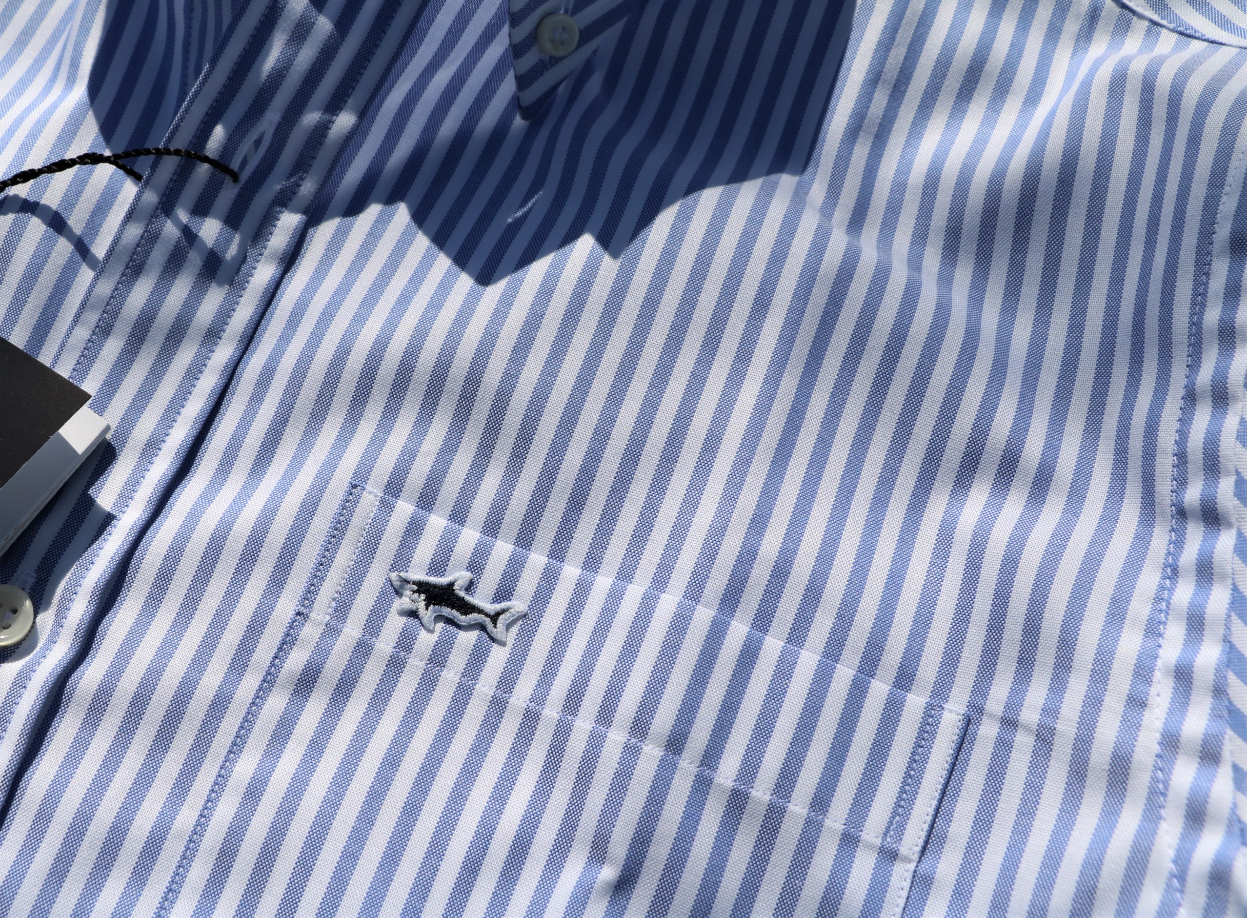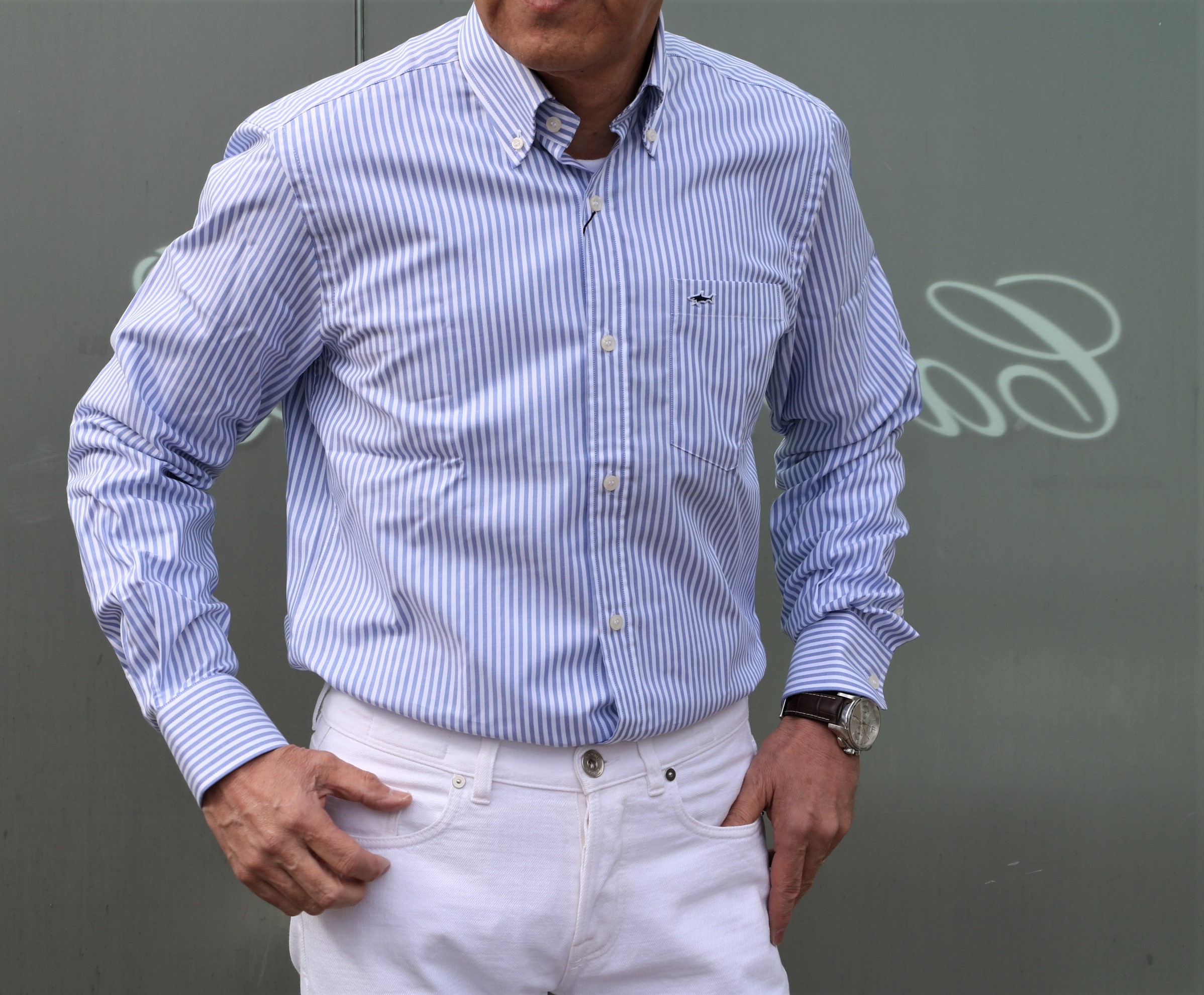 オックスフォードクロスのロンドンストライプ柄シャツは、ポケット付き、前立てありのボタンダウンカラーと、ゆとりのあるボディも含め、下着として作られるナポリシャツとは違い、ワークウェアの要素がふんだんに盛り込まれています。