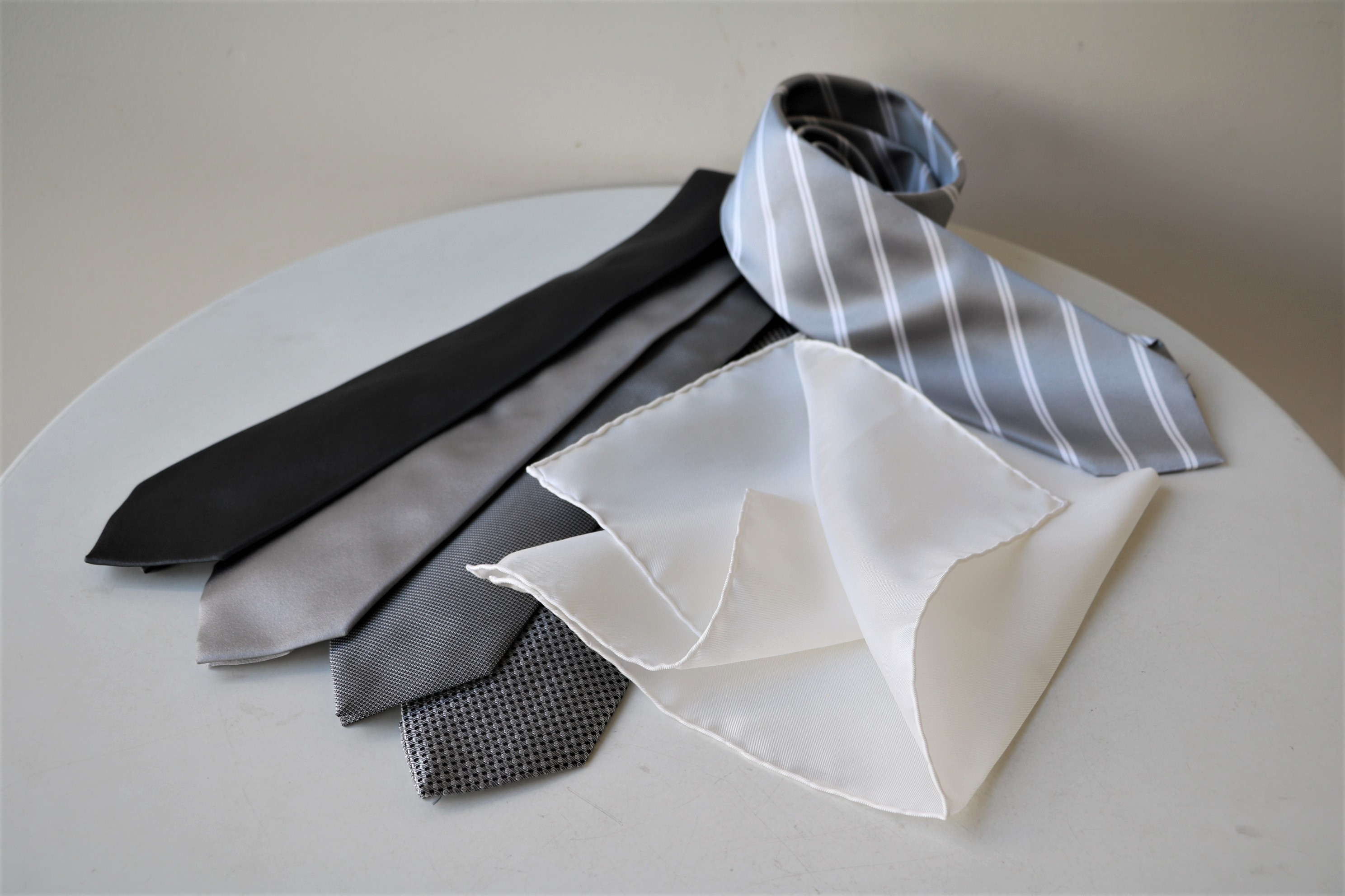 上からプリントのストライプ、小柄のオールオーバー、サテンソリッド。全てシルクです。ブラックスーツに限定せずに濃いグレイのスーツに合わせても素敵です。