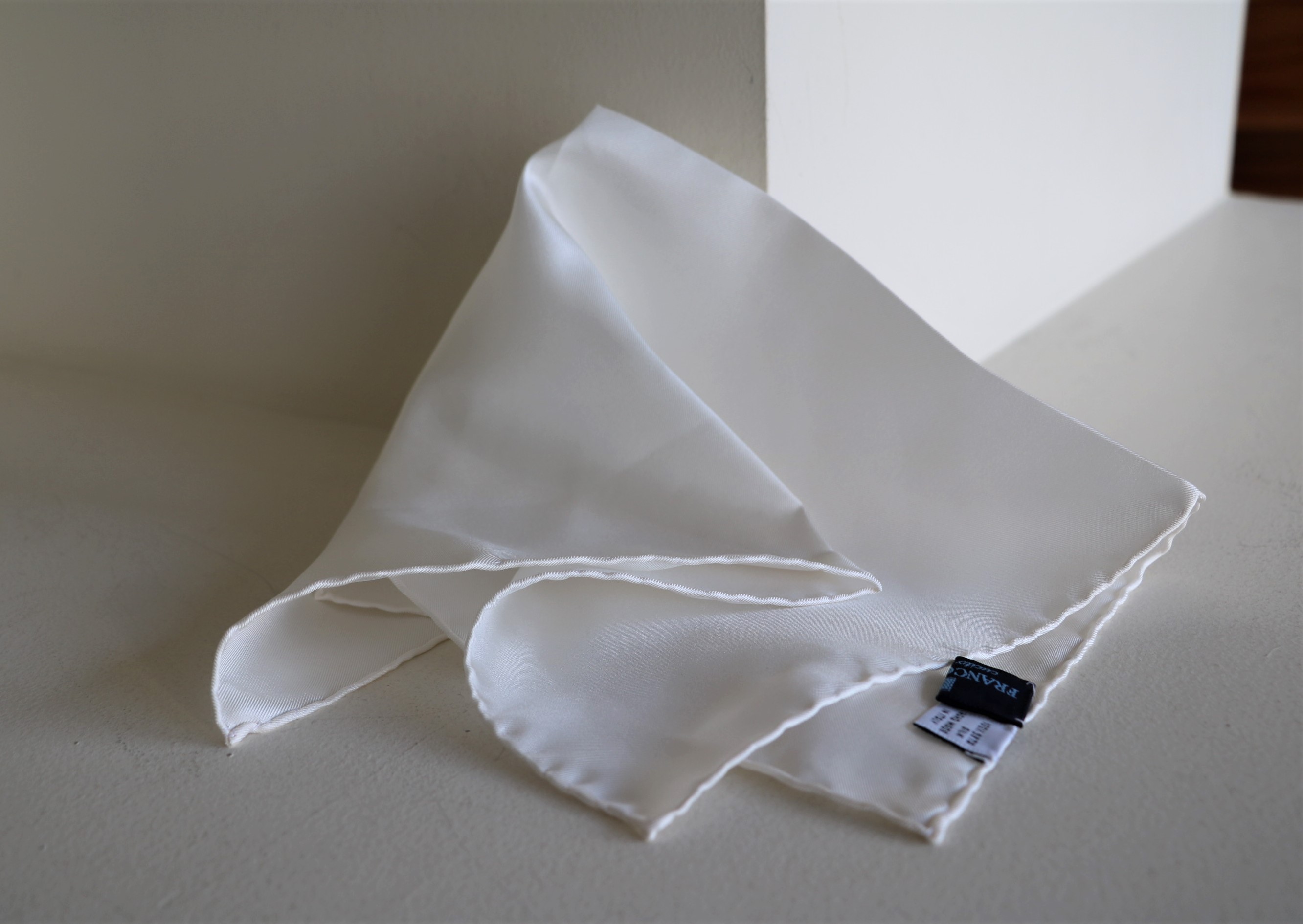オケージョンには必需品のポケットチーフ。リネンではなくシルクでご用意しました。スクエアに折って挿しますが、多少の演出も良いでしょう。葬儀などの弔事には使わない...記すまでもありませんね。