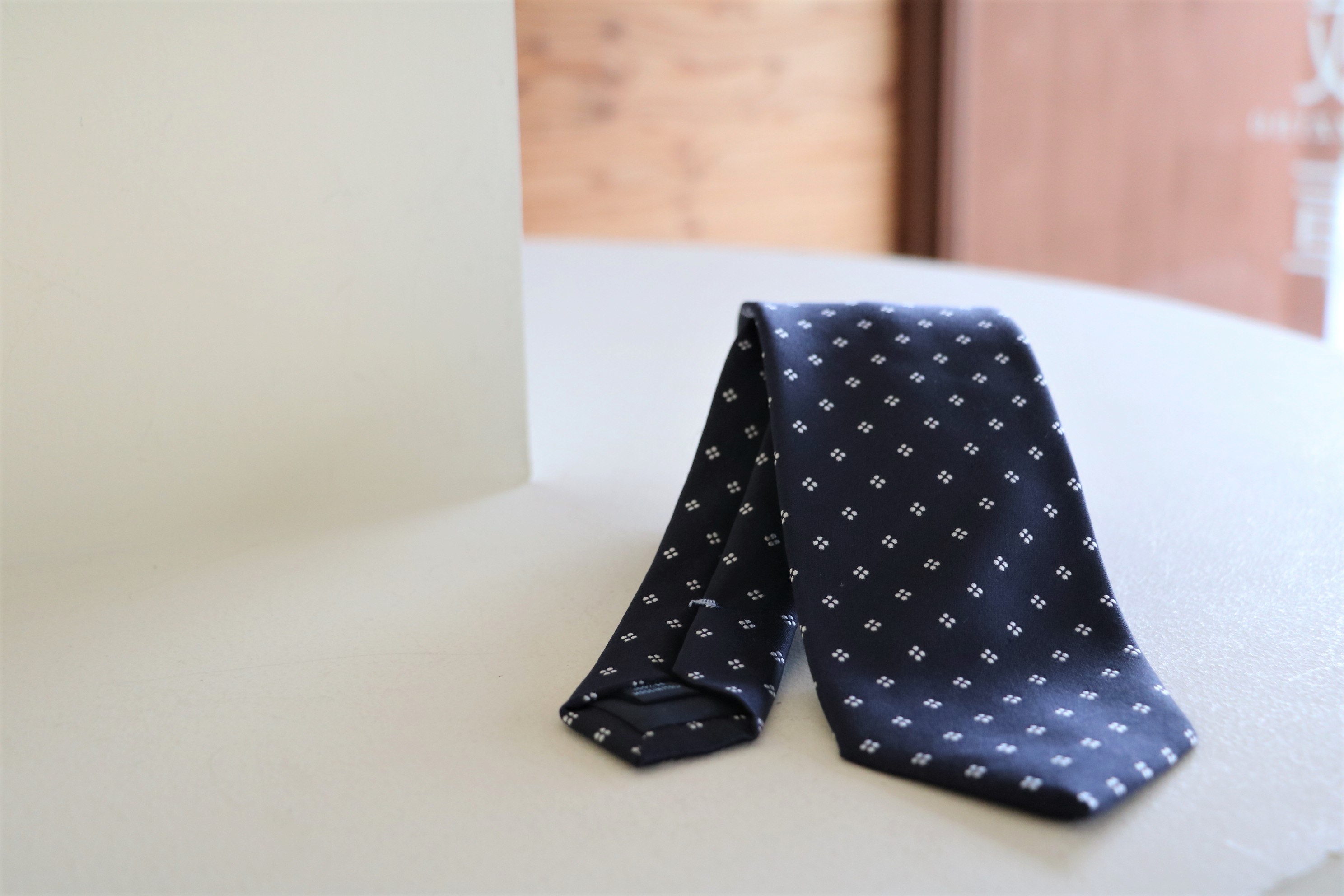 今季、お勧めのネイビーベースに白柄を配したクラシックタイ。無地に比べ、Vゾーンを明るく、華やかに演出します。