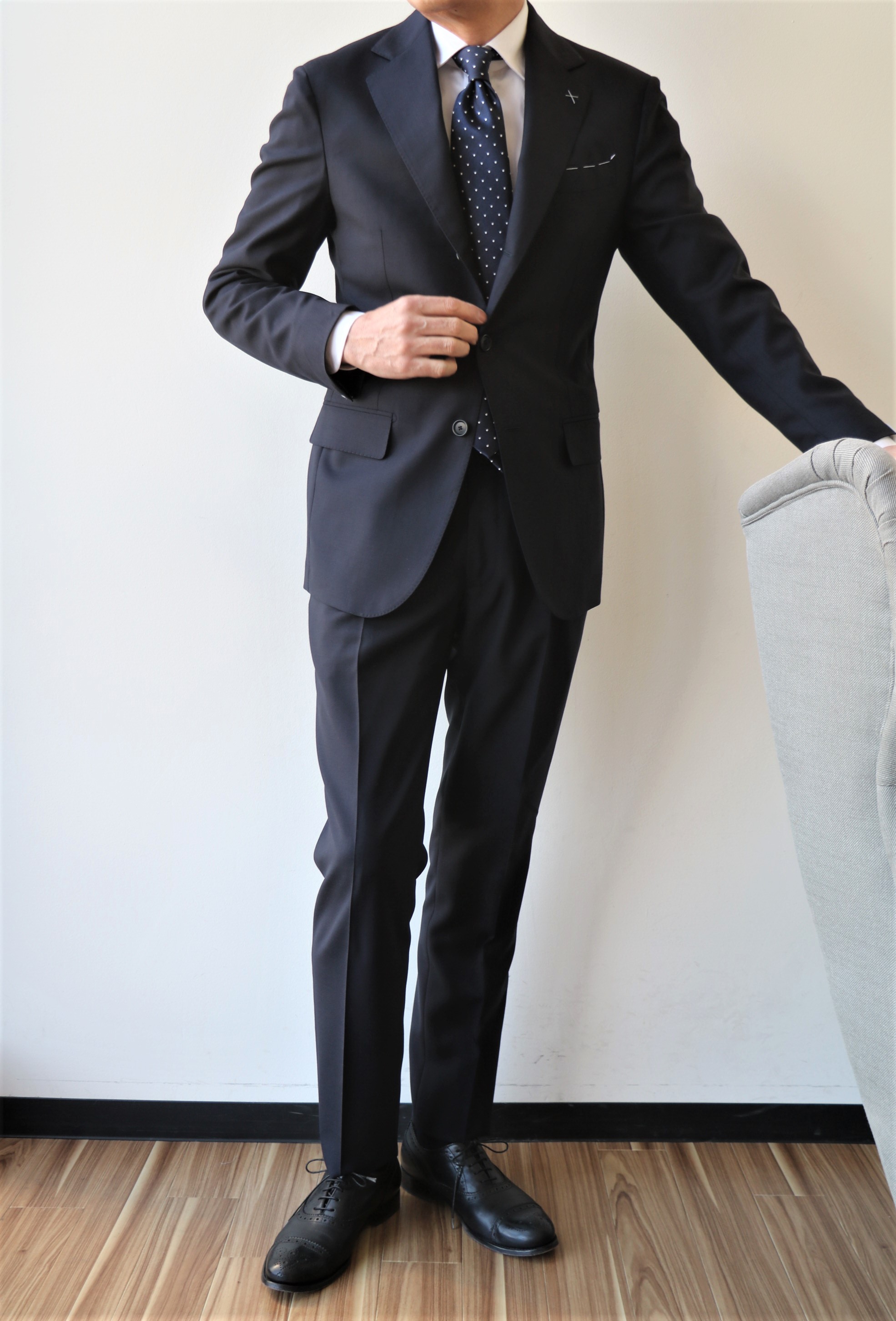 そして、ネイビー。上のチャコールグレイの色違いではありません。他に生地を探していたら、"こんなんあります"と紹介されたのが、Loro piana(ロロ・ピアーナ)の「ZELANDER DREAM」。深みのある、艶っぽい青です。