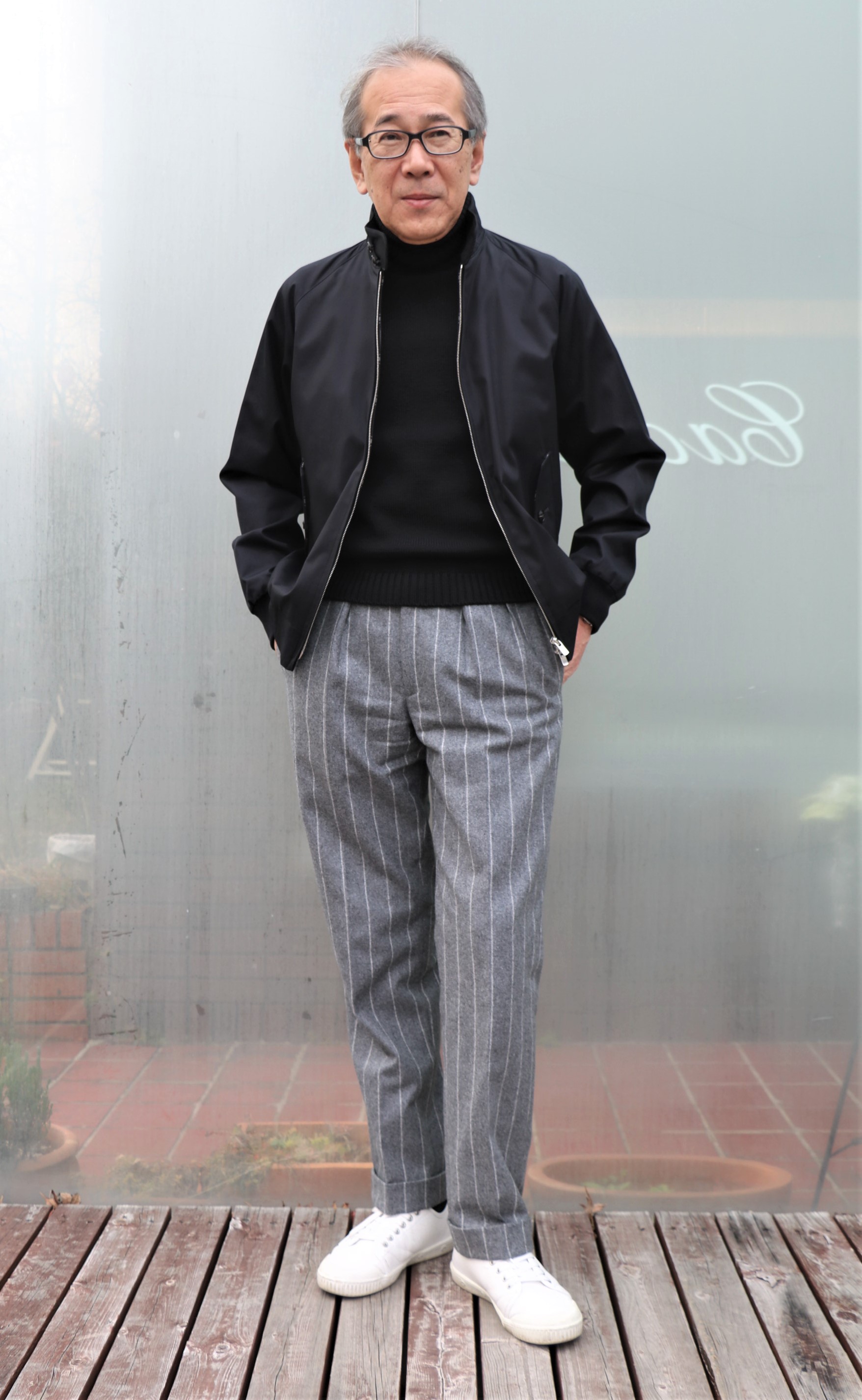 初体験のBERNARD ZINS(ベルナールザンス)。遂に足を入れてしまいました。何度となく、展示会のオファーを頂きながら、まだまだ機は熟していないと躊躇っているうちに、あっさりジュニアに押し切られてしまいました。丁度、タイミングよく代理店も変わったことでもあり、即座にオーダーです。ただ、残念なことに展開場所は、ここグローリーガイではなく、隠れ場カシェート。"手上げたもん勝ち"とは、このことを言うんでしょうね。購入したのは、ワイドテーパード「BAC J」。ほんのりテーパードした、どちらかと言えば、ストレートに近いシルエットです。これを選んだ理由を聞いてください。20代の時、ラルフローレンでよく似たシルエットのパンツを購入。売り場で穿いている時に必ず褒められるんです。いわゆる、モテパンツ。理由は、それだけ?いやいや、驚くほどの気持ち良いホールド感。サイズ38でヒップはジャスト。ただウエストがややきつく2.5㎝ほど広げて穿いております。You Tube "俺を信じろ! Spring Court" で穿いておりますので、ぜひご覧いただければと思います。