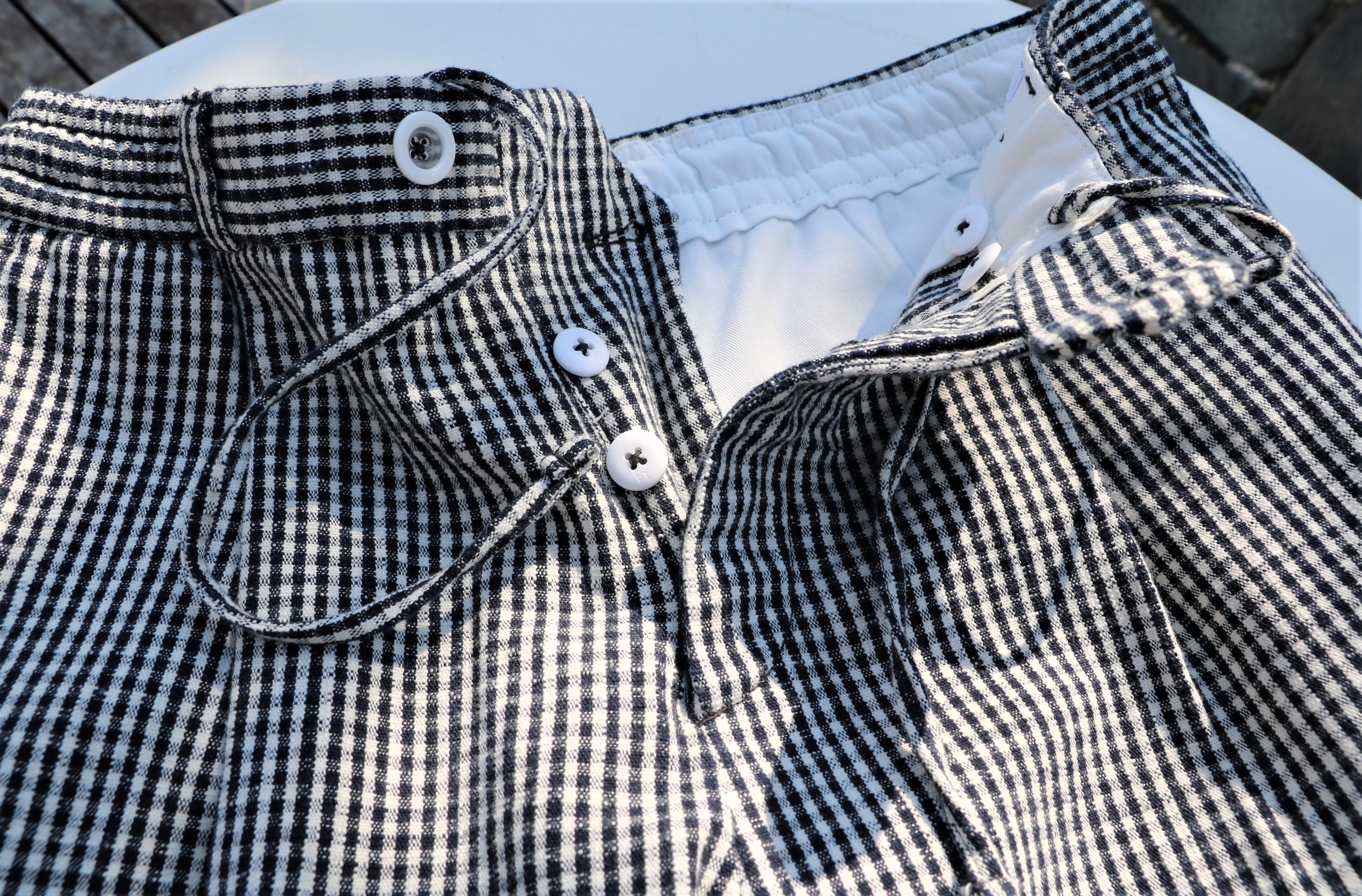 裾の仕上がりは、4.5㎝幅のタタキ縫い仕上げ。縫い付けずに折り返してあるだけですので、股下に自信のある方は、伸ばしてやってください。そうすれば、