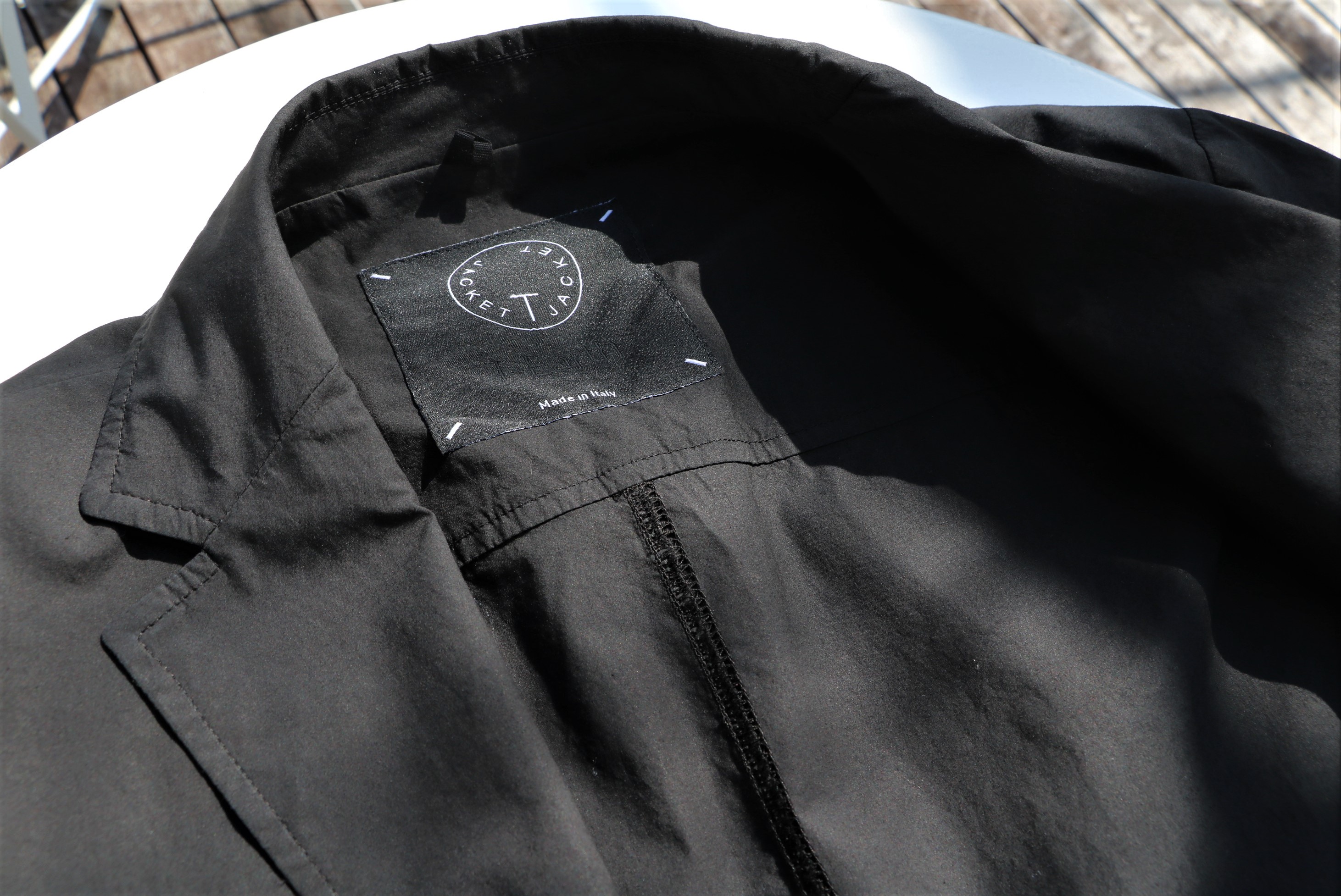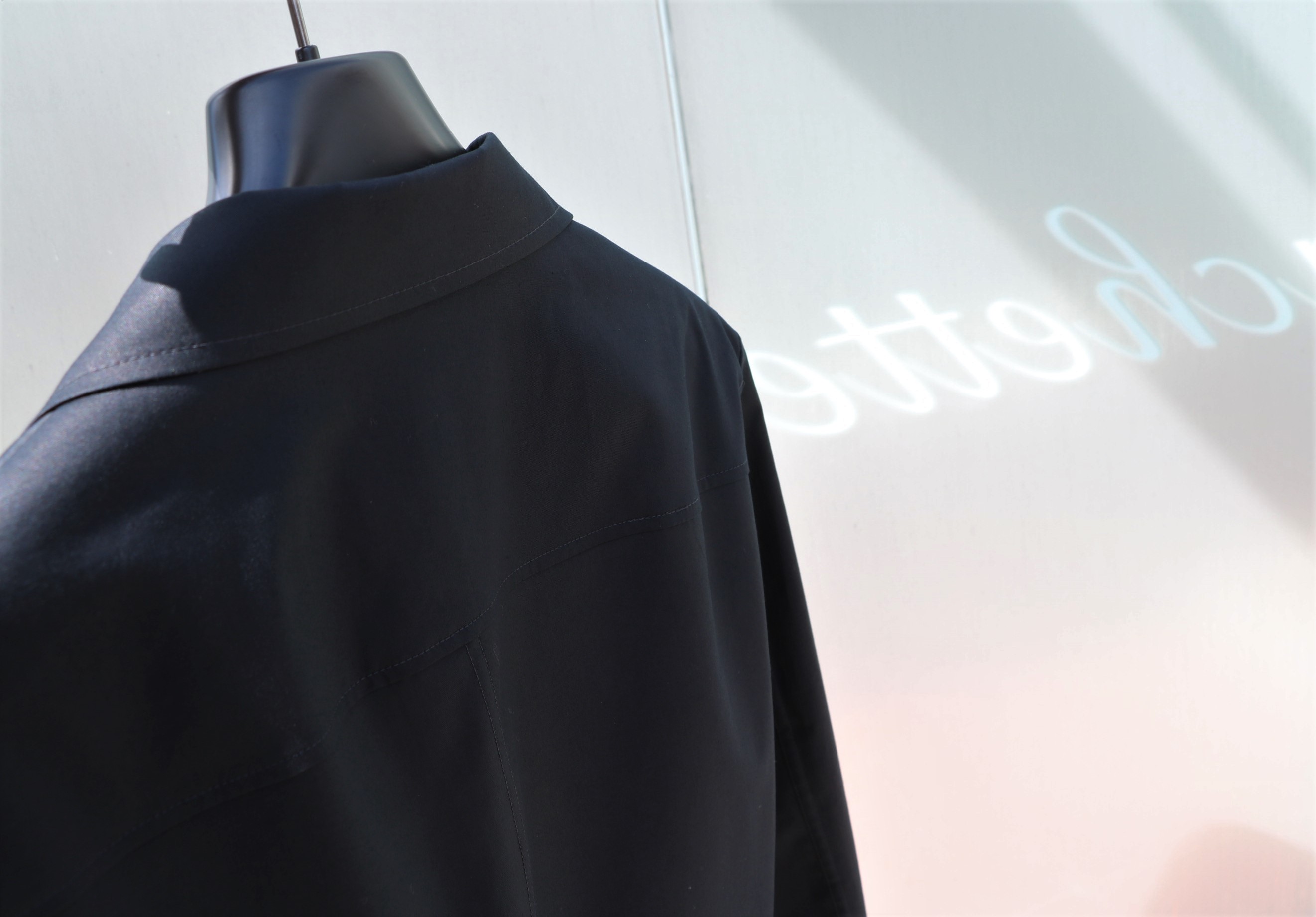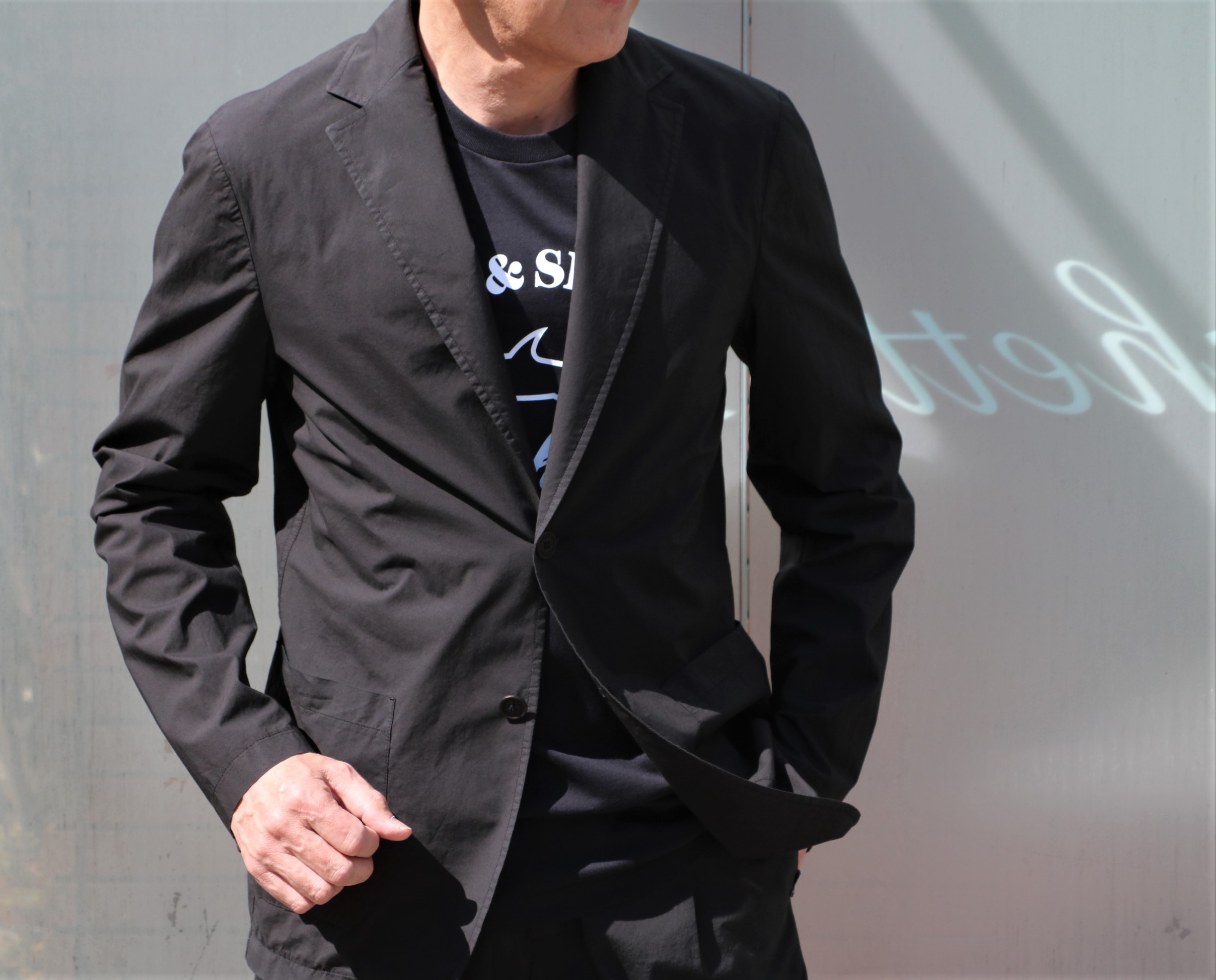 先にご案内させていただいたセットアップよりも生地にハリのあるジャケットです。素材はコットン・テンセル・ポリウレタンのクリーンな表情をもち、光に当たる眩しい光沢感が季節を呼び込みます。ブラックに見えましたが、表記はBLU。限りなくブラックに近いミッドナイトブルーとしましょう。