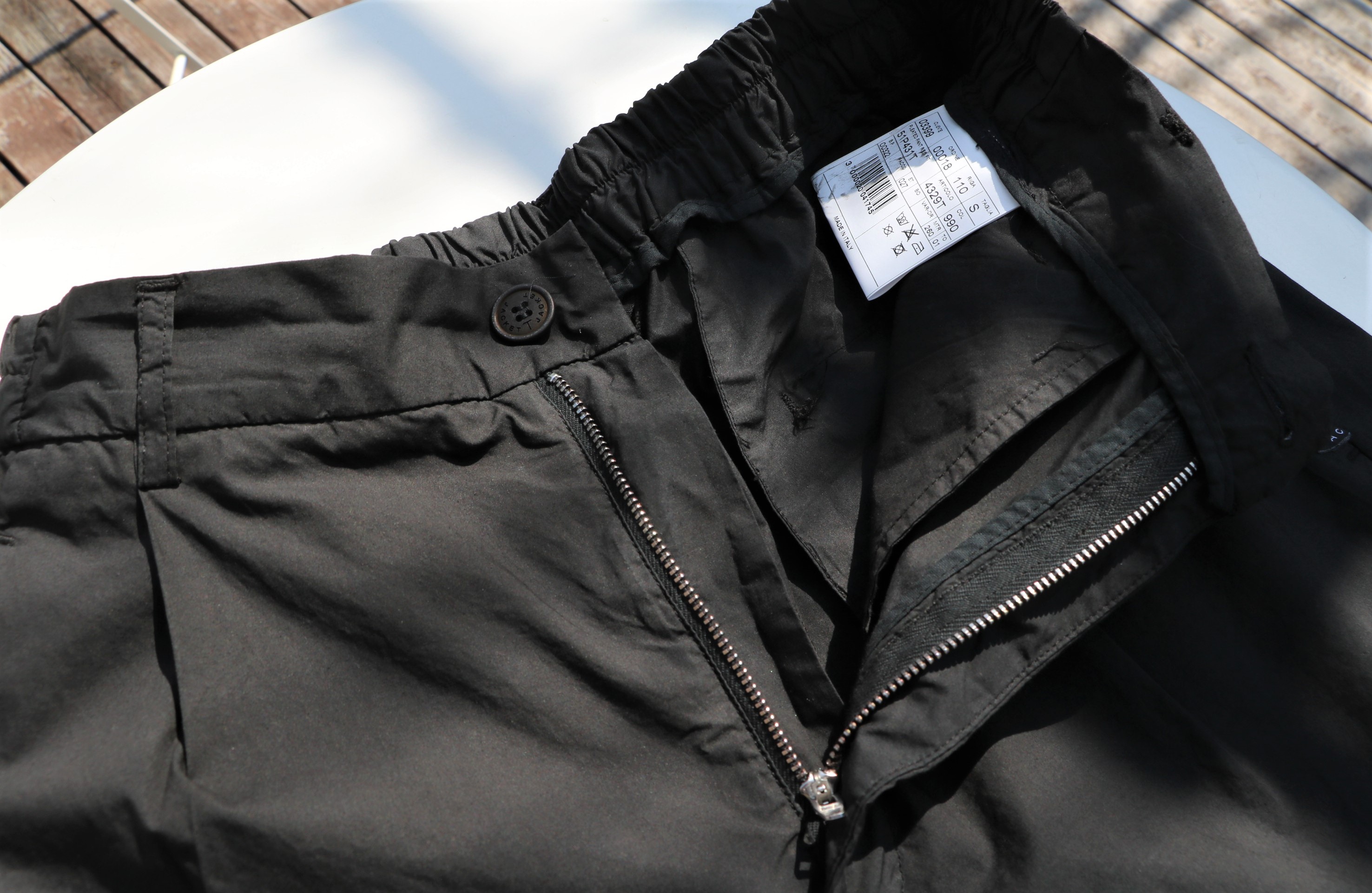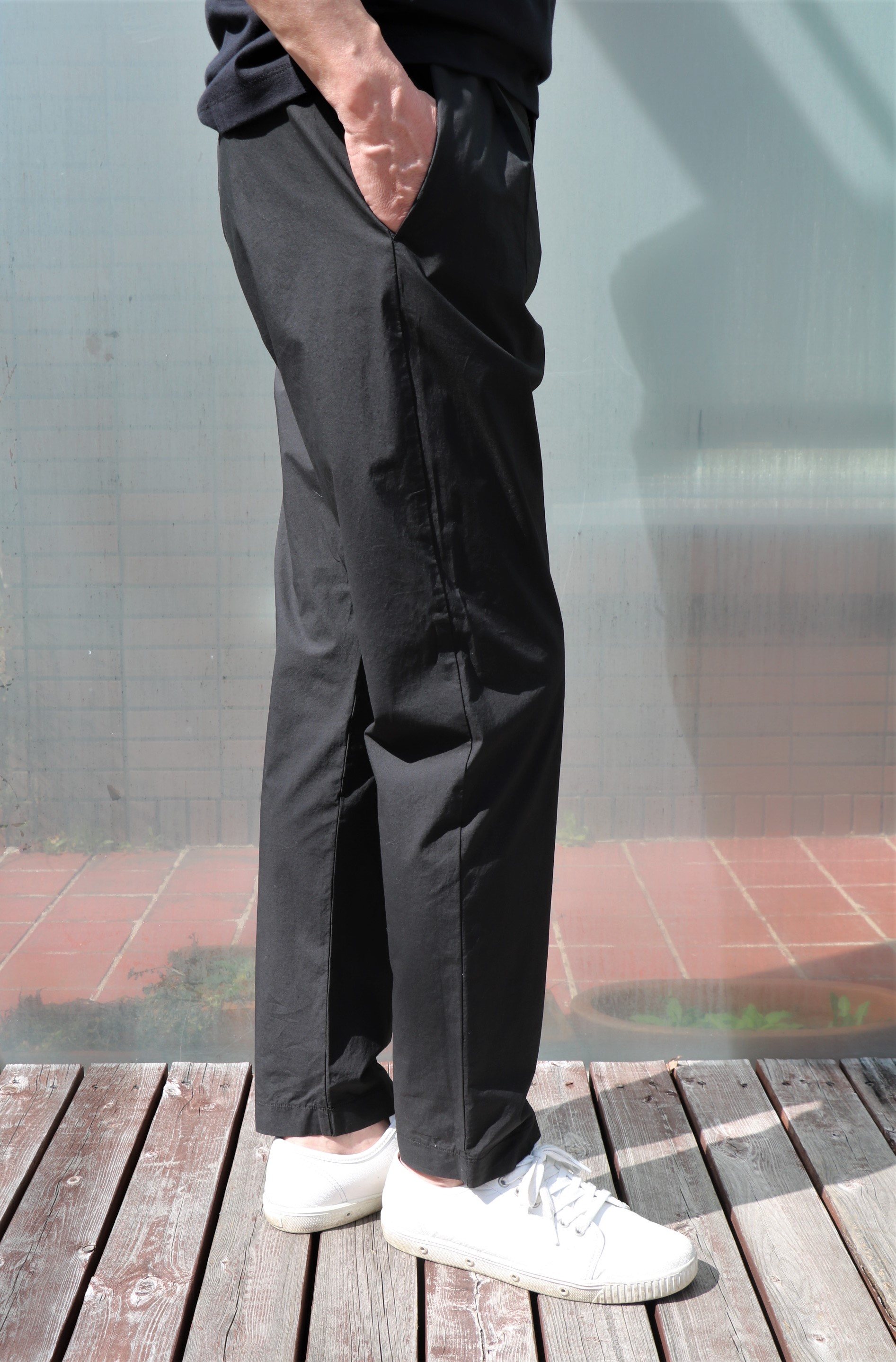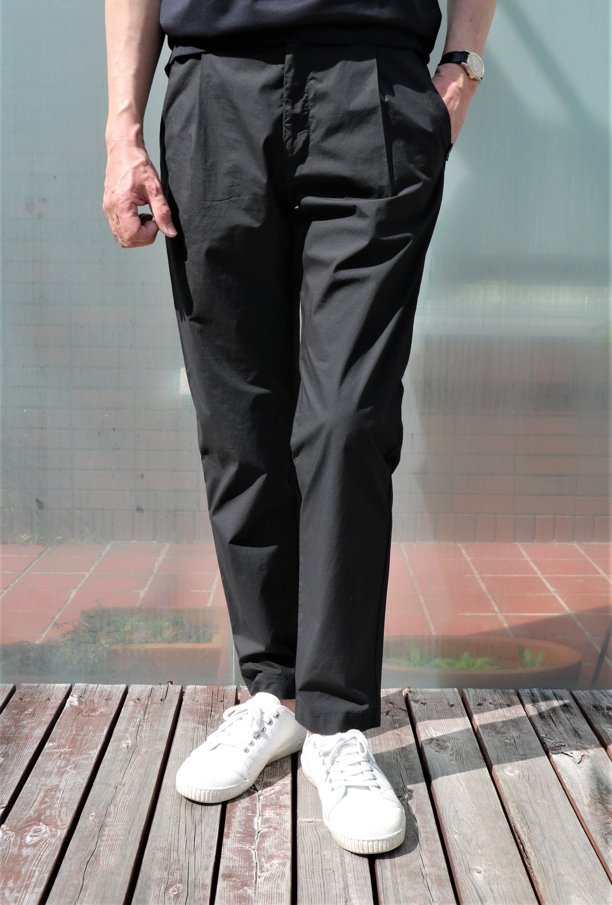ドローコード無のバックシャーリングパンツは、気楽です。軽い穿き心地はノンストレス。ただプリーツのせいでしょうか、フォルムにイージー過ぎない、そこはかとない端正さやエレガントさを垣間見ることができるのは、ブランド背景にイタリアの重衣料ブランド「TONELLO/トネッロ」の存在があるからかもしれません。