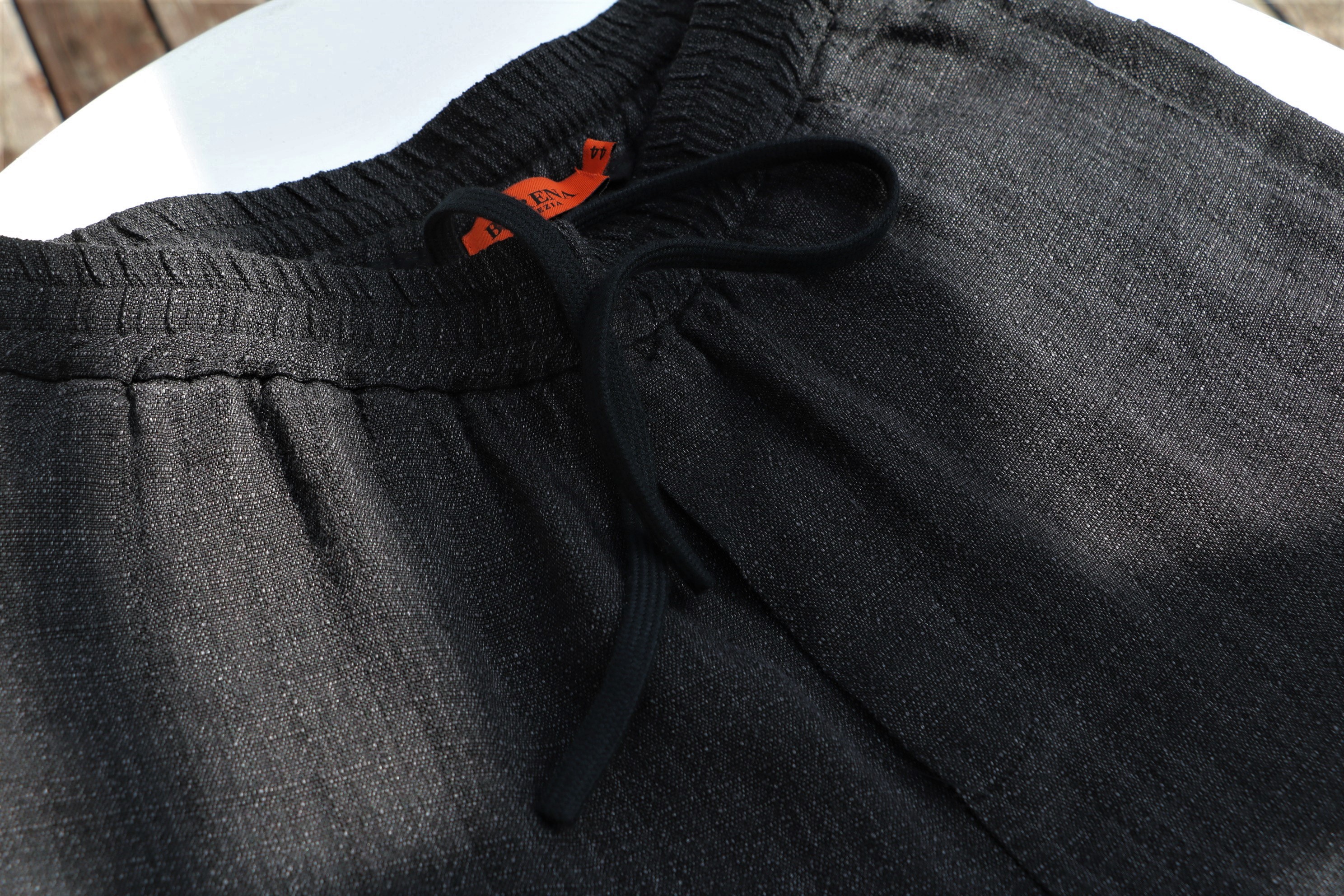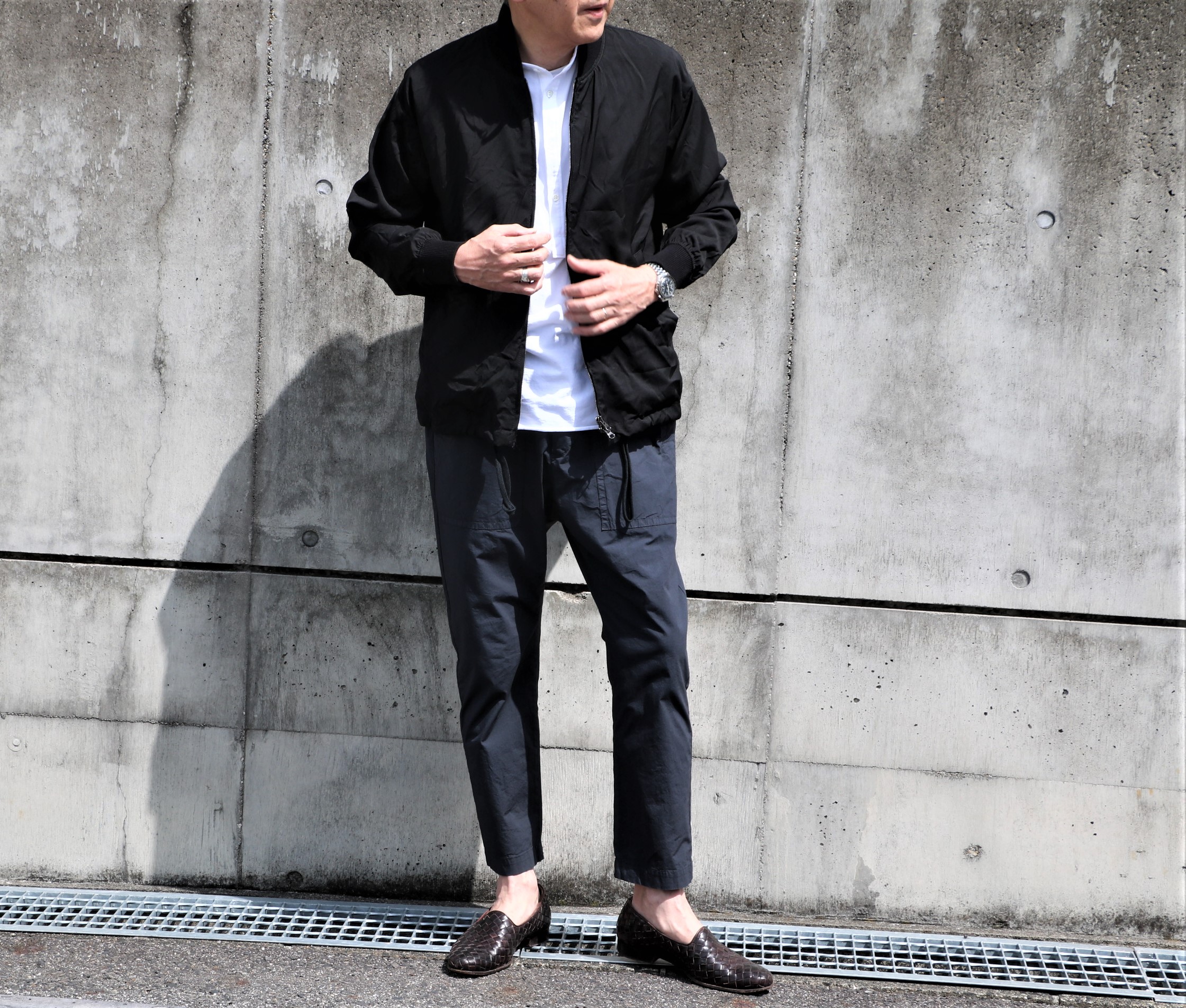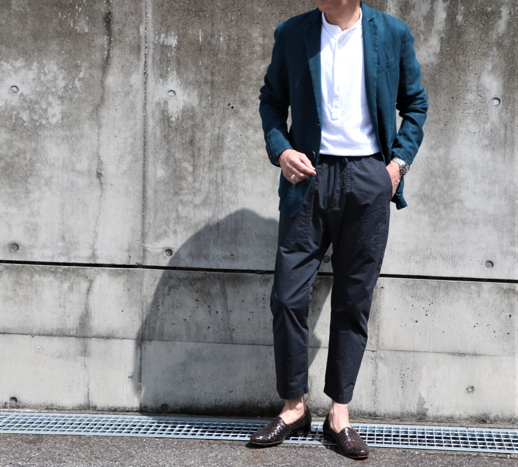 トップスを有効に見せているのは、スウェットパンツ仕様のコットンストレッチパンツです。薄手のハリコシのあるコットンポプリン地は、軽やかな穿き心地を体感できるとともに、緩いパンツにありがちなだらしなさをカバー。炭黒がかった深みのあるネイビーもバレナの特徴で絶妙な色合いが、他の合わせる色を吸収し、全体を上品にまとめ上げます。