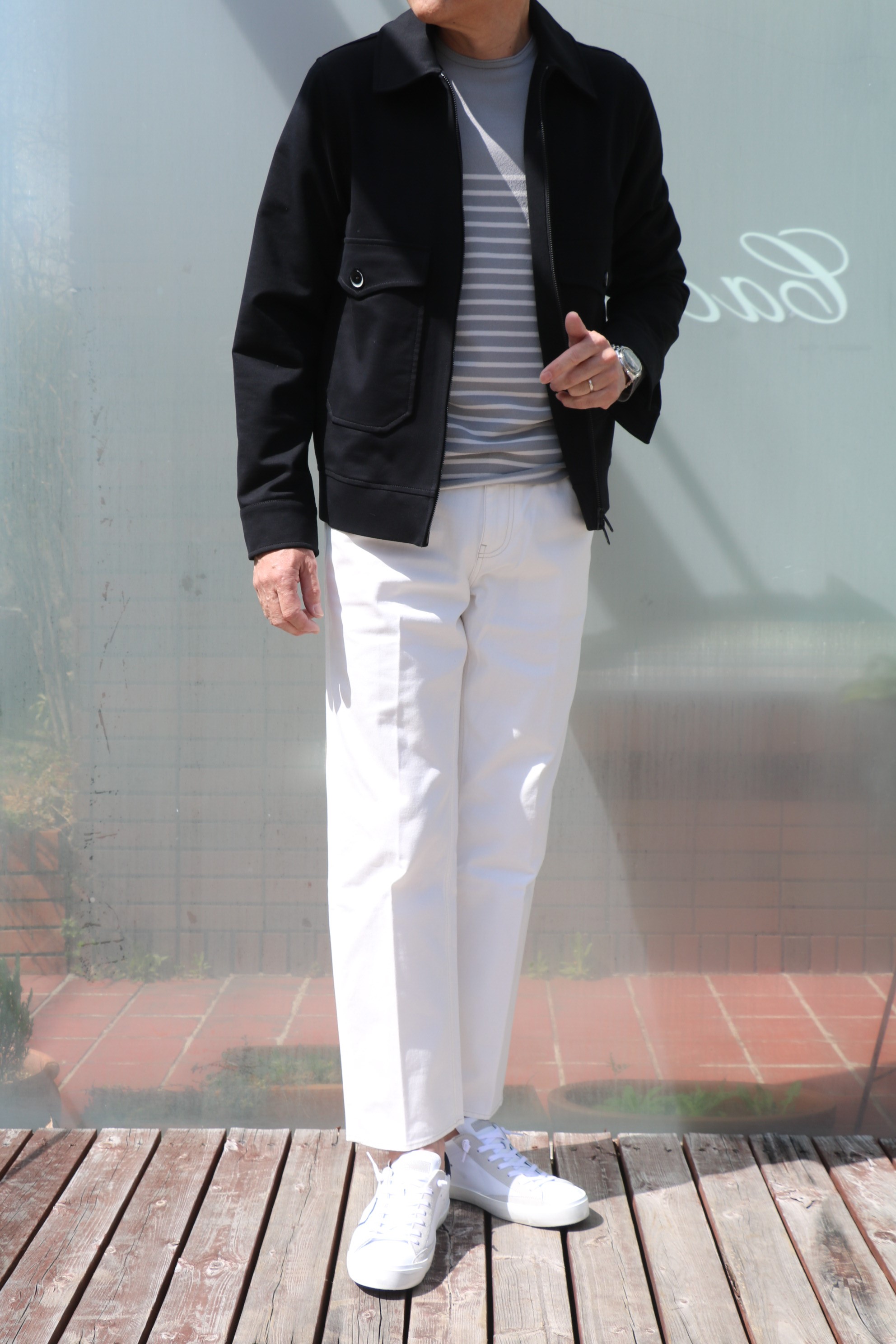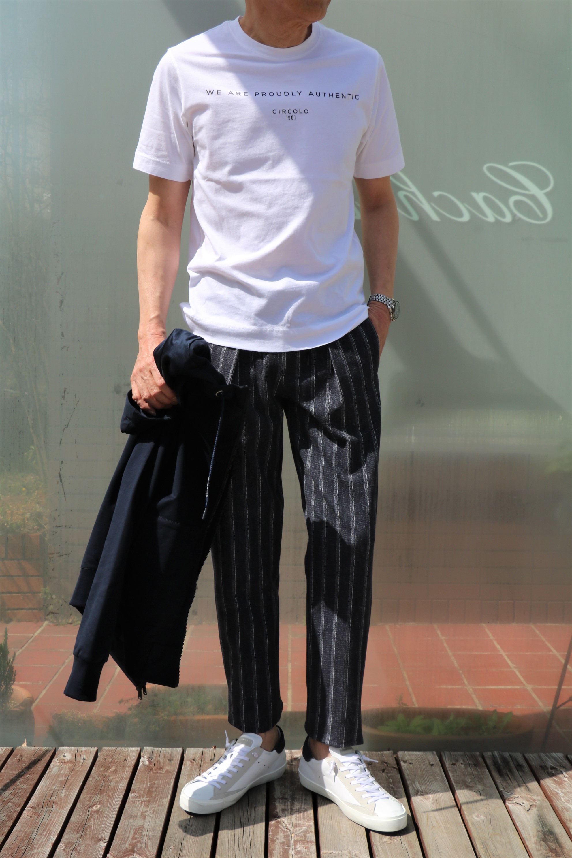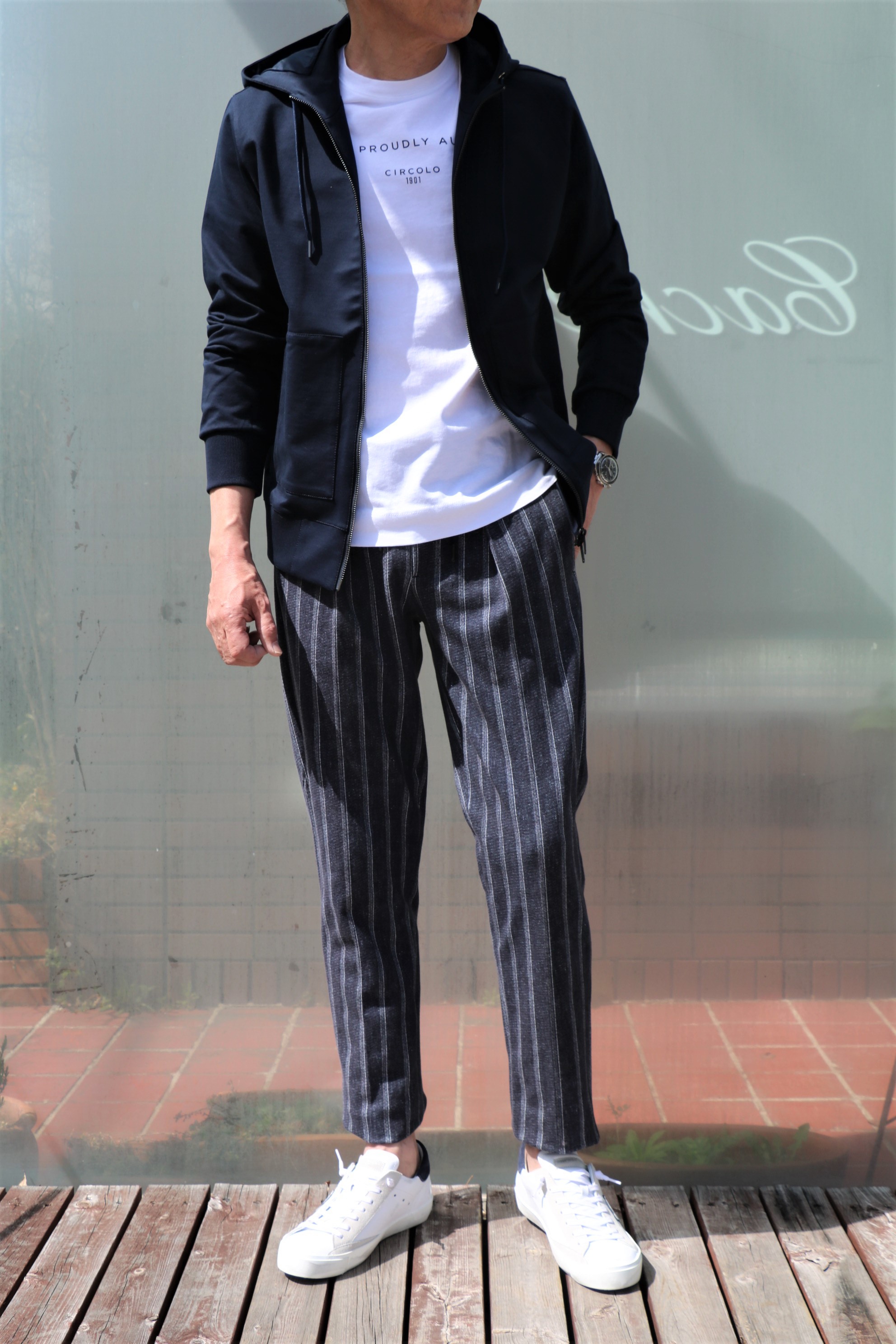 インに合わせたのは、着心地抜群のPHIL PETTER(フィルペター)のボーダーニット、パンツはライトな穿き心地が魅力のPence(ペンス)、靴は最近になって気になっているPHILIPPE MODEL(フィリップ モデル)を履いております。