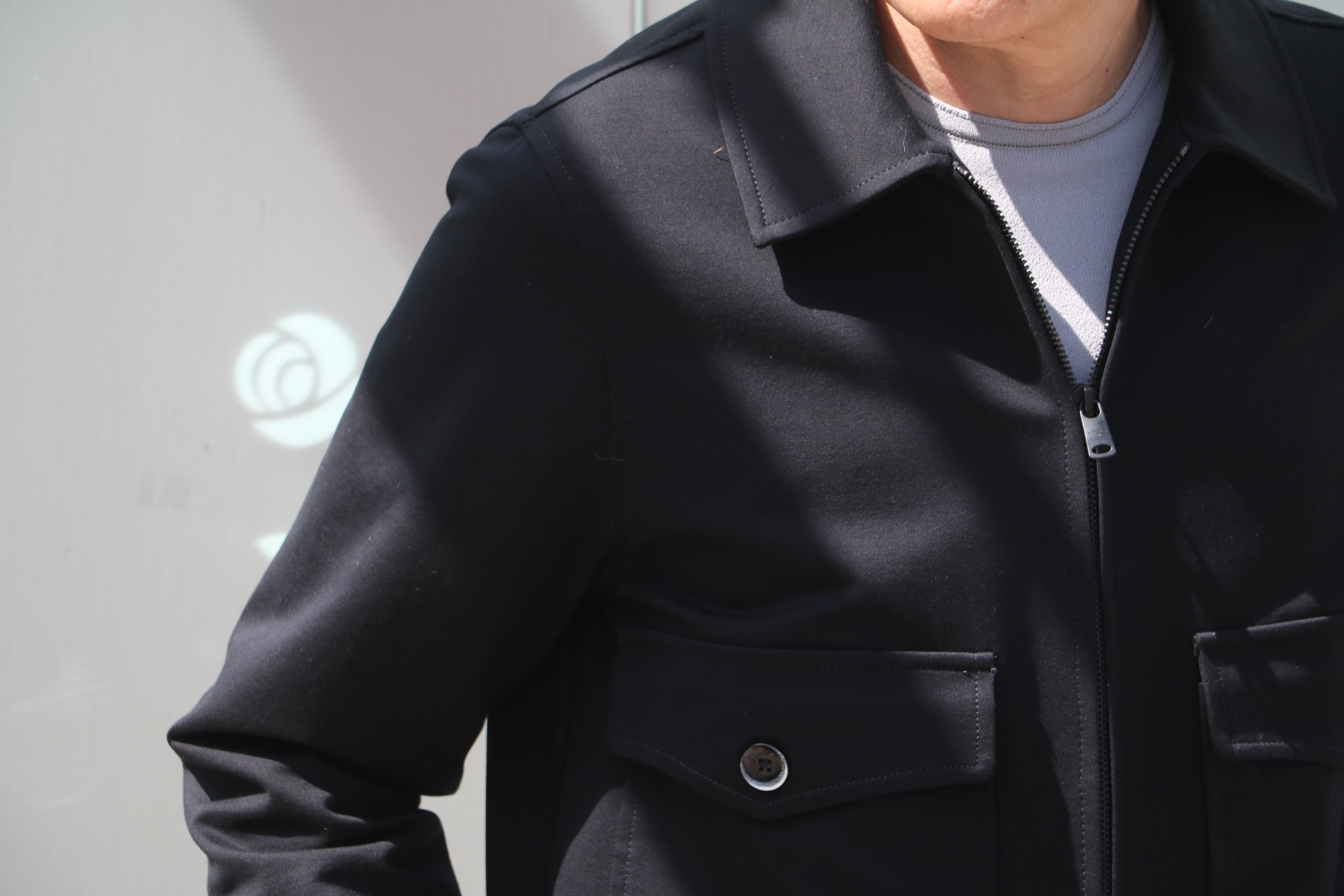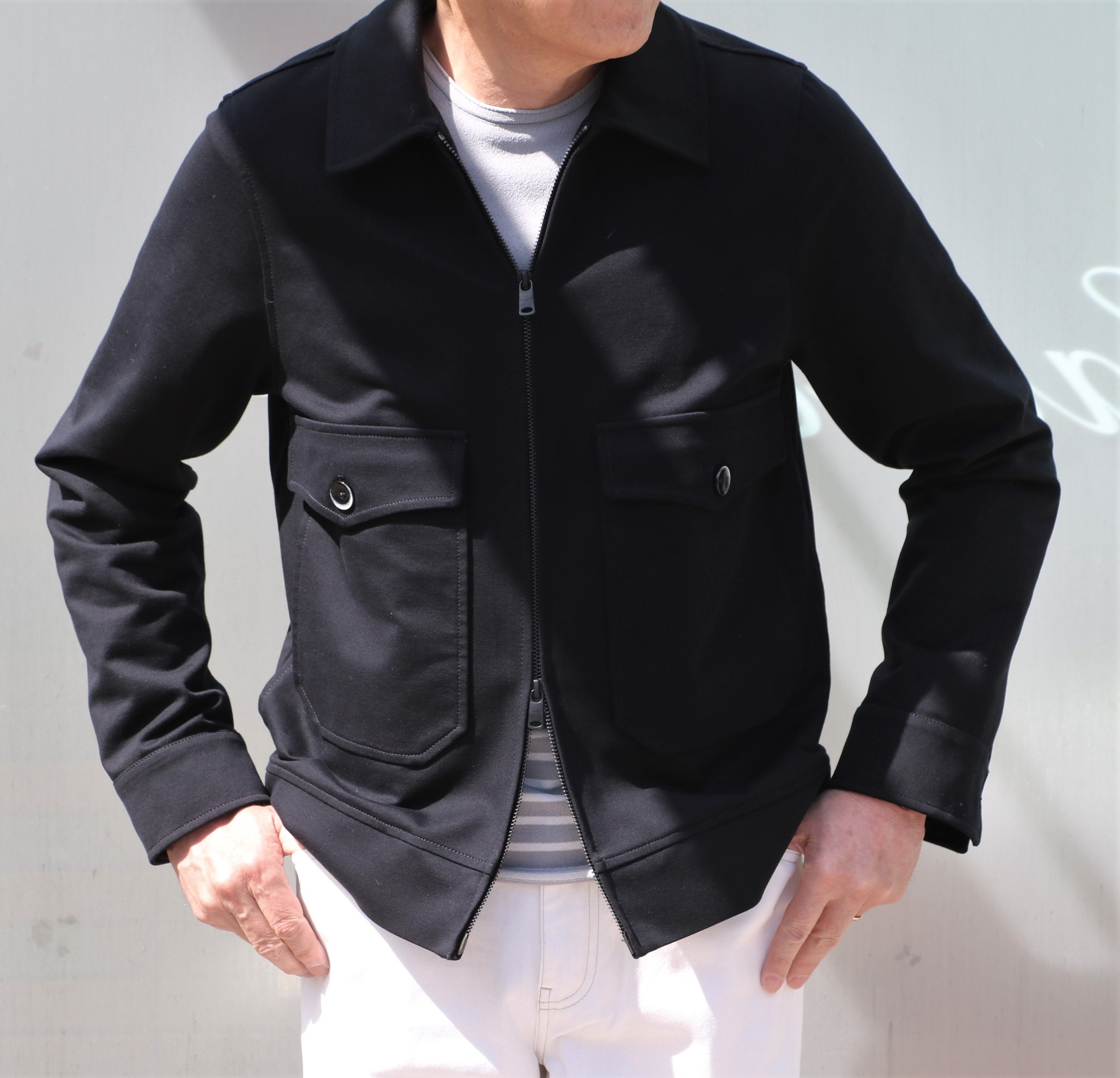 Gジャンに似て非なるコットンジャージのブルゾン。ワークウェアをベースにモダンにデザインされています。素材は、先にご紹介のパーカーと同じコットンジャージ。このモデルは、ブラックでセレクトです。![]()